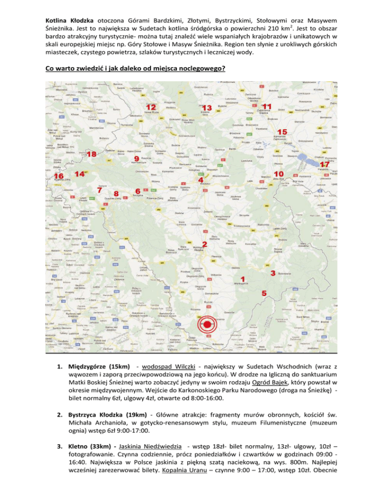 Kotlina Kłodzka otoczona Górami Bardzkimi, Złotymi, Bystrzyckimi, Stołowymi oraz Masywem Śnieżnika. Jest to największa w Sudetach kotlina śródgórska o powierzchni 210 km 2. Jest to obszar bardzo atrakcyjny turystycznie- można tutaj znaleźd wiele wspaniałych krajobrazów i unikatowych w skali europejskiej miejsc np. Góry Stołowe i Masyw Śnieżnika. Region ten słynie z urokliwych górskich miasteczek, czystego powietrza, szlaków turystycznych i leczniczej wody. Co warto zwiedzid i jak daleko od miejsca noclegowego? 1. Międzygórze (15km) - wodospad Wilczki - największy w Sudetach Wschodnich (wraz z wąwozem i zaporą przeciwpowodziową na jego koocu). W drodze na Igliczną do sanktuarium Matki Boskiej Śnieżnej warto zobaczyd jedyny w swoim rodzaju Ogród Bajek, który powstał w okresie międzywojennym. Wejście do Karkonoskiego Parku Narodowego (droga na Śnieżkę) bilet normalny 6zł, ulgowy 4zł, otwarte od 8:00-16:00. 2. Bystrzyca Kłodzka (19km) - Główne atrakcje: fragmenty murów obronnych, kościół św. Michała Archanioła, w gotycko-renesansowym stylu, muzeum Filumenistyczne (muzeum ognia) wstęp 6zł 9:00-17:00. 3. Kletno (33km) - Jaskinia Niedźwiedzia - wstęp 18zł- bilet normalny, 13zł- ulgowy, 10zł – fotografowanie. Czynna codziennie, prócz poniedziałków i czwartków w godzinach 09:00 16:40. Największa w Polsce jaskinia z piękną szatą naciekową, na wys. 800m. Najlepiej wcześniej zarezerwowad bilety. Kopalnia Uranu – czynne 9:00 – 17:00, wstęp 10zł. Obecnie udostępniona do zwiedzania jest sztolnia nr 18 - przy drodze łączącej Kletno z Sienną. Trasa obejmuje około 200 m wyrobisk. 4. Kłodzko (34km) - Twierdza Kłodzka – (10zł wejście do labiryntu 10:00-18:00) olbrzymia budowla obronna górująca nad miastem oraz poprzez sied chodników również i pod miastem. Występowała zresztą w jednym z odcinków "4 pancerych i pies" :) Poza tym warte zobaczenia są: Kościół Wniebowzięcia NMP, staromiejski rynek (zwłaszcza ratusz), kamienny most gotycki św. Jana przypominający Most Karola w Pradze. 5. Śnieżnik (40km) 1425 m - szlaki z Kletna k. Stronia Śląskiego i Międzygórza. Masyw Śnieżnika jest centralnym punktem, od którego we wszystkie strony rozchodzą się grzbiety górskie. Kopuła szczytowa leży powyżej górnej granicy lasu i jest doskonałym miejscem widokowym. Poniżej na Hali pod Śnieżnikiem duże schronisko górskie. 6. Szczytna (43km) - zamek Na Szczytniku (589 m) neogotycki z XIX wieku. W pobliżu znajduje się kamienna Droga Krzyżowa z płaskorzeźbami z piaskowca osadzonymi w naturalnych skałach 7. Błedne Skały (43km) –(Park Narodowy Gór Stołowych) również znane jak Szczeliniec Wielki, skalny labirynt obejmujący grzbiet Skalniaka (915 m) wyrzeźbiony w piaskowcach, różniący się jednak formą skalną. Droga prowadzi wyżłobieniami w skałach, często bardzo wąskimi. Do skał można dojechad samochodem. 8. Duszniki Zdrój (48km) - znana miejscowośd uzdrowiskowa z zabytkową częścią miejską oraz starym miastem. Warto odwiedzid Muzeum Papiernictwa i Młyn Papierniczy z 1605r, gdzie nadal odbywa się produkcja papieru czerpanego. 9. Wambierzyce (50km) - najciekawsza, a jednocześnie mało znana atrakcja to Skansen prowadzony przez Sołtysa. Przez ponad 30 lat zgromadził on duży zbiór historycznych eksponatów, maszyn rolniczych, urządzeo domowych, historyczne wyposażenie kuźni, zakładów szewskich, ciesielskich i wielu innych. Poza tym mini-zoo ze strusiami, jeleniami, dzikimi świniami, pstrągami, itp. Bazylika Nawiedzenia NMP - pochodząca z XVII-XVIII w renesansowo to wizytówka Wambierzyc. Oprócz tego Kalwaria wambierzycka składająca się ze 150 kaplic oraz największa ruchoma szopka. Ratno -Średniowieczny zamek malownicza budowla niedaleko Wambierzyc. Wzniesiony w XIV w. Obecnie zamek jest niezagospodarowany, ale mimo to jest atrakcyjny do zwiedzania. Można przejśd się po położonych na stromym zboczu pięknych tarasach ogrodowych, oranżerii, czy parku pałacowym. 10. Złoty Stok (52km) - Kopalnia Złota - Bilet normalny 10 zł (9.00-18.00). Podziemne Muzeum Górnictwa i Hutnictwa (w Złotym Jarze) z unikalną kolekcją map górniczych (www.kopalniazlota.pl ), stary młyn prochowy, oraz kościoły: poewangelicki kościół Zbawiciela z XV wieku, kościół parafialny Niepokalanego Poczęcia NMP. 11. Ząbkowice Śląskie (57km) - fragmenty murów obronnych, neogotycki ratusz z drugiej połowy XIX wieku, Krzywa Wieża z XIV wieku, zespół dawnego klasztoru Dominikanów, dwór opatów henrykowskich z początku XVIII wieku, obecnie klasztor Boromeuszek. 12. Nowa Ruda (59km) - Muzeum Górnictwa - Podziemna Trasa Turystyczna (jeżdżąca podziemna kolejka). Warty zobaczenia jest również dawny zamek z XV wieku, obecnie popadający niestety w ruinę. Poza tym kościoły: neogotycki św. Mikołaja; barokowy Podwyższenia Krzyża; Wniebowzięcia NMP; kościół św. Barbary; kościół św. Katrzyny; barokowa kaplica Loretaoska z XVIII/XIX wieku, oraz barokowy klasztor Salezjanek z 1630 roku. Ciekawy architektonicznie jest również ratusz z 1884 roku. 13. Srebrna Góra (59km) - Forty - potężne fortyfikacje zbudowane w latach 1765-77 za czasów Fryderyka Wielkiego. Częściowo udostępnione do zwiedzania są olbrzymią atrakcją. 14. Droga "Stu Zakrętów" (62km) - biegnie przez obszar Gór Stołowych, prowadzi z Radkowa do Kudowy Zdrój. Jadąc tą szosą mamy możliwośd zobaczyd mnóstwo ciekawych form skalnych, z których najbardziej charakterystyczne są tzw. Grzyby Skalne. Są to grzyby, młoty, maczugi, baszty itp. wyrzeźbione ze skał w wyniku erozji. 15. Kamieniec Ząbkowicki (62km) - na Zamkowej Górze znajdują się ruiny neogotyckiego zespołu pałacowego wraz z kościołem, mauzoleum, stajniami, wozowniami z XIX w. Jest to największy neogotycki pałac w Europie. 16. Kudowa Zdrój (62km) - znana miejscowośd uzdrowiskowa - Park Zdrojowy, budynek pi