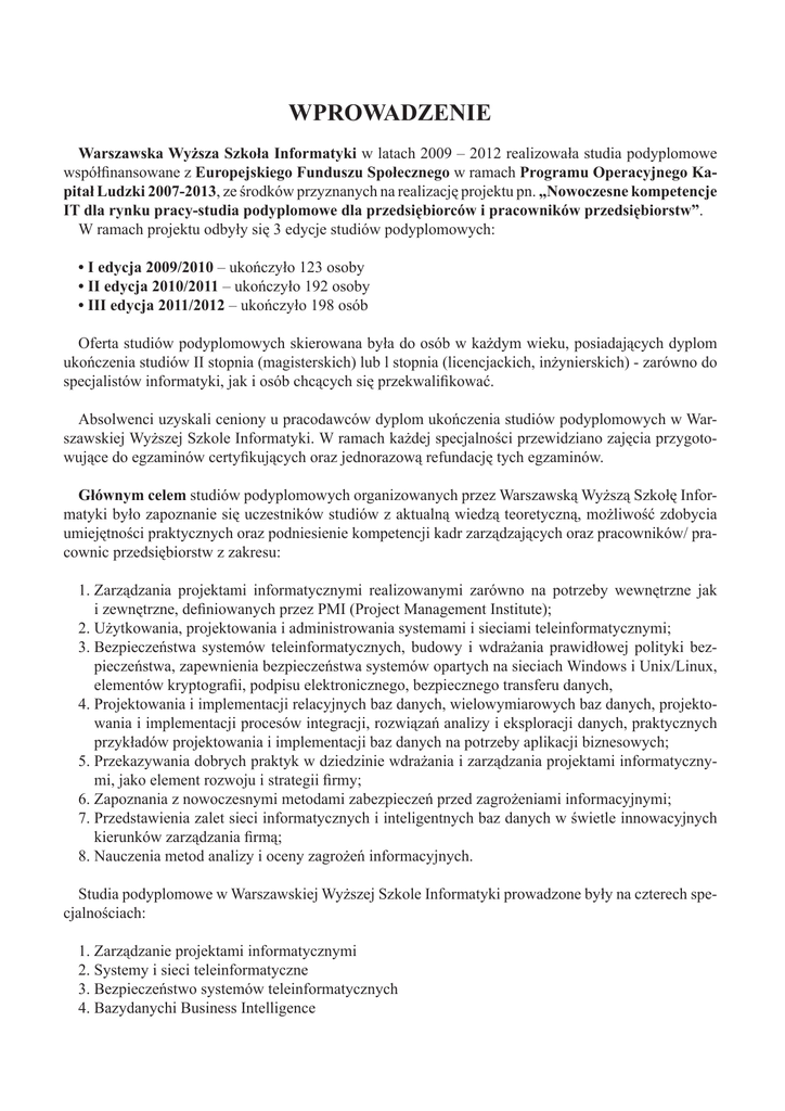 WPROWADZENIE Warszawska Wyższa Szkoła Informatyki w latach 2009 – 2012 realizowała studia podyplomowe współfinansowane z Europejskiego Funduszu Społecznego w ramach Programu Operacyjnego Kapitał Ludzki 2007-2013, ze środków przyznanych na realizację projektu pn. „Nowoczesne kompetencje IT dla rynku pracy-studia podyplomowe dla przedsiębiorców i pracowników przedsiębiorstw”. W ramach projektu odbyły się 3 edycje studiów podyplomowych: • I edycja 2009/2010 – ukończyło 123 osoby • II edycja 2010/2011 – ukończyło 192 osoby • III edycja 2011/2012 – ukończyło 198 osób Oferta studiów podyplomowych skierowana była do osób w każdym wieku, posiadających dyplom ukończenia studiów II stopnia (magisterskich) lub l stopnia (licencjackich, inżynierskich) - zarówno do specjalistów informatyki, jak i osób chcących się przekwalifikować. Absolwenci uzyskali ceniony u pracodawców dyplom ukończenia studiów podyplomowych w Warszawskiej Wyższej Szkole Informatyki. W ramach każdej specjalności przewidziano zajęcia przygotowujące do egzaminów certyfikujących oraz jednorazową refundację tych egzaminów. Głównym celem studiów podyplomowych organizowanych przez Warszawską Wyższą Szkołę Informatyki było zapoznanie się uczestników studiów z aktualną wiedzą teoretyczną, możliwość zdobycia umiejętności praktycznych oraz podniesienie kompetencji kadr zarządzających oraz pracowników/ pracownic przedsiębiorstw z zakresu: 1. Zarządzania projektami informatycznymi realizowanymi zarówno na potrzeby wewnętrzne jak i zewnętrzne, definiowanych przez PMI (Project Management Institute); 2. Użytkowania, projektowania i administrowania systemami i sieciami teleinformatycznymi; 3. Bezpieczeństwa systemów teleinformatycznych, budowy i wdrażania prawidłowej polityki bezpieczeństwa, zapewnienia bezpieczeństwa systemów opartych na sieciach Windows i Unix/Linux, elementów kryptografii, podpisu elektronicznego, bezpiecznego transferu danych, 4. Projektowania i implementacji relacyjnych baz danych, wielowymiarowych baz danych, projektowania i implementacji procesów integracji, rozwiązań analizy i eksploracji danych, praktycznych przykładów projektowania i implementacji baz danych na potrzeby aplikacji biznesowych; 5. Przekazywania dobrych praktyk w dziedzinie wdrażania i zarządzania projektami informatycznymi, jako element rozwoju i strategii firmy; 6. Zapoznania z nowoczesnymi metodami zabezpieczeń przed zagrożeniami informacyjnymi; 7. Przedstawienia zalet sieci informatycznych i inteligentnych baz danych w świetle innowacyjnych kierunków zarządzania firmą; 8. Nauczenia metod analizy i oceny zagrożeń informacyjnych. Studia podyplomowe w Warszawskiej Wyższej Szkole Informatyki prowadzone były na czterech specjalnościach: 1. Zarządzanie projektami informatycznymi 2. Systemy i sieci teleinformatyczne 3. Bezpieczeństwo systemów teleinformatycznych 4. Bazydanychi Business Intelligence ZARZĄDZANIE PROJEKTAMI INFORMATYCZNYMI Oferta studiów skierowana była do kadry menedżerskiej pełniącej rolę: członków zespołów projektowych, komitetów sterujących, kierowników zespołów i projektów. Słuchaczami/czkami byli: pracownicy/ pracownice przedsiębiorstw i przedsiębiorcy zajmujący się działalnością: badawczo-rozwojową, marketingową, produkcyjną, organizacją dystrybucji, restrukturyzacją, wdrażaniem systemów zapewnienia jakości oraz inne osoby zainteresowane tą tematyką. W ramach specjalności zarządzanie projektami informatycznymi poruszane były następujące zagadnienia: • Metodyka PMI® • Zarządzanie harmonogramem i kosztami w projekcie • Budżetowanie projektów • Zarządzanie ryzykiem i jakością • Zarządzanie zasobami ludzkimi • Wybrane aspekty strategicznego zarządzania projektami • Inne metodyki zarządzania projektami (PSP, TSP, RUP, SCRUM, APM itp.) • Wykorzystanie narzędzi wspomagających zarządzanie projektami informatycznymi • Zarządzanie zamówieniami i kontraktami • Metodyka PRINCE2® • Konsultacje dyplomowe • Przygotowanie do certyfikacji PRINCE2® is a Registered Trade Mark of the Office Government Commerce in the United Kingdom and other countries. „PMI”, „Project Management Institute”, „PMBOK”, „Project Management Body of Knowledge”, „CAPM”, „Certified Associate in Project Management”, „PMP”, „Project Management Professional” are Registered Marks of Project Management Institute. SYSTEMY I SIECI TELEINFORMATYCZNE Oferta studiów skierowana była do szerokiego grona odbiorców, szczególnie dla: użytkowników, projektantów i administratorów systemów i sieci teleinformatycznych, pracowników wsparcia technicznego oraz administratorów chcących zdobyć praktyczne umiejętności w instalacji, konfiguracji i zarządzaniu urządzeniami i oprogramowaniem sieciowym. Zakres tematyczny modułów dydaktycznych realizowanych w ramach specjalności systemy i sieci teleinformatyczne: • Podstawy działania sieci komputerowych • Podstawy inżynierii systemów • Technologie i eksploatacja sieci komputerowych • Podstawy routingu statycznego i dynamicznego • Administrowanie wybranymi systemami operacyjnymi • Przełączanie w sieciach LAN • Administrowanie sieciami rozległymi • Podstawy telekomunikacji • Systemy i sieci teleinformatyczne • Konsultacje dyplomowe • Przygotowanie do certyfikacji BEZPIECZEŃSTWO SYSTEMÓW TELEINFORMATYCZNYCH Adresatami specjalności bezpieczeństwo systemów teleinformatycznych byli: • członkowie zarządów odpowiedzialni za bezpieczeństwo ogólne i operacyjne oraz za bezpieczeństwo systemów przetwarzania danych osobowych i informacji finansowo-księgowych; • członkowie działów IT (personel kierowniczy odpowiedzialny za organizację struktur wsparcia teleinformatycznego, administratorzy systemów przetwarzania danych osobowych i informacji finansowo-księgowych, inspekt