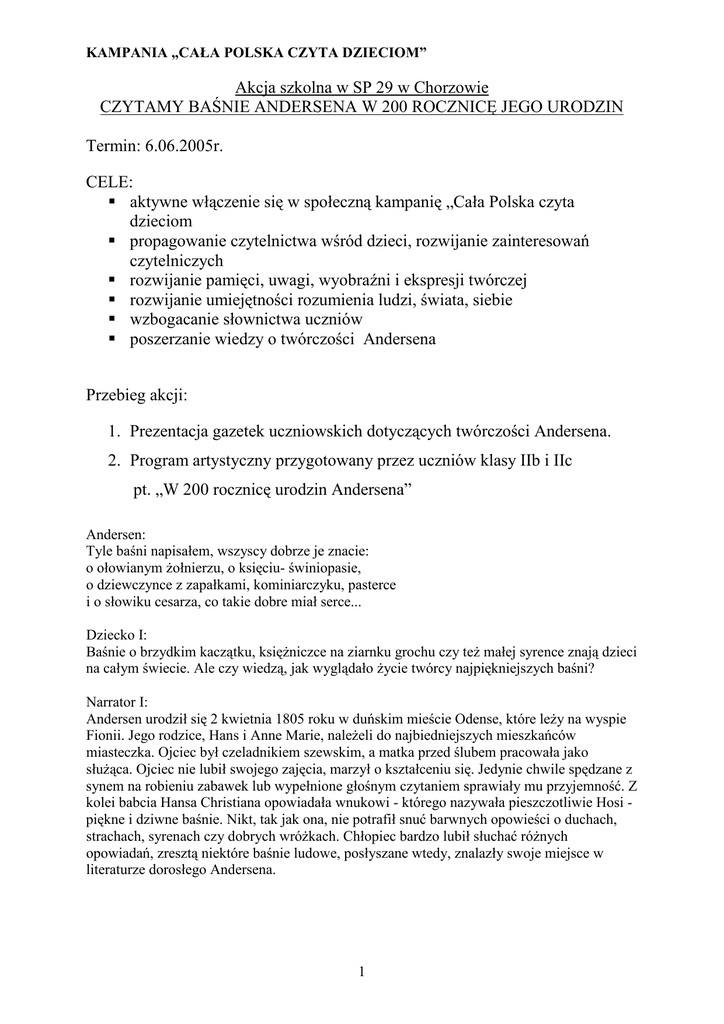 KAMPANIA „CAŁA POLSKA CZYTA DZIECIOM” Akcja szkolna w SP 29 w Chorzowie CZYTAMY BAŚNIE ANDERSENA W 200 ROCZNICĘ JEGO URODZIN Termin: 6.06.2005r. CELE: aktywne włączenie się w społeczną kampanię „Cała Polska czyta dzieciom propagowanie czytelnictwa wśród dzieci, rozwijanie zainteresowań czytelniczych rozwijanie pamięci, uwagi, wyobraźni i ekspresji twórczej rozwijanie umiejętności rozumienia ludzi, świata, siebie wzbogacanie słownictwa uczniów poszerzanie wiedzy o twórczości Andersena Przebieg akcji: 1. Prezentacja gazetek uczniowskich dotyczących twórczości Andersena. 2. Program artystyczny przygotowany przez uczniów klasy IIb i IIc pt. „W 200 rocznicę urodzin Andersena” Andersen: Tyle baśni napisałem, wszyscy dobrze je znacie: o ołowianym żołnierzu, o księciu- świniopasie, o dziewczynce z zapałkami, kominiarczyku, pasterce i o słowiku cesarza, co takie dobre miał serce... Dziecko I: Baśnie o brzydkim kaczątku, księżniczce na ziarnku grochu czy też małej syrence znają dzieci na całym świecie. Ale czy wiedzą, jak wyglądało życie twórcy najpiękniejszych baśni? Narrator I: Andersen urodził się 2 kwietnia 1805 roku w duńskim mieście Odense, które leży na wyspie Fionii. Jego rodzice, Hans i Anne Marie, należeli do najbiedniejszych mieszkańców miasteczka. Ojciec był czeladnikiem szewskim, a matka przed ślubem pracowała jako służąca. Ojciec nie lubił swojego zajęcia, marzył o kształceniu się. Jedynie chwile spędzane z synem na robieniu zabawek lub wypełnione głośnym czytaniem sprawiały mu przyjemność. Z kolei babcia Hansa Christiana opowiadała wnukowi - którego nazywała pieszczotliwie Hosi piękne i dziwne baśnie. Nikt, tak jak ona, nie potrafił snuć barwnych opowieści o duchach, strachach, syrenach czy dobrych wróżkach. Chłopiec bardzo lubił słuchać różnych opowiadań, zresztą niektóre baśnie ludowe, posłyszane wtedy, znalazły swoje miejsce w literaturze dorosłego Andersena. 1 Narrator II: Jego ulubionym zajęciem była zabawa lalkami i zabawkami wykonanymi domowym sposobem. Ojciec zrobił dla niego cały teatr lalkowy. Latem Hans mógł siedzieć godzinami w ogródku pod fartuchem matki, który był przymocowany do muru przy pomocy kija od miotły i miał wyobrażać namiot. Bawił się zawsze sam, nie miał żadnych kolegów. Bardzo lubił czytać. Był dzieckiem spokojnym. Narrator III: Gdy Hans Christian miał 11 lat umarł jego ojciec. Matka musiała szukać pracy u obcych jako praczka. Syn został więc w domu i miał czas na czytanie pożyczonych książek o życiu sławnych ludzi, co pozwalało mu marzyć, że i on kiedyś stanie się sławnym człowiekiem. Kiedyś, gdy Hans Christian był mały, pewna wróżka powiedziała do jego matki, że jej syn "będzie miał więcej szczęścia niż na to zasługuje - będzie jak dziki ptak, który wysoko lata i stanie się wielki i wytworny". Dodała jeszcze, że kiedyś Odense zabłyśnie światłem na jego cześć. Ta przepowiednia sprawdziła się później. Narrator IV Andersen lubił śpiewać i wiele osób uważało, że miał dobry głos. Wyróżniał się też swoim wyglądem wśród rówieśników. Był wysoki i kościsty, miał bardzo jasne włosy, oczy ledwie widoczne przez małe szparki, i pokaźnych rozmiarów nos. Nie był piękny, miał natomiast miłą osobowość. Gdy miał 14 lat, udał się do Kopenhagi, marząc o karierze aktora lub baletmistrza. Jego marzenia nie spełniły się. Na szczęście znalazł ludzi, którzy się nim zaopiekowali. Otrzymał stypendium i skończył szkołę. Zaczął też pisać wiersze i sztuki teatralne. W 1827 roku napisał wiersz " Umierające dziecko". Ten utwór uważa się za przełom w karierze pisarskiej Andersena. Narrator V: W 1835 roku ukazują się drukiem pierwsze baśnie. W pierwszym wydaniu nosiły tytuł "Baśnie opowiedziane dzieciom" (były tam m.in. "Krzesiwo", "Księżniczka na ziarnku grochu", "Kwiaty małej Idy"). Andersen staje się sławny w Danii i za granicą. Narrator VI: Pisarz nie założył własnej rodziny. Całe życie mieszkał w wynajętym mieszkaniu. Żył skromnie, a wszystkie zarobione pieniądze przeznaczał na podróże po Europie. Poznał wielu sławnych ludzi m.in. braci Grimm. Do dziś w muzeum Andersena zachowały się jego podróżne walizy, wielki parasol i .. lina, którą woził ze sobą na wypadek pożaru. Rozmawiając z dziećmi mówił o sobie jako "o potworze z nosem wielkim jak armata, a oczami maleńkimi jak zielony groszek". I w ten sposób też wycinał z papieru swoją sylwetkę - długonogi, przygarbiony dryblas z pokaźnym nosem. W Muzeum Andersena w Odense można zobaczyć jego misterne wycinanki z papieru oraz jego rysunki ołówkiem i piórkiem. Był może pierwszym artystą, który robił kolaże: łączył rysunki, fotografie i inne materiały w jedną kompozycję. Narrator VII: W wielu baśniach w osobach głównych postaci przedstawił samego siebie. Za najbardziej autobiograficzną baśń uważa się "Brzydkie kaczątko". Przecież z nieznanego, biednego chłopca wyrósł na wielkiego pisarza! W 1867 roku został honorowym obywatelem Odense. W roku 1875, przy okazji uroczystych obchodów swoich 70-tych urodzin, został odznaczony Krzyżem Komandorskim przez króla Danii, Christiana IX. Wkrótce po tym wydarzeniu, 4 sierpnia 1875 roku, Andersen zmarł w Kopenhadze Andersen napisał prawie 160 baśni, a jego książki zostały przetłumaczone na około 125 języków. W baśniach tych wciąż odnajdujemy siebie, jest w nich miejsce na radość i smutek, na łzy i śmiech. Narrator VIII Kochają Andersena wszyscy - i dzieci i dorośli na całym świecie, wszędzie tam, gdzie kocha się stokrotki, słowiki, róże, łabędzie, motyle. 2 W Kopenhadze, w Ogrodzie Królewskim, stoi pomnik pisarza, a najsławniejszym symbolem Danii jest Mała Syrenka - postać z baśni Andersena. (Wanda Chotomska Dzień dobry, Panie Andersenie!) Dz