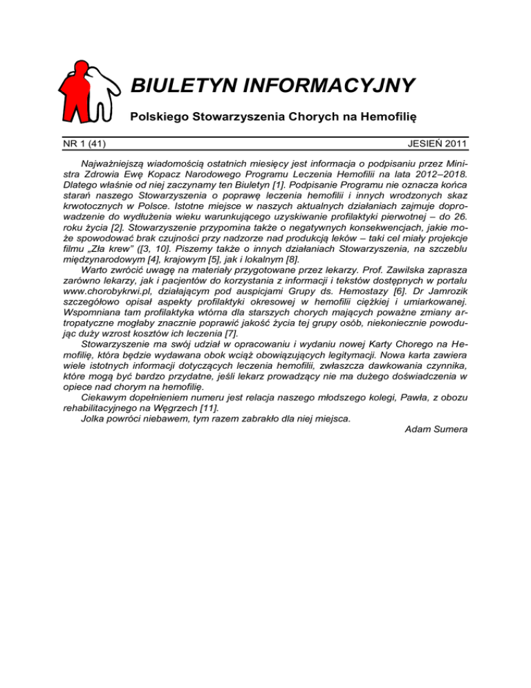 BIULETYN INFORMACYJNY Polskiego Stowarzyszenia Chorych na Hemofilię NR 1 (41) JESIEŃ 2011 Najważniejszą wiadomością ostatnich miesięcy jest informacja o podpisaniu przez Ministra Zdrowia Ewę Kopacz Narodowego Programu Leczenia Hemofilii na lata 2012–2018. Dlatego właśnie od niej zaczynamy ten Biuletyn [1]. Podpisanie Programu nie oznacza końca starań naszego Stowarzyszenia o poprawę leczenia hemofilii i innych wrodzonych skaz krwotocznych w Polsce. Istotne miejsce w naszych aktualnych działaniach zajmuje doprowadzenie do wydłużenia wieku warunkującego uzyskiwanie profilaktyki pierwotnej – do 26. roku życia [2]. Stowarzyszenie przypomina także o negatywnych konsekwencjach, jakie może spowodować brak czujności przy nadzorze nad produkcją leków – taki cel miały projekcje filmu „Zła krew” ([3, 10]. Piszemy także o innych działaniach Stowarzyszenia, na szczeblu międzynarodowym [4], krajowym [5], jak i lokalnym [8]. Warto zwrócić uwagę na materiały przygotowane przez lekarzy. Prof. Zawilska zaprasza zarówno lekarzy, jak i pacjentów do korzystania z informacji i tekstów dostępnych w portalu www.chorobykrwi.pl, działającym pod auspicjami Grupy ds. Hemostazy [6]. Dr Jamrozik szczegółowo opisał aspekty profilaktyki okresowej w hemofilii ciężkiej i umiarkowanej. Wspomniana tam profilaktyka wtórna dla starszych chorych mających poważne zmiany artropatyczne mogłaby znacznie poprawić jakość życia tej grupy osób, niekoniecznie powodując duży wzrost kosztów ich leczenia [7]. Stowarzyszenie ma swój udział w opracowaniu i wydaniu nowej Karty Chorego na Hemofilię, która będzie wydawana obok wciąż obowiązujących legitymacji. Nowa karta zawiera wiele istotnych informacji dotyczących leczenia hemofilii, zwłaszcza dawkowania czynnika, które mogą być bardzo przydatne, jeśli lekarz prowadzący nie ma dużego doświadczenia w opiece nad chorym na hemofilię. Ciekawym dopełnieniem numeru jest relacja naszego młodszego kolegi, Pawła, z obozu rehabilitacyjnego na Węgrzech [11]. Jolka powróci niebawem, tym razem zabrakło dla niej miejsca. Adam Sumera [1] NARODOWY PROGRAM JUŻ PODPISANY! Narodowy Program Leczenia Hemofilii i Pokrewnych Skaz Krwotocznych na lata 2012–2018 został podpisany przez minister zdrowia Ewę Kopacz – poinformowano 27 września na konferencji prasowej w Ministerstwie Zdrowia. Podpisany dokument pani minister Ewa Kopacz wręczyła osobiście prezesowi Polskiego Stowarzyszenia Chorych na Hemofilię Bogdanowi Gajewskiemu. W przypadku takiego dokumentu podpis ministra jest równoznaczny z wejściem programu w życie. „Bardzo się z tego cieszymy i jesteśmy bardzo wdzięczni, bo nowy program gwarantuje dobre leczenie na najbliższe lata. Ogromnie zależało nam na jego stworzeniu, ponieważ daje on szansę na wprowadzenie prawdziwie europejskich zmian w leczeniu chorych na hemofilię w Polsce” – powiedział Bogdan Gajewski. W Narodowym Programie Leczenia Hemofilii na lata 2012–18 znalazło się wiele rozwiązań bardzo korzystnych dla chorych. Leczenie zostało dostosowane do standardów wyznaczonych przez Parlament Europejski. Na przykład zaopatrzenie w czynniki krzepnięcia ma stale rosnąć, a w ostatnich latach obowiązywania programu będzie wynosiło 6 jednostek na mieszkańca. Pozytywne jest również to, że w dokumencie jest mowa o stworzeniu kompleksowych ośrodków leczenia hemofilii oraz o dopuszczeniu do terapii rekombinowanych czynników krzepnięcia, leków mających obecnie najlepszy profil bezpieczeństwa. Dotąd rekombinanty otrzymywały (od początku 2011 r.) tylko dzieci wcześniej nieleczone. Dzięki nowym zapisom dopuszczono możliwość stosowania rekombinowanych czynników krzepnięcia w leczeniu pozostałych pacjentów. Powstanie Narodowego Programu Leczenia Hemofilii pokazało, że „możliwa jest dobra współpraca pomiędzy pacjentami, lekarzami oraz urzędnikami. Mamy nadzieję, ze ta współpraca będzie kontynuowana. Liczę, że równie szybko uda się wprowadzić zmiany w wycenie leczenia szpitalnego chorych na hemofilię, które przedstawiciele Ministerstwa Zdrowia zapowiedzieli na spotkaniach z pacjentami w trakcie prac nad narodowym programem” – podsumował Bogdan Gajewski. (as) [2] SZANSA NA PRZEDŁUŻENIE PROFILAKTYKI PSCH od dawna stara się, by program leczenia profilaktycznego dzieci i młodzieży do 18. roku życia został przedłużony do 26. roku życia, po to, by młodzi ludzie mieli możliwość ukończenia studiów i wejścia w dorosłe życie. Nasze starania powoli przynoszą efekty, o czym świadczy pismo, które otrzymaliśmy 18 lipca br. z Ministerstwa Zdrowia. Pan wiceminister Marek Haber informuje w nim, że został już wstępnie opracowany projekt stopniowego przedłużania leczenia profilaktycznego. Zgodnie z projektem program będzie wydłużany co roku, stopniowo o kolejne lata. Na samym początku zostałyby nim objęte osoby, które w latach 2011 i 2012 skończą 18 lat. Obecnie Ministerstwo Zdrowia szacuje, jakie będą koszty wprowadzenia programu. Pan minister zapewnił, że poinformuje PSCH o postępach prac i terminie wprowadzenia programu w życie. (bg) [3] PANEL PSCH NA XXIV ZJEŹDZIE PTHiT Polskie Stowarzyszenie Chorych na Hemofilię wzięło udział w XXIV Zjeździe Polskiego Towarzystwa Hematologów i Transfuzjologów, który odbył się w dniach 16–18 września br. w Lublinie. W trakcie panelu dyskusyjnego prowadzonego przez Bogdana Gajewskiego i dr. Jacka Tabarkiewicza zaprezentowaliśmy film w reżyserii Marilyn Ness Bad Blood, opowiadający o największej tragedii w dziejach medycyny; doszło do niej w latach 80., gdy w wyniku stosowanych osoczopochodnych czynników krzepnięcia doszło do masowych zarażeń wirusami HIV i HCV wśród chorych. – Najważniejszym przesłaniem filmu jest to, żeby ludzie podejmujący decyzje ważące na zdrowiu i życiu innych nie bagatelizowali faktów naukowych. Przy opracowywaniu nowych 