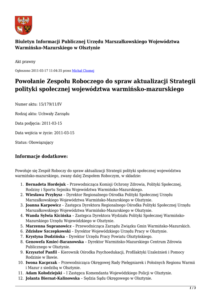 Biuletyn Informacji Publicznej Urzędu Marszałkowskiego Województwa Warmińsko-Mazurskiego w Olsztynie Akt prawny Ogłoszono 2011-03-17 11:04:35 przez Michał Chomej Powołanie Zespołu Roboczego do spraw aktualizacji Strategii polityki społecznej województwa warmińsko-mazurskiego Numer aktu: 15/179/11/IV Rodzaj aktu: Uchwały Zarządu Data podjęcia: 2011-03-15 Data wejścia w życie: 2011-03-15 Status: Obowiązujący Informacje dodatkowe: Powołuje się Zespół Roboczy do spraw aktualizacji Strategii polityki społecznej województwa warmińsko-mazurskiego, zwany dalej Zespołem Roboczym, w składzie: 1. Bernadeta Hordejuk – Przewodnicząca Komisji Ochrony Zdrowia, Polityki Społecznej, Rodziny i Sportu Sejmiku Województwa Warmińsko-Mazurskiego. 2. Wiesława Przybysz – Dyrektor Regionalnego Ośrodka Polityki Społecznej Urzędu Marszałkowskiego Województwa Warmińsko-Mazurskiego w Olsztynie. 3. Joanna Karpowicz – Zastępca Dyrektora Regionalnego Ośrodka Polityki Społecznej Urzędu Marszałkowskiego Województwa Warmińsko-Mazurskiego w Olsztynie. 4. Wanda Sylwia Kicińska – Zastępca Dyrektora Wydziału Polityki Społecznej WarmińskoMazurskiego Urzędu Wojewódzkiego w Olsztynie. 5. Marzenna Supranowicz – Przewodnicząca Zarządu Związku Gmin Warmińsko-Mazurskich. 6. Zdzisław Szczepkowski – Dyrektor Wojewódzkiego Urzędu Pracy w Olsztynie. 7. Krystyna Dudzińska – Dyrektor Urzędu Pracy Powiatu Olsztyńskiego. 8. Genowefa Kmieć-Baranowska – Dyrektor Warmińsko-Mazurskiego Centrum Zdrowia Publicznego w Olsztynie. 9. Krzysztof Panfil – Kierownik Ośrodka Psychoedukacji, Profilaktyki Uzależnień i Pomocy Rodzinie w Iławie. 10. Iwona Kacprzak – Przewodnicząca Okręgowej Rady Pielęgniarek i Położnych Regionu Warmii i Mazur z siedzibą w Olsztynie. 11. Adam Kołodziejski – I Zastępca Komendanta Wojewódzkiego Policji w Olsztynie. 12. Jolanta Biernat-Kalinowska – Sędzia Sądu Okręgowego w Olsztynie. 1/3 13. Wiesław Smereczyński – Przedstawiciel Rady ds. Rodzin Województwa WarmińskoMazurskiego. 14. Monika Hausman-Pniewska – Przewodnicząca Rady Organizacji Pozarządowych Województwa Warmińsko-Mazurskiego. 15. Marek Borowski – Prezes Zarządu Banku żywności w Olsztynie. 16. Bartłomiej Głuszak – Prezes Federacji Organizacji Socjalnych Województwa WarmińskoMazurskiego FOSa w Olsztynie. 17. Tadeusz Milewski – Prezes Warmińsko-Mazurskiego Sejmiku Osób Niepełnosprawnych. 18. Małgorzata Romaniuk – Koordynator Centrum Informacyjno-Szkoleniowego dla Osób Niepełnosprawnych. 19. Wiesława Szymczyk – Dyrektor Powiatowego Centrum Pomocy Rodzinie w Olecku. 20. Małgorzata Bejnarowicz – Dyrektor Powiatowego Centrum Pomocy Rodzinie w Kętrzynie. 21. Tomasz Podsiadło – Dyrektor Powiatowego Centrum Pomocy Rodzinie w Ostródzie. 22. Elżbieta Bronakowska – Dyrektor Miejskiego Ośrodka Pomocy Społecznej w Olsztynie. 23. Jadwiga Piekarska – Kierownik Miejsko-Gminnego Ośrodka Pomocy Społecznej w Młynarach. 24. Stefania Michalik-Rosa – Dyrektor Miejskiego Ośrodka Pomocy Społecznej w Bartoszycach. 25. Irena Kasprzycka – Dyrektor Miejskiego Ośrodka Pomocy Społecznej w Iławie. 26. Lidia Tomasik – Kierownik Miejskiego Ośrodka Pomocy Społecznej w Bisztynku. 27. Zbigniew Pawłowski – Kierownik Gminnego Ośrodka Pomocy Społecznej w Elblągu. 28. Maria Cichowska-Gałus – Prezes Zarządu Stowarzyszenia Organizatorów i Menedżerów Pomocy Społecznej i Ochrony Zdrowia Regionu Warmińsko-Mazurskiego, Dyrektor Domu Pomocy Społecznej „Kombatant” w Olsztynie. 29. Michał Maria Kozłowski – Dyrektor Domu Pomocy Społecznej w Grazymach. 30. Jarosław Dzioba – Wojewódzki Komendant OHP. 31. Monika Seredyn-Turowska – Kierownik Biura Karier Olsztyńskiej Szkoły Wyższej im. Józefa Rusieckiego. 32. dr Lidia Domańska – Adiunkt w Katedrze Socjologii Wydziału Nauk Społecznych Uniwersytetu Warmińsko-Mazurskiego w Olsztynie. 33. Grażyna Przasnyska – p.o. Warmińsko-Mazurski Kurator Oświaty. 34. Henryk Narwojsz – Prezes Warmińsko-Mazurskiego Zakładu Doskonalenia Zawodowego w Olsztynie. 35. Jolanta Kłoczewska – Dyrektor Szkoły Policealnej im. prof. Zbigniewa Religi w Olsztynie. 36. Bogdan Prewysz-Kwinto – Dyrektor Zespołu Placówek Opiekuńczo-Wychowawczych, Edukacyjnych i Diagnostycznych w Olsztynie. 37. Halina Łozowska-Sobol – Wicedyrektor ds. Ośrodka Adopcyjno-Opiekuńczego przy Zespole Placówek Opiekuńczo-Wychowawczych, Edukacyjnych i Diagnostycznych w Olsztynie. 38. Krzysztof Margol – Prezes Zarządu Nidzickiej Fundacji Rozwoju „NIDA”, przedstawiciel Ośrodka Wspierania Inicjatyw Ekonomii Społecznej. 39. Danuta Plucińska – Dyrektor Miejskiego Ośrodka Pomocy Społecznej w Biskupcu, przedstawiciel Klubu Integracji Społecznej. 40. Joanna Glezman – Pełnomocnik Marszałka ds. Współpracy z Organizacjami Pozarządowymi. 41. Sylwia Cieśluk – Kierownik Biura Polityki Zdrowotnej Departamentu Zdrowia Urzędu Marszałkowskiego Województwa Warmińsko-Mazurskiego w Olsztynie. 42. Joanna Kaczyńska – Kierownik Biura ds. pomocy i integracji społecznej Regionalnego Ośrodka Polityki Społecznej Urzędu Marszałkowskiego Województwa Warmińsko-Mazurskiego w Olsztynie. 43. Halina Zygnerska – Kierownik Biura ds. Rehabilitacji Osób Niepełnosprawnych Regionalnego Ośrodka Polityki Społecznej Urzędu Marszałkowskiego Województwa Warmińsko-Mazurskiego w Olsztynie. 44. Anna Piotrowska-Prot – Samodzielne stanowisko do spraw działań na rzecz rodziny Regionalnego Ośrodka Polityki Społecznej Urzędu Marszałkowskiego Województwa 2/3 Warmińsko-Mazurskiego w Olsztynie. 45. Dorota Wyszkowska-Solnicka – Kierownik Biura Projektów Integracji Społecznej Regionalnego Ośrodka Polityki Społecznej Urzędu Marszałkowskiego Województwa Warmińsko-Mazurskiego w Olsztynie. 46. Michał Tatarek – Pełnomocnik Zarządu Województwa Warmińsko-Mazurskiego ds. wdrażania Wojewódzkie