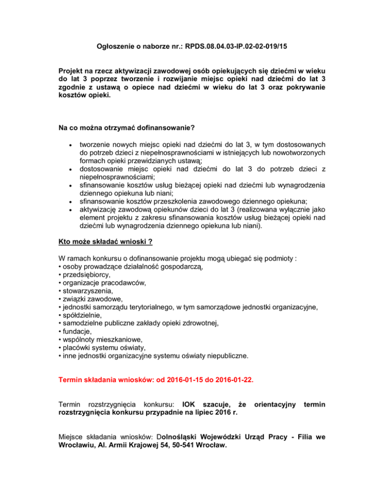 Ogłoszenie o naborze nr.: RPDS.08.04.03-IP.02-02-019/15 Projekt na rzecz aktywizacji zawodowej osób opiekujących się dziećmi w wieku do lat 3 poprzez tworzenie i rozwijanie miejsc opieki nad dziećmi do lat 3 zgodnie z ustawą o opiece nad dziećmi w wieku do lat 3 oraz pokrywanie kosztów opieki. Na co można otrzymać dofinansowanie? • • • • • tworzenie nowych miejsc opieki nad dziećmi do lat 3, w tym dostosowanych do potrzeb dzieci z niepełnosprawnościami w istniejących lub nowotworzonych formach opieki przewidzianych ustawą; dostosowanie miejsc opieki nad dziećmi do lat 3 do potrzeb dzieci z niepełnosprawnościami; sfinansowanie kosztów usług bieżącej opieki nad dziećmi lub wynagrodzenia dziennego opiekuna lub niani; sfinansowanie kosztów przeszkolenia zawodowego dziennego opiekuna; aktywizację zawodową opiekunów dzieci do lat 3 (realizowana wyłącznie jako element projektu z zakresu sfinansowania kosztów usług bieżącej opieki nad dziećmi lub wynagrodzenia dziennego opiekuna lub niani). Kto może składać wnioski ? W ramach konkursu o dofinansowanie projektu mogą ubiegać się podmioty : • osoby prowadzące działalność gospodarczą, • przedsiębiorcy, • organizacje pracodawców, • stowarzyszenia, • związki zawodowe, • jednostki samorządu terytorialnego, w tym samorządowe jednostki organizacyjne, • spółdzielnie, • samodzielne publiczne zakłady opieki zdrowotnej, • fundacje, • wspólnoty mieszkaniowe, • placówki systemu oświaty, • inne jednostki organizacyjne systemu oświaty niepubliczne. Termin składania wniosków: od 2016-01-15 do 2016-01-22. Termin rozstrzygnięcia konkursu: IOK szacuje, że rozstrzygnięcia konkursu przypadnie na lipiec 2016 r. orientacyjny termin Miejsce składania wniosków: Dolnośląski Wojewódzki Urząd Pracy - Filia we Wrocławiu, Al. Armii Krajowej 54, 50-541 Wrocław. Wnioski należy składać: • • w formie dokumentu elektronicznego za pośrednictwem systemu teleinformatycznego SNOW, formie papierowej wydrukowanej z systemu SNOW i opatrzonej podpisem osoby uprawnionej/podpisami osób uprawnionych do złożenia tego wniosku. Wniosek w formie papierowej należy złożyć w jednym egzemplarzu: - osobiście w kancelarii Dolnośląskiego Wojewódzkiego Urzędu Pracy – Filia we Wrocławiu, przy Al. Armii Krajowej 54, od poniedziałku do piątku w godzinach pracy DWUP, tj. od 7:30 do 15:30, lub - kurierem lub pocztą na adres: Dolnośląski Wojewódzki Urząd Pracy - Filia we Wrocławiu, Al. Armii Krajowej 54, 50-541 Wrocław, od poniedziałku do piątku w godzinach pracy DWUP, tj. od 7:30 do 15:30.
