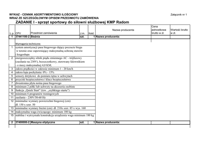 Załącznik nr 1 sprzęt sportowy do siłowni słuzbowej KMP Radom