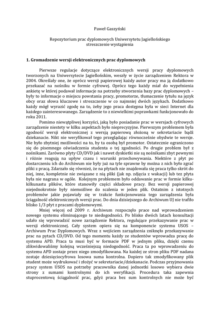 Paweł Gaszyński Repozytorium prac dyplomowych Uniwersytetu Jagiellońskiego streszczenie wystąpienia 1. Gromadzenie wersji elektronicznych prac dyplomowych Pierwsze regulacje dotyczące elektronicznych wersji pracy dyplomowych tworzonych na Uniwersytecie Jagiellońskim, weszły w życie zarządzeniem Rektora w 2004. Określały one, że oprócz wersji papierowej każdy autor pracy ma ją dodatkowo przekazać na nośniku w formie cyfrowej. Oprócz tego każdy miał do wypełnienia ankietę w której podawał informacje na potrzeby stworzenia bazy prac dyplomowych – były to informacje o miejscu powstania pracy, promotorze, tłumaczenie tytułu na język obcy oraz słowa kluczowe i streszczenie w co najmniej dwóch językach. Dodatkowo każdy mógł wyrazić zgodę na to, żeby jego praca dostępna była w sieci Internet dla każdego zainteresowanego. Zarządzenie to z niewielkimi poprawkami funkcjonowało do roku 2011. Pomimo niewątpliwej korzyści, jaką było posiadanie prac w wersjach cyfrowych zarządzenie niestety w kilku aspektach było nieprecyzyjne. Pierwszym problemem była zgodność wersji elektronicznej z wersją papierową złożoną w sekretariacie bądź dziekanacie. Nikt nie weryfikował tego przeglądając równocześnie obydwie te wersje. Nie było zbytniej możliwości na to, by ta osobą był promotor. Ostatecznie ograniczono się do pisemnego oświadczenia studenta o tej zgodności. Po drugie problem był z nośnikami. Zarówno płyty CD/DVD jak i nawet dyskietki nie są nośnikami zbyt pewnymi i różnie reagują na upływ czasu i warunki przechowywania. Niektóre z płyt po dostarczeniu ich do Archiwum nie były już na tyle sprawne by można z nich było zgrać pliki z pracą. Zdarzało się również, że na płytach nie znajdowała się praca tylko skrót do niej, inne, kompletnie nie związane z nią pliki (jak np. zdjęcia z wakacji) lub tez płyta była nie nagrana w ogóle. Kolejnym problemem było oddawanie prac w formie kilkukilkunastu plików, które stanowiły części składowe pracy. Bez wersji papierowej niejednokrotnie były niemożliwe do scalenia w jeden plik. Ostatnim z istotnych problemów jakie pojawiały się w trakcie funkcjonowania tego zarządzenia była ściągalność elektronicznych wersji prac. Do dnia dzisiejszego do Archiwum UJ nie trafiło blisko 1/3 płyt z pracami dyplomowymi. Mniej więcej od 2009 r. Archiwum rozpoczęło prace nad wprowadzeniem nowego systemu eliminującego te niedogodności. Po blisko dwóch latach konsultacji udało się wprowadzić nowe zarządzenie Rektora, regulujące przekazywanie prac w wersji elektronicznej. Cały system opiera się na komponencie systemu USOS – Archiwum Prac Dyplomowych. Wraz z wejściem zarządzenia zniknęło przekazywanie prac na pytach CD/DVD. Od tego momentu każdy ze studentów wprowadza pracę do systemu APD. Praca ta musi być w formacie PDF w jednym pliku, dzięki czemu zlikwidowaliśmy kolejną wcześniejszą niedogodność. Praca ta po wprowadzeniu do systemu APD zostaje przez niego zmodyfikowana. Na każdej ze stron pliku PDF nadana zostaje dziesięciocyfrowa losowa suma kontrolna. Dopiero tak zmodyfikowany plik student może wydrukować i złożyć w sekretariacie/dziekanacie. Podczas przyjmowania pracy system USOS na potrzeby pracownika danej jednostki losowo wybiera dwie strony z sumami kontrolnymi do ich weryfikacji. Procedura taka zapewnia stuprocentową ściągalność prac, gdyż praca bez sum kontrolnych nie może być dopuszczona do obrony a także zgodność wersji papierowej z elektroniczną. Oprócz wprowadzenia pracy do systemu każdy ze studentów wpisuje tam wszystkie dodatkowe informacje na potrzeby bazy prac, jak również określa dostępność dla osób trzecich swojej pracy. Przy wprowadzeniu tego zarządzenia jedną z najważniejszych kwestii było znalezienie takiego rozwiązania, by w ramach uczelnianego archiwum funkcjonowała jedynie wersja cyfrowa pracy jako równoważna wersji papierowej. Wiązało się to przede wszystkim z problemami lokalowymi Archiwum, dla którego coroczny napływ blisko 10000 prac przekracza możliwości magazynowania. W toku prac na stroną prawną zarządzenia uzyskaliśmy z Ministerstwa Nauki i Szkolnictwa Wyższego interpretację zapisu ustawy mówiącego o przechowywaniu jednego egzemplarza pracy dyplomowej w teczce akt osobowych. Zapis mówiący, że ma to być egzemplarz w formie papierowej oraz elektronicznej oznacza, że to uczelnia sama decyduje, w jakiej formie przechowuje prace. Ostatecznie aktualnie funkcjonującym rozwiązaniem jest to, że w Archiwum przechowujemy jedynie wersje cyfrowe prac, natomiast wersja papierowa, składana przed obroną, nie jest już przekazywana do Archiwum, tylko w momencie wydania dyplomu jest oddawana studentowi. 2. Udostępnianie prac dyplomowych Zarządzenie z roku 2004 po raz pierwszy poruszyło też kwestię udostępniania prac magisterskich i licencjackich. Zgodnie z wykładnią prawa autorskiego jaką otrzymaliśmy, prace licencjackie i magisterskie mogą być udostępnianie osobom trzecim wyłącznie po uzyskaniu zgody autora. Prace te nie mają swojego upublicznienia, obrona odbywa się w sposób niejawny i całość praw do dysponowania pracą jest po stronie autora. W związku z tym działają tutaj przepisy prawa autorskiego mówiące, że dzieło może zostać upublicznione 70 lat po śmierci autora. Zarządzenie z 2004 r. dało tutaj niewielką możliwość na upublicznianie tych prac dając każdemu z autorów możliwość zdecydowania czy chce aby jego praca była dostępna w sieci Internet czy tez nie. Był to system binarny, gdzie z jednej strony był pełny i nieograniczony dostęp do pracy dla każdego, a z drugiej zaś całkowite pozbawienie możliwości korzystania z niej. Mimo wszystko dzięki temu rozwiązaniu ¼ autorów prac, które posiadamy w Archiwum, wyraziło zgodę na upublicznienie swojej pracy. W 2011 roku w nowym zarządzeniu dołożona został