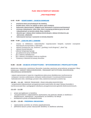 PLAN DNIA W ŚWIETLICY SZKOLNEJ ,,POD PAJĘCZYNKĄ”