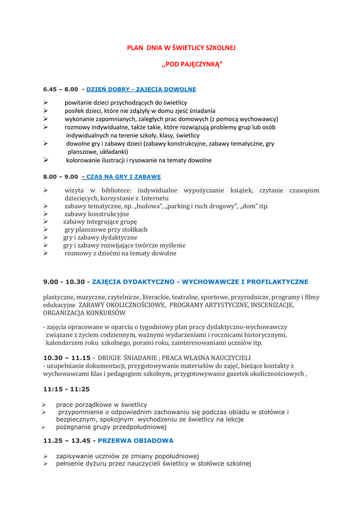PLAN DNIA W ŚWIETLICY SZKOLNEJ ,,POD PAJĘCZYNKĄ” 6.45 – 8.00 - DZIEŃ DOBRY - ZAJĘCIA DOWOLNE powitanie dzieci przychodzących do świetlicy posiłek dzieci, które nie zdążyły w domu zjeść śniadania wykonanie zapomnianych, zaległych prac domowych (z pomocą wychowawcy) rozmowy indywidualne, także takie, które rozwiązują problemy grup lub osób indywidualnych na terenie szkoły, klasy, świetlicy dowolne gry i zabawy dzieci (zabawy konstrukcyjne, zabawy tematyczne, gry planszowe, układanki) kolorowanie ilustracji i rysowanie na tematy dowolne 8.00 – 9.00 - CZAS NA GRY I ZABAWĘ wizyta w bibliotece: indywidualne wypożyczanie książek, czytanie czasopism dziecięcych, korzystanie z Internetu zabawy tematyczne, np. „budowa”, „parking i ruch drogowy”, „dom” itp. zabawy konstrukcyjne zabawy integrujące grupę gry planszowe przy stolikach gry i zabawy dydaktyczne gry i zabawy rozwijające twórcze myślenie rozmowy z dziećmi na tematy dowolne 9.00 - 10.30 - ZAJĘCIA DYDAKTYCZNO - WYCHOWAWCZE I PROFILAKTYCZNE plastyczne, muzyczne, czytelnicze, literackie, teatralne, sportowe, przyrodnicze, programy i filmy edukacyjne ZABAWY OKOLICZNOŚCIOWE, PROGRAMY ARTYSTYCZNE, INSCENIZACJE, ORGANIZACJA KONKURSÓW - zajęcia opracowane w oparciu o tygodniowy plan pracy dydaktyczno-wychowawczy związane z życiem codziennym, ważnymi wydarzeniami i rocznicami historycznymi, kalendarzem roku szkolnego, porami roku, zainteresowaniami uczniów itp. 10.30 – 11.15 - DRUGIE ŚNIADANIE ; PRACA WŁASNA NAUCZYCIELI - uzupełnianie dokumentacji, przygotowywanie materiałów do zajęć, bieżące kontakty z wychowawcami klas i pedagogiem szkolnym, przygotowywanie gazetek okolicznościowych , 11:15 - 11:25 prace porządkowe w świetlicy przypomnienie o odpowiednim zachowaniu się podczas obiadu w stołówce i bezpiecznym, spokojnym wychodzeniu ze świetlicy na lekcje pożegnanie grupy przedpołudniowej 11.25 – 13.45 - PRZERWA OBIADOWA zapisywanie uczniów ze zmiany popołudniowej pełnienie dyżuru przez nauczycieli świetlicy w stołówce szkolnej zabawy dowolne w kącikach zainteresowań posiłek dla dzieci niekorzystających z obiadów w szkole 13.45 – 14.30 - ZAJĘCIA RELAKSACYJNE Wyciszanie dzieci poprzez słuchanie muzyki relaksacyjno – odprężającej lub wybranej prozy czytanej przez nauczyciela lub lektora (płyta CD) 14:30 – 16.00 - ZAJĘCIA POPOŁUDNIOWE ODRABIANIE PRAC DOMOWYCH (grupa popołudniowa) korzystanie ze zbiorów biblioteki szkolnej zajęcia organizowane przez nauczyciela (plastyczne, muzyczne, literackie, teatralne, sportowe, przyrodnicze, programy i filmy edukacyjne ZABAWY OKOLICZNOŚCIOWE PROGRAMY ARTYSTYCZNE, INSCENIZACJE ORGANIZACJA KONKURSÓW 16.00 – 17.00 - CZAS NA GRY I ZABAWY zabawy tematyczne, np. „budowa”, „parking i ruch drogowy”, „dom” itp. zabawy konstrukcyjne zabawy integrujące grupę gry planszowe przy stolikach gry i zabawy dydaktyczne gry i zabawy rozwijające twórcze myślenie rozmowy z dziećmi na tematy dowolne rysowanie dowolne i kolorowanie. oglądanie filmów dla dzieci prace porządkowe w świetlicy odbiór dzieci