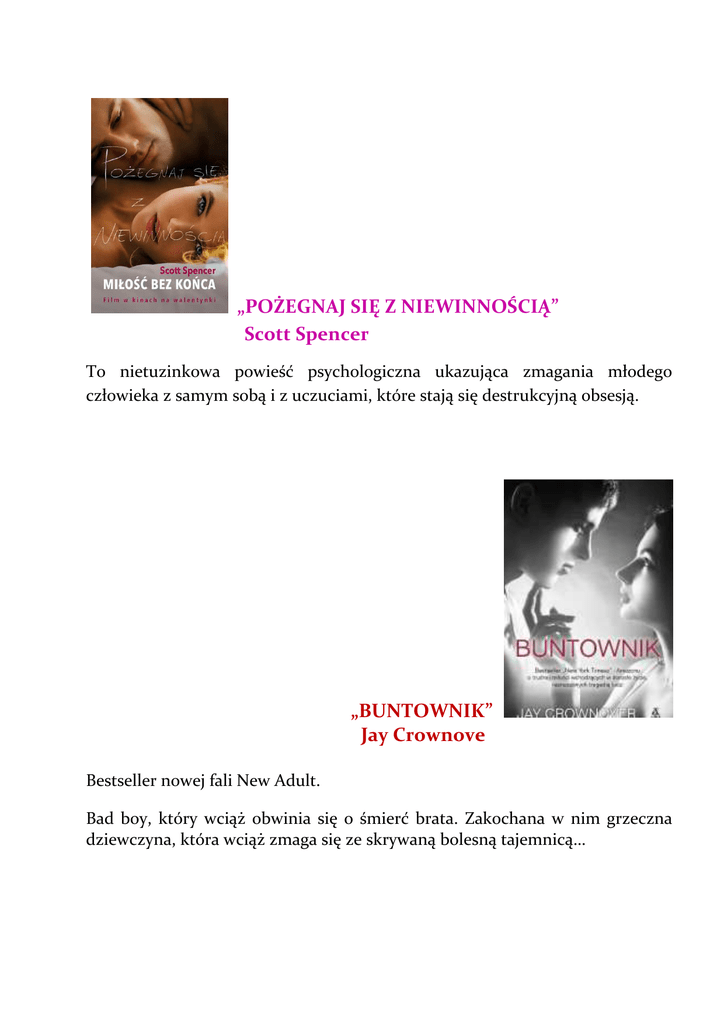 „POŻEGNAJ SIĘ Z NIEWINNOŚCIĄ” Scott Spencer To nietuzinkowa powieść psychologiczna ukazująca zmagania młodego człowieka z samym sobą i z uczuciami, które stają się destrukcyjną obsesją. „BUNTOWNIK” Jay Crownove Bestseller nowej fali New Adult. Bad boy, który wciąż obwinia się o śmierć brata. Zakochana w nim grzeczna dziewczyna, która wciąż zmaga się ze skrywaną bolesną tajemnicą… „ZROZUMIEĆ BEZ SŁÓW” Nancy Rossister Wzruszająca opowieść o niełatwym macierzyństwie i o pewnym niezwykłym chłopcu. Callie jest samotną młodą matką. Jej macierzyństwo nie przypomina uśmiechniętych zdjęć kobiet z dziećmi w kolorowych magazynach… „TAJEMNICA SITTAFORD” Agata Christie W małej wiosce Sittaford, odciętej od świata przez śnieżycę, grupka mieszkańców postanawia zabawić się w seans spirytystyczny… „MROCZNE UMYSŁY” Alexandra Bracken Najbardziej niepokojąca książka od czasów „Igrzysk śmierci”! „ROGI” Joe Hill Nowa powieść genialnego syna Stephena Kinga! „Rogi” są diabelnie dobre. Hill to znakomity pisarz z ogromną wyobraźnią. Ma wyjątkowy talent do zabierania czytelnika i swoich bohaterów w bardzo dziwne miejsca…„ USA Today „FÜRER MUSI ZGINĄĆ” James P. Duffy, Vincent L. Ricci Poznajmy dzieje tych, którzy odważyli się marzyć o świecie bez Hitlera i zapłacili za te marzenia najwyższą cenę. “TYLKO MNIE POPROŚ” Sylvia Day Książka Sylvii Day przenosi czytelniczki w czasy, gdy namiętność była tematem tabu, a pożądanie krępowały gorsety konwenansów. „SZEŚĆ LAT PÓŹNIEJ” HarlanCoben Kiedy sześć lat temu ukochana Jake’a Fishera wymogła na nim obietnicę, że nigdy więcej nie spotkają się, Jake postanowił, że nie będzie zakłócał spokoju swojej miłości. Kolejne lata upłynęły mu na ciężkiej pracy, i pomimo, że Natalie nadal gościła w jego sercu, dotrzymał postanowienia. „LŚNIENIE” Stephen King To jeden z najlepszych współczesnych horrorów. Nastrój grozy i napięcia potęguje się w niej z każdą minutą. „PODWÓJNA TOŻSAMOŚĆ” William Richter Piękna i buntownicza szesnastolatka, zamiast życia w luksusie wybiera niebezpieczną egzystencję na ulicach Manhattanu. Czy przeżyje na tyle długo, aby przekonać się, kim jest naprawdę? „DLA CIEBIE WSZYSTKO” Nicholas Sparks Wzruszająca opowieść o spotkaniu po latach, potrzebie miłości i trudnych wyborach, z których żaden nie jest do końca właściwy. „TATA” Daniell Steel Danielle Steel, pierwsza dama powieści obyczajowej, opowiada wzruszającą historię o tym, jaką moc ma miłość, wiara w rodzinę i nadzieja, która pomaga przetrwać trudne chwile. „MARZENIA KATE” Callahan Henry Patti Czy możemy po latach naprawić błędy młodości? Czy odważna konfrontacja z przeszłością przyniesie nam upragnioną ulgę? "Marzenia Kate" to wzruszająca opowieść o bolesnych decyzjach i skrywanych w głębi serca sekretach. „MASA O KOBIETACH POLSKIEJ MAFII” Jarosław „Masa” Sokołowski w rozmowie z Arturem Górskim Słynny polski świadek koronny przerywa milczenie! Książka "Masa o kobietach polskiej mafii" to wstrząsająca opowieść o matkach, żonach i kochankach polskich gangsterów.
