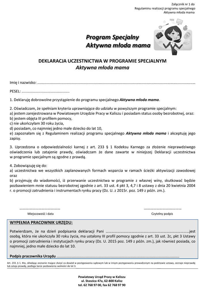 Załącznik nr 1 do Regulaminu realizacji programu specjalnego Aktywna młoda mama Program Specjalny Aktywna młoda mama DEKLARACJA UCZESTNICTWA W PROGRAMIE SPECJALNYM Aktywna młoda mama Imię i nazwisko: ........................................................................................................................................................ PESEL: .............................................. 1. Deklaruję dobrowolne przystąpienie do programu specjalnego Aktywna młoda mama. 2. Oświadczam, że spełniam kryteria uprawniające do udziału w powyższym programie specjalnym: a) jestem zarejestrowana w Powiatowym Urzędzie Pracy w Kaliszu i posiadam status osoby bezrobotnej, oraz: b) jestem objęta III profilem pomocy, c) nie ukończyłam 30 roku życia, d) posiadam, co najmniej jedno małe dziecko do lat 10, e) zapoznałam się z Regulaminem realizacji programu specjalnego Aktywna młoda mama i akceptuję jego zapisy. 3. Uprzedzona o odpowiedzialności karnej z art. 233 § 1 Kodeksu Karnego za złożenie nieprawdziwego oświadczenia lub zatajenie prawdy, oświadczam że dane zawarte w niniejszej Deklaracji uczestnictwa w programie specjalnym są zgodne z prawdą. 4. Zobowiązuję się do: a) uczestnictwa we wszystkich zaplanowanych formach wsparcia w ramach ścieżki aktywizacji zawodowej oraz b) przyjmuję do wiadomości, iż przerwanie uczestnictwa w programie z własnej winy, skutkować będzie pozbawieniem mnie statusu bezrobotnej zgodnie z art. 33 ust. 4 pkt 3, 4,7 i 8 ustawy z dnia 20 kwietnia 2004 r. o promocji zatrudnienia i instrumentach rynku pracy (Dz. U. z 2015r. poz. 149 z późn. zm.). ………………………………… ……………………………… Miejscowość i data Czytelny podpis WYPEŁNIA PRACOWNIK URZĘDU: Potwierdzam, że na dzień podpisania deklaracji Pani ……………………………………………………………………………jest osobą, która nie ukończyła 30 roku życia, ma ustalony III profil pomocy zgodnie z art. 33 ust. 2c, pkt 3 Ustawy o promocji zatrudnienia i instytucjach rynku pracy (Dz. U. 2015 poz. 149 z późn. zm.), jak również posiada, co najmniej, jedno małe dziecko do lat 10. Podpis pracownika Urzędu ...................................................................................................................... Art. 233. § 1. Kto, składając zeznanie mające służyć za dowód w postępowaniu sądowym lub w innym postępowaniu prowadzonym na podstawie ustawy, zeznaje nieprawdę lub zataja prawdę, podlega karze pozbawienia wolności do lat 3. Powiatowy Urząd Pracy w Kaliszu ul. Staszica 47a, 62-800 Kalisz tel. 62 768 97 00, fax 62 768 97 90 Program Specjalny Aktywna młoda mama OŚWIADCZENIE UCZESTNIKCZKI PROGRAMU SPECJALNEGO Aktywna młoda mama W związku z przystąpieniem do programu specjalnego Aktywna młoda mama Oświadczam, że przyjmuję do wiadomości, iż: 1) administratorem moich danych osobowych jest Powiatowy Urząd Pracy w Kaliszu, ul. Staszica 47a; 62-800 Kalisz; 2) podstawę prawną przetwarzania moich danych osobowych stanowi art. 23 ust. 1 pkt 2 lub art. 27 ust. 2 pkt 2 ustawy z dnia 29 sierpnia 1997 r. o ochronie danych osobowych (Dz. U. z 2014r. poz. 1182) – dane osobowe są niezbędne dla realizacji programu specjalnego Aktywna młoda mama; 3) moje dane osobowe będą przetwarzane wyłącznie w celu udzielenia wsparcia, realizacji programu specjalnego Aktywna młoda mama, ewaluacji, kontroli, monitoringu i sprawozdawczości; 4) moje dane osobowe mogą zostać powierzone do przetwarzania podmiotom, które na zlecenie Powiatowego Urzędu Pracy w Kaliszu uczestniczą w realizacji programu specjalnego Aktywna młoda mama. Moje dane osobowe mogą zostać udostępnione firmom badawczym realizującym na zlecenie Ministerstwa Pracy i Polityki Społecznej badania ewaluacyjne w ramach Funduszu Pracy oraz specjalistycznym firmom realizującym na zlecenie Ministerstwa Pracy i Polityki Społecznej kontrole w ramach Funduszu Pracy; 5) podanie danych jest dobrowolne, jednak odmowa ich podania jest równoznaczna z brakiem możliwości udzielenia wsparcia w ramach programu specjalnego; 6) mam prawo dostępu do treści swoich danych i ich poprawiania. ………………………………… ……......….……………………………………….. Miejscowość i data Czytelny podpis uczestniczki programu specjalnego Powiatowy Urząd Pracy w Kaliszu ul. Staszica 47a, 62-800 Kalisz tel. 62 768 97 00, fax 62 768 97 90