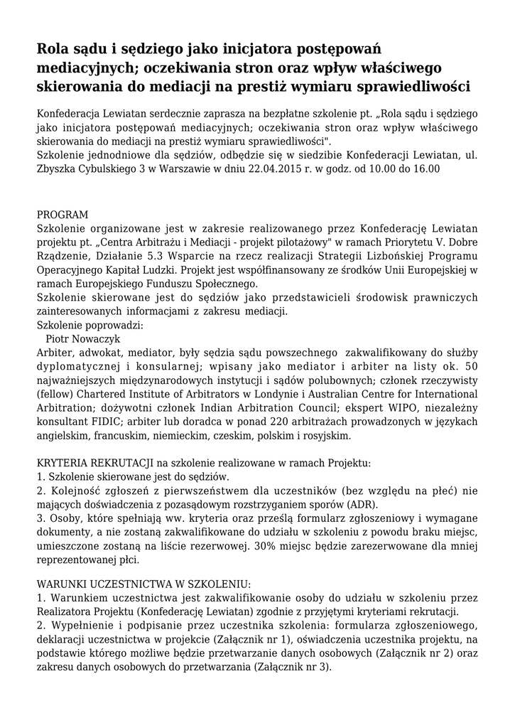 Rola sądu i sędziego jako inicjatora postępowań mediacyjnych; oczekiwania stron oraz wpływ właściwego skierowania do mediacji na prestiż wymiaru sprawiedliwości Konfederacja Lewiatan serdecznie zaprasza na bezpłatne szkolenie pt. „Rola sądu i sędziego jako inicjatora postępowań mediacyjnych; oczekiwania stron oraz wpływ właściwego skierowania do mediacji na prestiż wymiaru sprawiedliwości". Szkolenie jednodniowe dla sędziów, odbędzie się w siedzibie Konfederacji Lewiatan, ul. Zbyszka Cybulskiego 3 w Warszawie w dniu 22.04.2015 r. w godz. od 10.00 do 16.00 PROGRAM Szkolenie organizowane jest w zakresie realizowanego przez Konfederację Lewiatan projektu pt. „Centra Arbitrażu i Mediacji - projekt pilotażowy" w ramach Priorytetu V. Dobre Rządzenie, Działanie 5.3 Wsparcie na rzecz realizacji Strategii Lizbońskiej Programu Operacyjnego Kapitał Ludzki. Projekt jest współfinansowany ze środków Unii Europejskiej w ramach Europejskiego Funduszu Społecznego. Szkolenie skierowane jest do sędziów jako przedstawicieli środowisk prawniczych zainteresowanych informacjami z zakresu mediacji. Szkolenie poprowadzi: Piotr Nowaczyk Arbiter, adwokat, mediator, były sędzia sądu powszechnego zakwalifikowany do służby dyplomatycznej i konsularnej; wpisany jako mediator i arbiter na listy ok. 50 najważniejszych międzynarodowych instytucji i sądów polubownych; członek rzeczywisty (fellow) Chartered Institute of Arbitrators w Londynie i Australian Centre for International Arbitration; dożywotni członek Indian Arbitration Council; ekspert WIPO, niezależny konsultant FIDIC; arbiter lub doradca w ponad 220 arbitrażach prowadzonych w językach angielskim, francuskim, niemieckim, czeskim, polskim i rosyjskim. KRYTERIA REKRUTACJI na szkolenie realizowane w ramach Projektu: 1. Szkolenie skierowane jest do sędziów. 2. Kolejność zgłoszeń z pierwszeństwem dla uczestników (bez względu na płeć) nie mających doświadczenia z pozasądowym rozstrzyganiem sporów (ADR). 3. Osoby, które spełniają ww. kryteria oraz prześlą formularz zgłoszeniowy i wymagane dokumenty, a nie zostaną zakwalifikowane do udziału w szkoleniu z powodu braku miejsc, umieszczone zostaną na liście rezerwowej. 30% miejsc będzie zarezerwowane dla mniej reprezentowanej płci. WARUNKI UCZESTNICTWA W SZKOLENIU: 1. Warunkiem uczestnictwa jest zakwalifikowanie osoby do udziału w szkoleniu przez Realizatora Projektu (Konfederację Lewiatan) zgodnie z przyjętymi kryteriami rekrutacji. 2. Wypełnienie i podpisanie przez uczestnika szkolenia: formularza zgłoszeniowego, deklaracji uczestnictwa w projekcie (Załącznik nr 1), oświadczenia uczestnika projektu, na podstawie którego możliwe będzie przetwarzanie danych osobowych (Załącznik nr 2) oraz zakresu danych osobowych do przetwarzania (Załącznik nr 3). ZGŁOSZENIA: Udział w szkoleniu jest bezpłatny. Liczba miejsc ograniczona! W celu zgłoszenia do udziału w szkoleniu należy przesłać faksem na nr 22/55 99 910, 22/55 99 920 lub skan na adres e-mail: [email protected] wypełnione i podpisane następujące dokumenty: 1. Formularz zgłoszeniowy. 2. Załącznik nr 1- Deklaracja uczestnictwa w projekcie. 3. Załącznik nr 2- Oświadczenie uczestnika projektu. 4. Załącznik nr 3 - Zakres danych osobowych do przetwarzania. Instrukcja wypełniania Załącznika nr 3 Dopuszczalne jest również złożenie formularza zgłoszeniowego i wymaganych dokumentów osobiście lub przesłanie pocztą do Biura Projektu na adres: Konfederacja Lewiatan, ul. Zbyszka Cybulskiego 3, 00- 727 Warszawa (decyduje data wpływu). UWAGA!!! Po przyjęciu zgłoszenia obecność w szkoleniu jest obowiązkowa! Uczestnik może zrezygnować z udziału w szkoleniu, na które się zgłosił na pisemny wniosek złożony do Biura Projektu najpóźniej na 3 dni robocze przed rozpoczęciem szkolenia. Organizator zastrzega sobie możliwość zmiany terminów szkoleń. Dodatkowe informacje uzyskają Państwo pod nr. tel.: 2255 99 967; ewentualnie 225599973 lub pod adresem e-mail: [email protected]