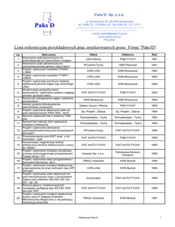 Paks’D Sp. z o.o. Paks D ul. Mickiewicza 36, 32-626 Jawiszowice tel. (048) 32 - 7370544, 45 ; fax (048) 32 - 211 0717 --------------------------------------------------------------------------------------------------------------------------------------e-mail: [email protected] www.paksd.com.pl POLAND Lista referencyjna przykładowych prac zrealizowanych przez Firmę "Paks'D" Lp. 1 2 3 4 5 6 7 8 9 10 11 12 13 14 15 16 17 18 19 20 Opis pracy Wykonanie szaf sterowniczych do automatycznej linii cięcia blach z kręgów Wykonanie szafy sterowniczej do zautomatyzowanej gilotyny cięcia blach Projekt i wykonanie rozdzielni 3*500V; 1,5MW Projekt i wykonanie rozdzielni 3*380V; 750kW Projekt i wykonanie pod klucz instalacji elektrycznej płuczki węgla (wg. technologii USA) Modernizacja podajnika blach, opracowanie i wykonanie systemu ciągłego pomiaru grubości blach. Serwis linii wzbogacania węgla i szkolenie pracowników Montaż gniazda klimatyzatorów samochodów osobowych Projekt i wykonanie aktywnych osłon do pras mechanicznych PHH-160T kpl 6 Remont wytłaczarki folii o średnicy 1500 mm Remont linii nadruku folii i wykonanie instalacji schładzania Projekt i wykonanie sterowania zautomatyzowaną linią pras karoseryjnych 400-650T Przemieszczenie pras 400T wraz z ich remontem - szt6 Konserwacja i regeneracja izolacji elektrycznej silników elektrycznych o mocy do 100kW Projekt i wykonanie instalacji wizualizacji procesu technologicznego przepompowni Ciepłej Wody i CO Projekt i wykonanie stacji przygotowania i dozowania floculentu kpl.4 Projekt i wykonanie instalacji elektrycznej i pneumatycznej do pras mułowych typu EIP 300 kpl4 Projekt i wykonanie osłon aktywnych do pras mechanicznych wraz z wyciszeniem hałasu pras wielkości 300,250,150,100, 50T. kpl. 39 Remont główny i modernizacja linii rozwijająco podającej typu BZ 630-1000 dla pras 300T Projekt i wykonanie instalacji elektrycznej dozoru sieci IT Zakładu Przeróbki Mechanicznej Węgla wraz z wizualizacją i lokalizacją doziemień Klient Odbiorca Rok LEN-Włochy FSM-TYCHY 1991 IPControl-Tychy OBR Plasomet 1991 ICRC-USA KWK-Brzeszcze 1992 ICRC-USA KWK-Brzeszcze 1992 ICRC-USA KWK-Brzeszcze 1992 FIAT AUTO-TYCHY FSM-TYCHY 1993 KWK Brzeszcze KWK Brzeszcze 1993 Galileo Vacum -Włochy FSM-TYCHY 1993 Sp. Projekt - Zabrze Sp. Projekt - Zabrze 1994 Termoplastyka - Tychy Termoplastyka - Tychy 1994 Termoplastyka - Tychy Termoplastyka - Tychy 1994 IPControl-Tychy FIAT AUTO-TYCHY 1994 FIAT AUTO-TYCHY FSM-TYCHY 1995 FIAT AUTO-TYCHY FIAT AUTO-TYCHY 1995 Inwestor Sp. z o.o. Państwowe Muzeum Oświęcim 1995 PMUG -Katowice KWK Budryk 1996 ICRC-USA KWK Budryk 1996 Europrojekt FIAT AUTO-TYCHY 1996 FIAT AUTO-TYCHY FIAT AUTO-TYCHY 1996 PMUG -Katowice KWK Budryk 1997 Referencje Paks'D 1 Lp. 21 22 23 24 25 26 27 28 29 30 31 32 33 34 35 36 37 38 39 40 41 Opis pracy Demontaż, przemieszczenie z Warszawy do Siedlec, ponowny montaż, rozruch mechaniczno-energetyczny i technologiczny linii pras karoseryjnych (8 sztuk) typu BLISS 300T wraz z modernizacją układu sprzęgło-hamulec Projekt, wykonanie i uruchomienie zbiorczego,płytowego transportera złomu Montaż i uruchomienie linii pras karoseryjnych w ilości 9 szt. o naciskach do 300 ton firmy SAMYANG Wykonanie, dostawa i montaż instalacji hydraulicznej w linii walcowniczej blach w oparciu o podzespoły Firmy Parker Montaż i uruchomienie dwóch linii pras karoseryjnych oraz prasy linii wykrawania o nacisku 800-1600 ton w ilości 15 szt Dostawa, montaż i rozruch 3 stacji hydraulicznych o pojemnościach zbiorników 500 dm3, 3000 dm3 i 5000 dm3 i wydajnościach 180 dm3/min, 370 dm3/min i 750 dm3/min. Rozładunek, przemieszczenie i posadowienie na fundamentach linii pras transferowych szt 3 Montaż i renowacja form wtryskowych pianek tapicerki samochodowej Modernizacja stanowisk rozruchu silnika benzynowego z wtryskiem typu SPI 899cm Remonty główne; średnie i bieżące pras mechanicznych 40-160T (np.Rosche,PMP,Schuler) wg zleceń szt24 Remonty główne; średnie i bieżące pras mechanicznych pojedynczego działania 250-400T (np. Rosche,PMP Schuller) wg zleceń szt 16 Remonty główne; średnie i bieżące pras mechanicznych podwójnego działania -400T-1250T (np. Schuller) wg zleceń szt4 Remonty główne; średnie i bieżące pras mechanicznych pojedynczego działania 400-600T wg zleceń szt 12 Produkcja wytłoczek na prasach 40-300T przerób 400ton/m.-c Wytwarzanie tłoczników do pras 40-250T Klient Odbiorca Rok DAEWOO FSO MOTOR Warszawa DAEWOO MOTOR Zakład Żerań DAEWOO MOTOR ZPP Siedlce 1997 DAEWOO FSO MOTOR Warszawa DAEWOO MOTOR ZPP Siedlce 1997 THONGHEUNG POLAND THONGHEUNG POLAND -Grójec 1998 HpH Katowice Huta Aluminium KONIN S.A.. 1998 VAB Tychy VAB Tychy 1998 BP i DUH HpH S.A. w Katowicach Huta Aluminium "Konin" S.A. 1998 BERTRAND FAURE AUTOMOBIL -Grójec BERTRAND FAURE AUTOMOBIL -Grójec 1998 1998 FIAT AUTO POLAND -Bielsko-Biała FIAT AUTO POLAND -Bielsko-Biała 1998 FIAT AUTO-TYCHY FIAT AUTO-TYCHY od 1995 do nadal FIAT AUTO-TYCHY FIAT AUTO-TYCHY od 1995 do nadal FIAT AUTO-TYCHY FIAT AUTO-TYCHY od 1995 do nadal FIAT AUTO-TYCHY FIAT AUTO-TYCHY od 1995 do nadal Reflex FIAT AUTO-TYCHY od 1997 do nadal Reflex FIAT AUTO-TYCHY od1997 do nadal Modernizacja i remont pras hydraulicznych POLOVAT POLOVAT od1997 do nadal o nacisku 200T Dostawa, montaż i rozruch stacji BP i DUH HpH S.A. w Huta Aluminium "Konin" 1999 hydraulicznej o pojemności 325 dm3 i Katowicach S.A. wydajności 70 dm3/min Dostawa, montaż i rozruch stacji ALTECH Przedsiębiorstwo Huta Aluminium "Konin" hydraulicznej podnoszenia pieców Automatyzacji i Pomiarów Sp. 1999 S.A. uchylnych o pojemności 1000 dm3 i z o.o. Konin wydajności 16,9 l/min Modernizacja sterowania prasami mechanicznymi o nacisku 250 ton na bazie PROCARS Tychy PROCARS Tychy od12.98 do 2.99 sterowników Mitsubishi -4prasy Zaprojektowanie, dostawa i montaż pod Zakład Innowacyjno Zakład Produkcyjno klucz istalacji energetycznej i sterowania od 03.99 do k