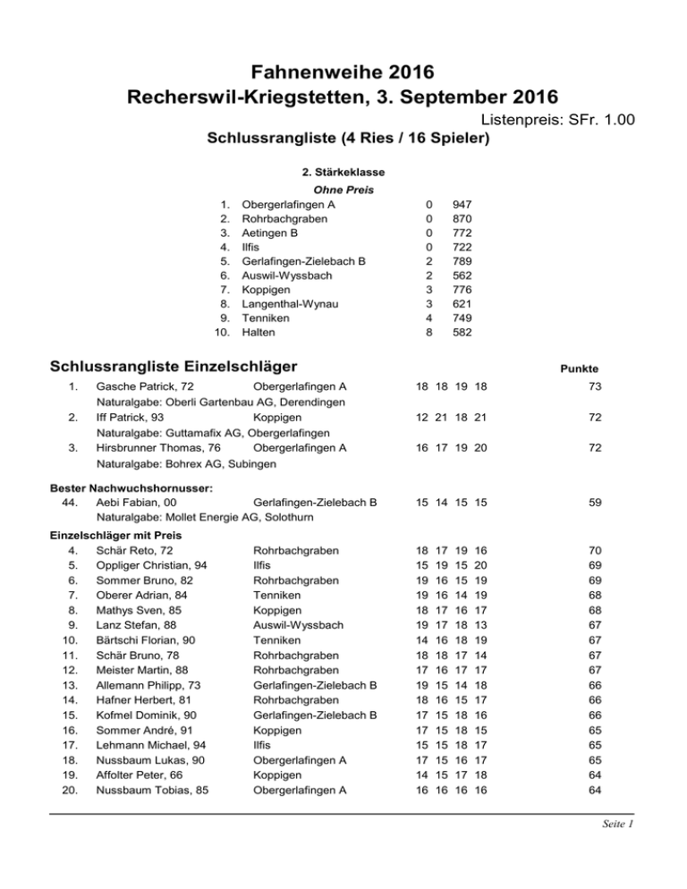 Fahnenweihe 2016 Recherswil-Kriegstetten, 3. September 2016 Listenpreis: SFr. 1.00 Schlussrangliste (4 Ries / 16 Spieler) 2. Stärkeklasse 1. 2. 3. 4. 5. 6. 7. 8. 9. 10. Ohne Preis Obergerlafingen A Rohrbachgraben Aetingen B Ilfis Gerlafingen-Zielebach B Auswil-Wyssbach Koppigen Langenthal-Wynau Tenniken Halten 0 0 0 0 2 2 3 3 4 8 947 870 772 722 789 562 776 621 749 582 Schlussrangliste Einzelschläger 1. 2. 3. Gasche Patrick, 72 Obergerlafingen A Naturalgabe: Oberli Gartenbau AG, Derendingen Iff Patrick, 93 Koppigen Naturalgabe: Guttamafix AG, Obergerlafingen Hirsbrunner Thomas, 76 Obergerlafingen A Naturalgabe: Bohrex AG, Subingen Bester Nachwuchshornusser: 44. Aebi Fabian, 00 Gerlafingen-Zielebach B Naturalgabe: Mollet Energie AG, Solothurn Einzelschläger mit Preis 4. Schär Reto, 72 5. Oppliger Christian, 94 6. Sommer Bruno, 82 7. Oberer Adrian, 84 8. Mathys Sven, 85 9. Lanz Stefan, 88 10. Bärtschi Florian, 90 11. Schär Bruno, 78 12. Meister Martin, 88 13. Allemann Philipp, 73 14. Hafner Herbert, 81 15. Kofmel Dominik, 90 16. Sommer André, 91 17. Lehmann Michael, 94 18. Nussbaum Lukas, 90 19. Affolter Peter, 66 20. Nussbaum Tobias, 85 Rohrbachgraben Ilfis Rohrbachgraben Tenniken Koppigen Auswil-Wyssbach Tenniken Rohrbachgraben Rohrbachgraben Gerlafingen-Zielebach B Rohrbachgraben Gerlafingen-Zielebach B Koppigen Ilfis Obergerlafingen A Koppigen Obergerlafingen A Punkte 18 18 19 18 73 12 21 18 21 72 16 17 19 20 72 15 14 15 15 59 18 15 19 19 18 19 14 18 17 19 18 17 17 15 17 14 16 70 69 69 68 68 67 67 67 67 66 66 66 65 65 65 64 64 17 19 16 16 17 17 16 18 16 15 16 15 15 15 15 15 16 19 15 15 14 16 18 18 17 17 14 15 18 18 18 16 17 16 16 20 19 19 17 13 19 14 17 18 17 16 15 17 17 18 16 Seite 1 21. 22. 23. 24. 25. 26. 27. 28. 29. 30. 31. 32. 33. 34. 35. 36. 37. 38. 39. 40. 41. 42. 43. 45. 46. 47. 48. 49. 50. 51. 52. 53. Sollberger Franz, 62 Gasche Alexander, 92 Wagner Andreas, 86 Marti Daniel, 86 Spichiger Res, 74 Schärer René, 71 Stampfli Andreas, 73 Guazzini Remi, 83 Sieber Markus, 65 Horisberger Kevin, 94 Kölliker Martin, 80 Schöni Remo, 92 Althaus Roger, 82 Kölliker Rolf, 76 Wälchli Thomas, 89 Elsässer Christoph, 73 Liechti Daniel, 92 Siegrist Beat, 73 Ryser Peter, 82 Spahr Martin, 76 Spichiger Hans, 80 Ryser Philipp, 92 Hager Rolf, 59 Zbinden Reto, 95 Marti Pascal, 88 Gasche Matthias, 94 Kämpfer Lukas, 95 Ryser Marcel, 88 Sigrist Beat, 86 Andres Walter, 63 Derungs Sergio, 97 Furrer Patrick, 85 Tenniken Obergerlafingen A Obergerlafingen A Ilfis Rohrbachgraben Gerlafingen-Zielebach B Halten Halten Koppigen Ilfis Langenthal-Wynau Obergerlafingen A Gerlafingen-Zielebach B Langenthal-Wynau Rohrbachgraben Gerlafingen-Zielebach B Tenniken Obergerlafingen A Auswil-Wyssbach Gerlafingen-Zielebach B Rohrbachgraben Aetingen B Obergerlafingen A Aetingen B Ilfis Obergerlafingen A Rohrbachgraben Aetingen B Auswil-Wyssbach Aetingen B Tenniken Halten 16 15 11 13 18 14 17 14 16 18 13 17 14 16 15 17 17 15 16 11 17 14 15 18 14 16 5 10 14 13 13 13 17 17 15 16 16 13 13 14 14 8 15 17 15 15 17 11 10 14 15 19 12 13 15 11 16 19 17 15 12 15 6 15 17 15 17 14 11 18 15 17 16 18 18 11 17 15 18 18 17 15 15 12 15 16 16 19 12 10 17 16 15 14 18 12 13 16 19 19 17 17 17 17 16 17 15 16 15 15 10 14 16 16 14 17 15 16 13 10 16 12 18 16 16 15 19 16 63 63 62 62 62 62 62 62 62 61 61 61 61 61 60 60 60 60 60 59 59 59 59 58 58 57 57 57 57 57 56 56 Seite 2 Beste Nachwuchshornusser: 44. Aebi Fabian, 00 Gerlafingen-Zielebach B 15 14 15 15 59 100. Martini Fabio, 00 Langenthal-Wynau 13 11 10 11 45 136. Schär Adrian, 02 Rohrbachgraben 11 10 138. Platz Nick, 01 Langenthal-Wynau 5 151. Christen Joel, 01 Auswil-Wyssbach 9 0 8 29 8 8 8 29 8 0 2 19 Seite 3