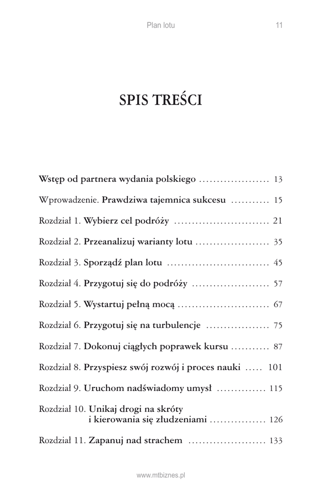 Plan lotu 11 Spis treści Wstęp od partnera wydania polskiego . . . . . . . . . . . . . . . . . . . . 13 Wprowadzenie. Prawdziwa tajemnica sukcesu .. . . . . . . . . . . 15 Rozdział 1. Wybierz cel podróży .. . . . . . . . . . . . . . . . . . . . . . . . . . . 21 Rozdział 2. Przeanalizuj warianty lotu . . . . . . . . . . . . . . . . . . . . . 35 Rozdział 3. Sporządź plan lotu .. . . . . . . . . . . . . . . . . . . . . . . . . . . . . 45 Rozdział 4. Przygotuj się do podróży .. . . . . . . . . . . . . . . . . . . . . . 57 Rozdział 5. Wystartuj pełną mocą . . . . . . . . . . . . . . . . . . . . . . . . . . 67 Rozdział 6. Przygotuj się na turbulencje .. . . . . . . . . . . . . . . . . . 75 Rozdział 7. Dokonuj ciągłych poprawek kursu . . . . . . . . . . . 87 Rozdział 8. Przyspiesz swój rozwój i proces nauki .. . . . . 101 Rozdział 9. Uruchom nadświadomy umysł .. . . . . . . . . . . . . . 115 Rozdział 10. Unikaj drogi na skróty i kierowania się złudzeniami . . . . . . . . . . . . . . . . 126 Rozdział 11. Zapanuj nad strachem .. . . . . . . . . . . . . . . . . . . . . . 133 www.mtbiznes.pl 12 Plan lotu Rozdział 12. Wytrwaj, dopóki nie osiągniesz sukcesu . . . . . . . . . . . . . . . . . . . . . . . 143 Zakończenie. Sukces to nie przypadek . . . . . . . . . . . . . . . . . . . . 153 O autorze .. . . . . . . . . . . . . . . . . . . . . . . . . . . . . . . . . . . . . . . . . . . . . . . . . . . 158 www.mtbiznes.pl Plan lotu 13 WSTĘP OD PARTNERA WYDANIA POLSKIEGO W czasach kiedy świat pędzi i nie można sobie pozwolić na błądzenie – bo konkurencja nie śpi i nikogo z nas ani żadnej organizacji nie stać na to, aby tracić czas na podążanie w niewłaściwym kierunku – wyznaczenie celu działań jest sprawą absolutnie fundamentalną i leży u podstaw osiągnięcia sukcesu. Jak bowiem iść we właściwym kierunku, skoro nie znamy celu podróży. Brian Tracy w swojej kolejnej książce, w której porównuje biznes do podróży samolotem, w prosty i ciekawy sposób pokazuje, jak stworzyć plan naszego „lotu” i przełożyć go na niezbędne działania, jakie musimy podjąć, aby dotrzeć do celu. Niedawno wiele mówiono o książce Sekret, która próbuje znaleźć odpowiedź na pytanie, gdzie leży prawdziwy sekret sukcesu. Autorka Sekretu, Rhonda Byrne, twierdzi, że pozytywne nastawienie i stałe myślenie o tym, co chcemy osiągnąć, niejako automatycznie przybliża nas do upragnionego celu i sprawia, że go osiągamy. Z tym sposobem myślenia zgadza się Brian Tracy, który już w swoich wcześniejszych książkach pisał o tzw. prawie przyciągania. Książka Plan lotu jest jednak rodzajem odpowiedzi na Sekret. Tracy wykazuje w niej bowiem, że nie ma żadnego sekretu ani magicznej sztuczki, która pozwoli nam osiągnąć sukces. Autor www.mtbiznes.pl 14 Plan lotu Planu lotu podkreśla, że samo wyznaczenie celu i myślenie o nim nie wystarcza, aby przyciągnąć do siebie bogactwo. Trzeba jeszcze ten cel przełożyć na działania, od których naprawdę może zależeć sukces. Trzymając się metafory Briana Tracy możemy stwierdzić, że nie wystarczy określić cel lotu i zaplanować kurs, trzeba jeszcze poderwać maszynę do lotu i potem stale korygować jej kurs i być gotowym na turbulencje. Aby oderwać się od ziemi, trzeba też włączyć silniki na pełną moc. Przedstawiając konkretne etapy – od zaplanowania lotu poprzez sprawdzenie wszystkich urządzeń i systemów po stałe korygowanie kierunku lotu – Tracy pokazuje, jak uwolnić swój pełny potencjał dla osiągnięcia sukcesu, który zależy od naszej postawy wobec tego, co robimy i co chcemy osiągnąć. To dlatego właśnie motto firmy Brian Tracy International to „Odkrywamy Postawy Sukcesu”, bo przygotowując programy szkoleniowe dla dużych firm wiemy, że źródła efektywnego działania, właściwe postawy, są w nas samych – musimy je jedynie odkryć. Plan lotu to książka, która właśnie pokazuje, jak odkryć w sobie tę postawę konsekwentnego dążenia do celu, która buduje w nas i w organizacji wewnętrzną motywację, decydującą o sukcesie. Zarząd Brian Tracy International, www.briantracy.pl www.mtbiznes.pl Plan lotu 15 Wprowadzenie Prawdziwa tajemnica sukcesu „Tysiącmilowa podróż zaczyna się od pierwszego kroku”. Konfucjusz www.mtbiznes.pl Plan lotu Ż 17 yjemy we wspaniałych czasach. Jeszcze nigdy w historii ludzkości tak wielu ludzi nie miało możliwości osiągania tak wielu celów. A przyszłość zapowiada się jeszcze lepiej. Twoim zadaniem jest uczestniczyć w tym, co ekonomiści nazywają „złotym wiekiem” ludzkości. W świecie, w którym żyjemy, każdy chce być szczęśliwy, zdrowy, szczupły i bogaty i każdy chce to osiągnąć możliwie jak najszybciej i w najłatwiejszy sposób. Powszechny popyt na natychmiastowe zaspokojenie potrzeb sprawił, że od najdawniejszych czasów niezliczona liczba osób i organizacji wabiła nas różnymi formułami, technikami i tajemnymi metodami na osiągnięcie sukcesu i szczęścia bez wysiłku. Co jakiś czas ktoś wydaje książkę zatytułowaną, powiedzmy, Tajemnica, w której sugeruje, że istnieje prosta i szybka metoda osiągnięcia szczęścia i bogactwa. Zgodnie z taką książką, musisz jedynie myśleć pozytywnie, by nastąpiły wszystkie pożądane zdarzenia. Idea ta jest kusząca dla ludzi, którzy nie chcą zdobyć się na trud niezbędny, by osiągnąć coś naprawdę wartościowego. Jednak prawdziwą tajemnicą sukcesu jest to, że nie ma żadnej tajemnicy. Są tylko uniwersalne zasady i ponadczasowe prawdy, które na przestrzeni historii były wielokrotnie odkrywane na nowo. Szczęście, zdrowie, dobrobyt nie są kwestią przypadku. Są rezultatem zamierzonych działań i podlegają Żelaznemu Prawu Przyczyny i Skutku. Prawo to mówi, że każda przyczyna rodzi określone skutki, a także, że każdy skutek ma swoją przyczynę. Oznacza to, że wynikiem twojego post