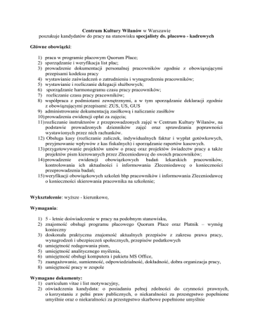 Centrum Kultury Wilanów w Warszawie poszukuje kandydatów do pracy na stanowisku specjalisty ds. płacowo - kadrowych Główne obowiązki: 1) praca w programie płacowym Quorum Płace; 2) sporządzanie i weryfikacja list płac; 3) prowadzenie dokumentacji personalnej pracowników zgodnie z obowiązującymi przepisami kodeksu pracy 4) wystawianie zaświadczeń o zatrudnieniu i wynagrodzeniu pracowników; 5) wystawianie i rozliczanie delegacji służbowych; 6) sporządzanie harmonogramu czasu pracy pracowników; 7) rozliczanie czasu pracy pracowników; 8) współpraca z podmiotami zewnętrznymi, a w tym sporządzanie deklaracji zgodnie z obowiązującymi przepisami: ZUS, US, GUS 9) administrowanie dokumentacją zasiłkową i naliczanie zasiłków 10) prowadzenia ewidencji opłat za zajęcia; 11) rozliczanie instruktorów z przeprowadzonych zajęć w Centrum Kultury Wilanów, na podstawie prowadzonych dzienników zajęć oraz sprawdzania poprawności wystawionych przez nich rachunków. 12) Obsługa kasy (rozliczanie zaliczek, indywidualnych faktur i wypłat gotówkowych, przyjmowanie wpływów z kas fiskalnych) i sporządzanie raportów kasowych. 13) przygotowywanie projektów umów o pracę oraz projektów świadectw pracy a także projektów pism kierowanych przez Zleceniodawcę do swoich pracowników; 14) prowadzenie ewidencji obowiązkowych badań lekarskich pracowników, kontrolowania ich aktualności i informowania Zleceniodawcę o konieczności przeprowadzenia badań; 15) weryfikacji obowiązkowych szkoleń bhp pracowników i informowania Zleceniodawcę o konieczności skierowania pracownika na szkolenie; Wykształcenie: wyższe - kierunkowe, Wymagania: 1) 5 - letnie doświadczenie w pracy na podobnym stanowisku, 2) znajomość obsługi programu płacowego Quorum Płace oraz Płatnik – wymóg konieczny 3) doskonała praktyczna znajomość aktualnych przepisów z zakresu prawa pracy, wynagrodzeń i ubezpieczeń społecznych, przepisów podatkowych 4) umiejętność redagowania pism, 5) umiejętność analitycznego myślenia, 6) umiejętność obsługi komputera i pakietu MS Office, 7) zaangażowanie, sumienność, odpowiedzialność, dokładność, dobra organizacja pracy, 8) umiejętność pracy w zespole Wymagane dokumenty: 1) curriculum vitae i list motywacyjny, 2) oświadczenia kandydata: o posiadaniu pełnej zdolności do czynności prawnych, o korzystaniu z pełni praw publicznych, o niekaralności za przestępstwo popełnione umyślnie oraz o niekaralności za przestępstwo skarbowe popełnione umyślnie 3) oświadczenie kandydata o wyrażeniu zgody na przetwarzanie danych osobowych do celów rekrutacji. Dokumenty należy składać lub przesłać w terminie do dnia 21 listopada 2014 r. na adres: Centrum Kultury Wilanów ul. Kolegiacka 3 02 – 960 Warszawa z dopiskiem: „oferta pracy” Inne informacje: Uprzejmie informujemy, iż zastrzegamy sobie prawo odpowiedzi na wybrane oferty. Oferty odrzucone zostaną komisyjnie zniszczone.