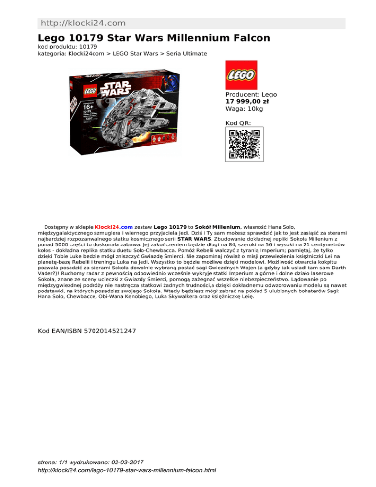 http://klocki24.com Lego 10179 Star Wars Millennium Falcon kod produktu: 10179 kategoria: Klocki24com > LEGO Star Wars > Seria Ultimate Producent: Lego 17 999,00 zł Waga: 10kg Kod QR: Dostępny w sklepie Klocki24.com zestaw Lego 10179 to Sokół Millenium, własność Hana Solo, międzygalaktycznego szmuglera i wiernego przyjaciela Jedi. Dziś i Ty sam możesz sprawdzić jak to jest zasiąść za sterami najbardziej rozpozanwalnego statku kosmicznego serii STAR WARS. Zbudowanie dokładnej repliki Sokoła Millenium z ponad 5000 części to doskonała zabawa. Jej zakończeniem będzie długi na 84, szeroki na 56 i wysoki na 21 centymetrów kolos - dokładna replika statku duetu Solo-Chewbacca. Pomóż Rebelii walczyć z tyranią Imperium; pamiętaj, że tylko dzięki Tobie Luke bedzie mógł zniszczyć Gwiazdę Śmierci. Nie zapominaj rówież o misji przewiezienia księżniczki Lei na planetę-bazę Rebelii i treningu Luka na Jedi. Wszystko to będzie możliwe dzięki modelowi. Możliwość otwarcia kokpitu pozwala posadzić za sterami Sokoła dowolnie wybraną postać sagi Gwiezdnych Wojen (a gdyby tak usiadł tam sam Darth Vader?)! Ruchomy radar z pewnością odpowiednio wcześnie wykryje statki Imperium a górne i dolne działo laserowe Sokoła, znane ze sceny ucieczki z Gwiazdy Śmierci, pomogą zażegnać wszelkie niebezpieczeństwo. Lądowanie po międzygwiezdnej podróży nie nastręcza statkowi żadnych trudności,a dzięki dokładnemu odwzorowaniu modelu są nawet podstawki, na których posadzisz swojego Sokoła. Wtedy będziesz mógł zabrać na pokład 5 ulubionych bohaterów Sagi: Hana Solo, Chewbacce, Obi-Wana Kenobiego, Luka Skywalkera oraz księżniczkę Leię. Kod EAN/ISBN 5702014521247 strona: 1/1 wydrukowano: 02-03-2017 http://klocki24.com/lego-10179-star-wars-millennium-falcon.html