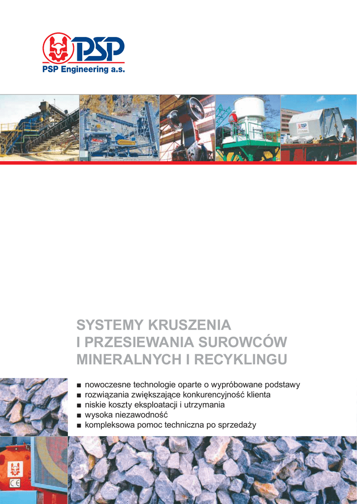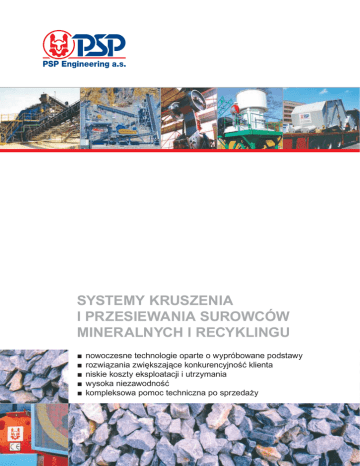 SYSTEMY KRUSZENIA I PRZESIEWANIA SUROWCÓW MINERALNYCH I RECYKLINGU ■ ■ ■ ■ ■ nowoczesne technologie oparte o wypróbowane podstawy rozwiązania zwiększające konkurencyjność klienta niskie koszty eksploatacji i utrzymania wysoka niezawodność kompleksowa pomoc techniczna po sprzedaży SPIS TREŚCI O PSP Engineering Innowacyjne rozwiązanie z jednego źródła .................................. 3 Produkcja w czasie i jakości .......................................................... 5 Pomoc techniczna ......................................................................... 7 Typoszeregi maszyn do przerobu surowców mineralnych ........... 8 Kruszarki Kruszarki szczękowe DCJ i DCD ................................................ 10 Kruszarki stożkowe KDC ............................................................ 14 Kruszarki udarowe ODH i ODN, ODX, ODR .............................. 18 Pionowe kruszarki udarowe ODV ............................................... 22 Kruszarki udarowe młotkowe OKD ............................................. 23 Kruszarki młotkowe do drobnego i średniego kruszenia ............ 24 Kruszarki młotkowe z walcami KDV ........................................... 25 Kruszarki walcowe DVZ i DVR .................................................... 26 Przesiewacze Przesiewacze rezonansowe RT .................................................. 27 Przesiewacze wibracyjne EDT-N i EDT-2N ................................ 28 Przesiewacze wibracyjne KDT .................................................... 30 Przesiewacze wstępne HT .......................................................... 32 Przesiewacze wstępne odgliniające OHT ................................... 33 Zasilacze Zasilacze wibracyjne przesiewające VTP i zasilacze VP ........... 34 Zasilacze wibracyjne rusztowe PVR ........................................... 35 Zasilacze rynnowe ZP ................................................................. 36 Przenośniki płytowe CPLP, CPLD, CPLDT ................................ 37 Rozwiązania projektowe ............................................................. 38 Innowacyjne rozwiązanie z jednego źródła Sukces w środowisku konkurencji charakteryzuje rosnące zapotrzebowanie na jakość i wartość. W związku z jakością konieczne jest nie tylko stosowanie nowoczesnych urządzeń, ale również stworzenie odpowiednich warunków eksploatacji. Badania, testowanie i rozwój, oparty o doświadczenie, jest motorem projektów PSP przynoszących wyższą wartość użytkową naszym klientom. Nasze badania i rozwój są orientowane na następujące dziedziny: obniżanie kosztów inwestycyjnych i eksploatacji wzrost niezawodności wysoka jakość produktu finalnego latwe utrzymanie i długie interwały serwisowe wzrost wydajności Systemy kruszenia i przesiewania dostarczane przez PSP Engineering opierają się o własne zoptymalizowane produktowo typoszeregi kruszarek, przesiewaczy i systemów transportowych. Nasze rozwiązanie jest optymalne z punktu widzenia kosztów, zapewnia wysoką wydajność i niezawodność z uzyskiwaniem żądanej wydajności i parametrów technologicznych zgodnie z wymaganiami naszych klientów. Od jednej maszyny po kompletne wyposażenie PSP Engineering jest przodującym dostawcą maszyn i systemów procesowych oraz urządzeń do produkcji materiałów budowlanych i przerobu surowców mineralnych. PSP Engineering jest tradycyjnie kojarzony z projektowaniem i produkcją urządzeń do: cementowni wapiennic zakładów wzbogacania kruszarni i przesiewalni cegielni i zakładów ceramicznych żwirowni i piaskowni recyklingu odpadu budowlanego metalurgii energetyki przemysłu chemicznego 3 Zwiększanie konkurencyjności naszych klientów PSP Engineering, spadkobierca know-how tradycyjnych czeskich dostawców, posiada oryginalną dokumentację, specyfikacje techniczne i kalkulacje technologii kruszenia i przesiewania, które są zarejestrowane pod nazwami handlowymi: Zastosowanie poszczególnych typoszeregów kruszarek w zależności od wielkości ziarna na wejściu Typoszeregi kruszarek PSP Engineering projektowane do systemów kruszenia Kruszarki szczękowe PSP Zakłady Budowy Maszyn Ciężkich Przerowskie zakłady budowy maszyn Prerov Machinery Pragoinvest Kruszarki stożkowe Kruszarki udarowe PSP Engineering dostarcza oryginalne części według oryginalnej dokumentacji w danych tolerancjach z zastosowaniem najnowszych procedur i innowacji technicznych. Pionowe kruszarki udarowe Kruszarki młotkowe Kruszarki walcowe Profesjonalny projekt na miarę PSP Engineering maksymalizuje wartość z minimalizacją kosztów inwestycyjnych i eksploatacyjnych. Warunkiem jest opracowanie odpowiedniego projektu całego systemu, który uwzględnia potrzeby produkcji, wymagania w zakresie wydajności, specyficzne materiały lub ich charakterystyki i zadaną jakość produktu finalnego. MAKSYMALNA WIELKOŚĆ ZIARNA NA WEJŚCIU 1500 mm 1000 mm 100 mm 10 mm 1 mm Zastosowanie poszczególnych typoszeregów kruszarek w zależności od wielkości ziarna na wyjściu Kruszarki szczękowe Sofistykowane procesy projektowania i konstruowania PSP Engineering korzysta z sofistykowanego Oprogramowania konstrukcyjnego (CAD), metod obliczeniowych (FEM) i testowania (CAT) w celu poprawy parametrów takich, jak wydajność, niezawodność i bezpieczeństwo oraz obniżanie kosztów eksploatacji. Produkty PSP spełniają wymagania norm WE 89/392/EEC, ew. EN 292. Kruszarki stożkowe Kruszarki udarowe Pionowe kruszarki udarowe Kruszarki młotkowe Kruszarki walcowe MAKSYMALNA WIELKOŚĆ ZIARNA NA WYJŚCIU 500 mm 100 mm 50 mm 10 mm 1 mm Zastosowanie poszczególnych typoszeregów przesiewaczy w zależności od zakresu przesiewania Zespoły przesiewaczy PSP Engineering projektowanych dla systemów przesiewania KDT Nadawa KDT Granice przesiewania 2 EDT Nadawa EDT Granice przesiewania 2 RT Nadawa RT Granice przesiewania HT Nadawa 2 HT Granice przesiewania OHT N