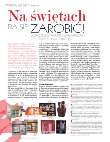 strefa urody Sezon na... Na swietach da się zarobić! Dlaczego warto zamawiać zestawy kosmetyków? Kosmetyki i perfumy od lat pozostają na pierwszym miejscu listy najpopularniejszych prezentów i nic nie wskazuje na to, aby w tym roku miało być inaczej. Właściciele drogerii przyznają, że chętnie korzystają ze świątecznych pakietów, które przygotowują producenci, bo w żadnym innym okresie w roku oferty nie są tak korzystne. – Właściciel sklepu zawsze na pierwszym miejscu musi stawiać potrzeby konsumenta. Wiadomo, że w święta obdarowujemy się prezentami, więc zestawów świątecznych nie może zabraknąć w drogerii – mówi Izabela Turowska, właścicielka hurtowni kosmetyków T&T oraz trzech własnych drogerii, zaangażowana w tworzenie sieci drogerii Sekret Urody. Tak samo myśli Zbigniew Brzeziński działający w sieci Drogerie Laboo. – Absolutnie nie wyobrażam sobie bez zestawów upominkowych świątecznego handlu. Wiadomo, że ludzie szukają w tym okresie prezentów. Kosmetyki są jednymi z najpopularniejszych, 1 więc ile musiałbym poświęcić czasu i energii, żeby złożyć je w ładne zestawy, a tak dostaję wszystko gotowe – tłumaczy. Anna Mierzwa z Częstochowy, właścicielka drogerii działającej w sieci Kosmeteria również stanowczo podkreśla, że okolicznościowe zestawy muszą trafić do jej sklepu przed świętami, przy czym „przed świętami” oznacza wrzesień, ewentualnie początek października. Wtedy właśnie świąteczna oferta już jest dostępna dla konsumentów. Izabela Turowska tłumaczy dlaczego warto zaopatrzyć się w zestawy już we wrześniu: – To dobry moment, bo październik i listopad obfitują w popularne imieniny, jest więc na nie popyt również przed świętami. Myślę, że każdy kto prowadzi sklep powinien zastanowić się w jakim otoczeniu działa, na jakich może liczyć klientów. Jeśli blisko znajdują się szpital, urzędy, banki – elegancko zapakowane kosmetyki zawsze będą się cieszyć zainteresowaniem – podpowiada. dostarczają opakowania i produkty do samodzielnego skomponowania, co właścicielom sklepów bardzo się podoba. Sami detaliści też wychodzą z inicjatywą i nawet z pojedynczych produktów robią prezenty. – Nie tylko zamawiam gotowe zestawy kosmetyczne, ale też kupuję eleganckie woreczki z materiału – jest ich teraz duży wybór – i ekspedientki pakują w nie pojedyncze produkty, które klient wybierze z półki. W takim woreczku pięknie wygląda nawet jedna maskara, pomadka czy błyszczyk – opowiada Izabela Turowska. Elżbieta Rogula, prowadząca drogerię Elraj w Włoszczowie, zaopatruje sklep przed świętami w folię i wstążeczki – ekspedientki używają ich do przygotowywania upominków. Własne kompozycje przygotowuje też Anna Mierzwa. Obie panie podkreślają, że zależy im na tym, żeby każdy mógł kupić prezent, nawet jak ma na niego tylko 10 zł. Na każdą kieszeń Potencjał zestawów kosmetycznych pozwala wykorzystać ich uniwersalny sposób podania. Producenci już dawno odeszli od opakowań i ozdób typowo bożonarodzeniowych, by nie ograniczać sprzedaży do zaledwie kilku tygodni. Kosmetyki są zapakowane w eleganckie pudełeczka, skrzynie, torebki. Są marki, które 1 Zestawy kosmetyków hipoalergicznych Biały Jeleń dla kobiet i dla mężczyzn. W każdym zestawie znajduje się żel pod prysznic, produkt do higieny intymnej (w wersji dla mężczyzn – żel, w wersji dla kobiet – emulsja), żel do mycia twarzy oraz szampon do włosów. POLLENA OSTRZESZÓW, cena: ok. 29 zł 3 2 2 Zestaw żel pod prysznic i mleczko do ciała Fa Sensual oraz dezodorant Fa Nutri Skin w modnej kosmetyczce. HENKEL POLSKA, cena: ok. 25 zł 3 Zestaw prezentowy kosmetyków kąpielowych o zapachu wanilii w dużej, efektownej drewnianej skrzyni. W zestawie znajdują się: żel pod prysznic 300 ml, płyn do kąpieli 300 ml, masło do ciała 280 ml, peeling do ciała (280 ml), sól do kąpieli (400 ml), drewniany przyrząd do masażu, gąbka do mycia, 2 separatory do paznokci. DEX PLUS, cena: 99,00 zł 4 Cuba Gold – linia zapachowa znanej marki, produkowanej we Francji. W skład zestawu wchodzą woda toaletowa 100 ml, after shave 100 ml, dezodorant 200 ml, woda toaletowa cygaro 35 ml. Opakowanie stanowi estetyczne drewniane wiaderko. WIT, cena: ok. 67 zł 4 5 Zestaw z kosmetykami Argan Oil – kreator gładkiej skóry – wygładzający krem na dzień + mleczko do demakijażu. MINCER 6 Eccoinnobation – krem przeciwzmarszczkowy na dzień i na noc + Maska nawilżająca Intensywne odżywianie z ekstraktem z brzoskwini i olejem arganowym program Brzoskwiniowa Cera w jednym zestawie. MINCER 7 5 8 6 68 Wiadomości Kosmetyczne – październik 2012 7 Jeanne Arthes ~ Boum – zestaw: woda perfumowana dla kobiet 100 ml + perfumowany dezodorant 200 ml. Boum to kwiatowo-owocowy zapach dla kobiet. W nutach głowy wyczuwalny jest zapach truskawek i czarnej porzeczki. Nuty serca to kwiatowy bukiet piwonii, fiołków, irysa, frezji i róż z akordem liści świeżych malin. Ciepłe i drzewne nuty bazy tworzą drzewo sandałowe, ambra, cedr i białe piżmo. Boum zostawia na skórze słodki i atrakcyjny zapach owocowego lizaka. DEX PLUS, cena: 54,90 zł 8 Zesatw Whisky Men zawiera wodę toaletową 100 ml i dezodorant 75 ml. To subtelne aromaty cedru, piżma i bergamotki – urokliwy i zdecydowany zapach. WIT, cena: 35 zł