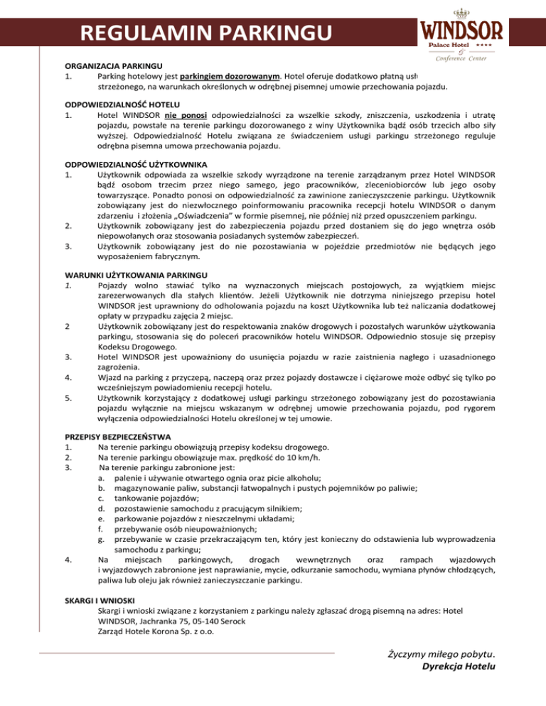 REGULAMIN PARKINGU ORGANIZACJA PARKINGU 1. Parking hotelowy jest parkingiem dozorowanym. Hotel oferuje dodatkowo płatną usługę parkingu strzeżonego, na warunkach określonych w odrębnej pisemnej umowie przechowania pojazdu. ODPOWIEDZIALNOŚĆ HOTELU 1. Hotel WINDSOR nie ponosi odpowiedzialności za wszelkie szkody, zniszczenia, uszkodzenia i utratę pojazdu, powstałe na terenie parkingu dozorowanego z winy Użytkownika bądź osób trzecich albo siły wyższej. Odpowiedzialność Hotelu związana ze świadczeniem usługi parkingu strzeżonego reguluje odrębna pisemna umowa przechowania pojazdu. ODPOWIEDZIALNOŚĆ UŻYTKOWNIKA 1. Użytkownik odpowiada za wszelkie szkody wyrządzone na terenie zarządzanym przez Hotel WINDSOR bądź osobom trzecim przez niego samego, jego pracowników, zleceniobiorców lub jego osoby towarzyszące. Ponadto ponosi on odpowiedzialność za zawinione zanieczyszczenie parkingu. Użytkownik zobowiązany jest do niezwłocznego poinformowaniu pracownika recepcji hotelu WINDSOR o danym zdarzeniu i złożenia „Oświadczenia” w formie pisemnej, nie później niż przed opuszczeniem parkingu. 2. Użytkownik zobowiązany jest do zabezpieczenia pojazdu przed dostaniem się do jego wnętrza osób niepowołanych oraz stosowania posiadanych systemów zabezpieczeń. 3. Użytkownik zobowiązany jest do nie pozostawiania w pojeździe przedmiotów nie będących jego wyposażeniem fabrycznym. WARUNKI UŻYTKOWANIA PARKINGU 1. Pojazdy wolno stawiać tylko na wyznaczonych miejscach postojowych, za wyjątkiem miejsc zarezerwowanych dla stałych klientów. Jeżeli Użytkownik nie dotrzyma niniejszego przepisu hotel WINDSOR jest uprawniony do odholowania pojazdu na koszt Użytkownika lub też naliczania dodatkowej opłaty w przypadku zajęcia 2 miejsc. 2 Użytkownik zobowiązany jest do respektowania znaków drogowych i pozostałych warunków użytkowania parkingu, stosowania się do poleceń pracowników hotelu WINDSOR. Odpowiednio stosuje się przepisy Kodeksu Drogowego. 3. Hotel WINDSOR jest upoważniony do usunięcia pojazdu w razie zaistnienia nagłego i uzasadnionego zagrożenia. 4. Wjazd na parking z przyczepą, naczepą oraz przez pojazdy dostawcze i ciężarowe może odbyć się tylko po wcześniejszym powiadomieniu recepcji hotelu. 5. Użytkownik korzystający z dodatkowej usługi parkingu strzeżonego zobowiązany jest do pozostawiania pojazdu wyłącznie na miejscu wskazanym w odrębnej umowie przechowania pojazdu, pod rygorem wyłączenia odpowiedzialności Hotelu określonej w tej umowie. PRZEPISY BEZPIECZEŃSTWA 1. Na terenie parkingu obowiązują przepisy kodeksu drogowego. 2. Na terenie parkingu obowiązuje max. prędkość do 10 km/h. 3. Na terenie parkingu zabronione jest: a. palenie i używanie otwartego ognia oraz picie alkoholu; b. magazynowanie paliw, substancji łatwopalnych i pustych pojemników po paliwie; c. tankowanie pojazdów; d. pozostawienie samochodu z pracującym silnikiem; e. parkowanie pojazdów z nieszczelnymi układami; f. przebywanie osób nieupoważnionych; g. przebywanie w czasie przekraczającym ten, który jest konieczny do odstawienia lub wyprowadzenia samochodu z parkingu; 4. Na miejscach parkingowych, drogach wewnętrznych oraz rampach wjazdowych i wyjazdowych zabronione jest naprawianie, mycie, odkurzanie samochodu, wymiana płynów chłodzących, paliwa lub oleju jak również zanieczyszczanie parkingu. SKARGI I WNIOSKI Skargi i wnioski związane z korzystaniem z parkingu należy zgłaszać drogą pisemną na adres: Hotel WINDSOR, Jachranka 75, 05-140 Serock Zarząd Hotele Korona Sp. z o.o. Życzymy miłego pobytu. Dyrekcja Hotelu