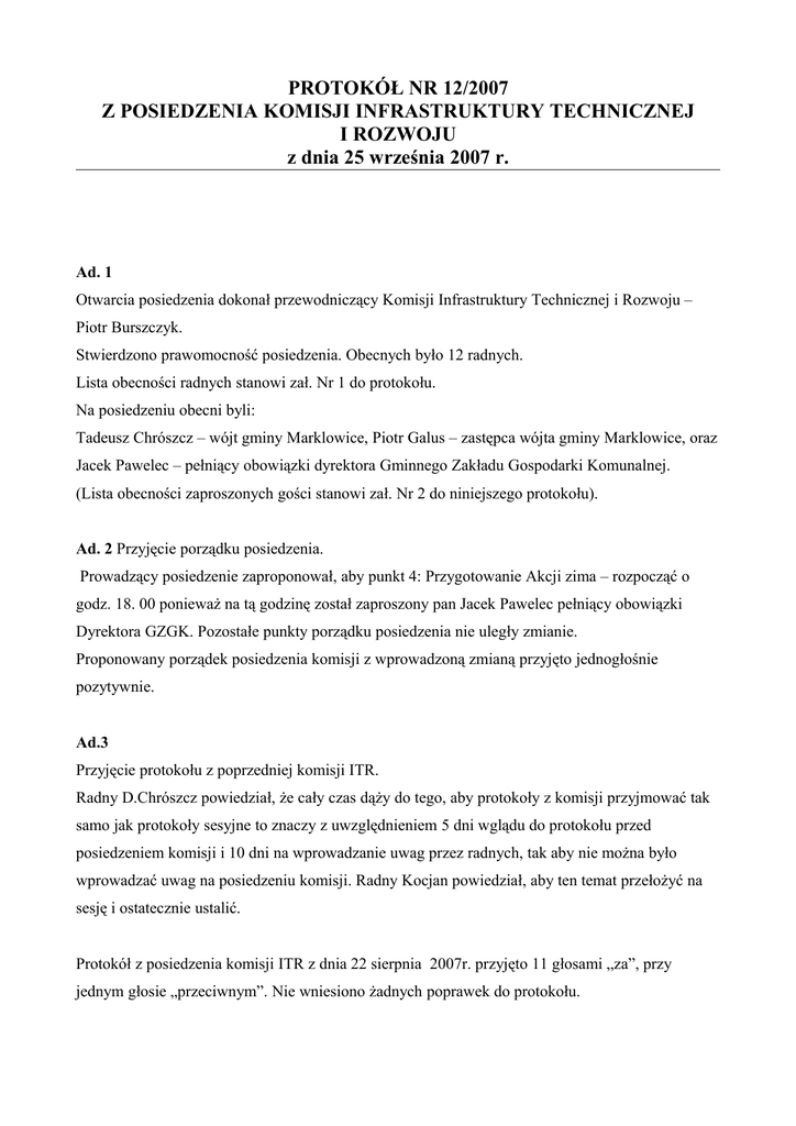 PROTOKÓŁ NR 12/2007 Z POSIEDZENIA KOMISJI INFRASTRUKTURY TECHNICZNEJ I ROZWOJU z dnia 25 września 2007 r. Ad. 1 Otwarcia posiedzenia dokonał przewodniczący Komisji Infrastruktury Technicznej i Rozwoju – Piotr Burszczyk. Stwierdzono prawomocność posiedzenia. Obecnych było 12 radnych. Lista obecności radnych stanowi zał. Nr 1 do protokołu. Na posiedzeniu obecni byli: Tadeusz Chrószcz – wójt gminy Marklowice, Piotr Galus – zastępca wójta gminy Marklowice, oraz Jacek Pawelec – pełniący obowiązki dyrektora Gminnego Zakładu Gospodarki Komunalnej. (Lista obecności zaproszonych gości stanowi zał. Nr 2 do niniejszego protokołu). Ad. 2 Przyjęcie porządku posiedzenia. Prowadzący posiedzenie zaproponował, aby punkt 4: Przygotowanie Akcji zima – rozpocząć o godz. 18. 00 ponieważ na tą godzinę został zaproszony pan Jacek Pawelec pełniący obowiązki Dyrektora GZGK. Pozostałe punkty porządku posiedzenia nie uległy zmianie. Proponowany porządek posiedzenia komisji z wprowadzoną zmianą przyjęto jednogłośnie pozytywnie. Ad.3 Przyjęcie protokołu z poprzedniej komisji ITR. Radny D.Chrószcz powiedział, że cały czas dąży do tego, aby protokoły z komisji przyjmować tak samo jak protokoły sesyjne to znaczy z uwzględnieniem 5 dni wglądu do protokołu przed posiedzeniem komisji i 10 dni na wprowadzanie uwag przez radnych, tak aby nie można było wprowadzać uwag na posiedzeniu komisji. Radny Kocjan powiedział, aby ten temat przełożyć na sesję i ostatecznie ustalić. Protokół z posiedzenia komisji ITR z dnia 22 sierpnia 2007r. przyjęto 11 głosami „za”, przy jednym głosie „przeciwnym”. Nie wniesiono żadnych poprawek do protokołu. Ad. 5 Rozpatrzenie kwestii poszerzenia boiska przy SP-3. Zastępca wójta P.Galus przedstawił lotnicze zdjęcie boiska przy SP-3, i poinformował, że odbyła się wizja lokalna boiska przy SP-3. Na tym terenie wchodzi pełnowymiarowe boisko o parametrach 20/40 m . Można również zagospodarować skarpę mieszcząca sie pomiędzy budynkiem szkoły a boiskiem. Problem stanowi nachylenie boiska. To nachylenie należy zniwelować jak również można zagospodarować skarpę. Wskazane byłoby wykonanie oświetlenia boiska przy pozyskaniu środków unijnych. Przewodniczący Burszczyk powiedział, że był przy szkole około godz. 12.00 wraz z zastępcą wójta i furtka na boisko była zamknięta. Radny Karwot zapytał, czy była brana pod uwagę możliwość innej lokalizacji boiska w okolicy tej szkoły? Boisko często jest zajęte i młodzież nie ma gdzie grać. Radny Grzesik powiedział, że jak przejeżdża obok boisk w niedzielę czy sobotę to widzi, że kilku chłopaków 3-4 gra w piłkę to tak ich chwali, bo naprawdę nie widzi zainteresowania młodzieży sportem. Na turnieje młodzież bardzo trudno jest przyciągnąć i w ogóle trudno jest przyciągnąć młodych ludzi do sportu. Za darmo turniej był przygotowany z nagrodami a z trudem kilka drużyn udało się zmobilizować. Radny Burszczyk powiedział, że kwestia budowy nowego boiska nie była podejmowana. Uważa, że lepiej byłoby zrobić przy szkole na Dolanku boisko lekkoatletyczne dla uprawiania innych rodzajów dyscyplin sportowych. Słyszał, że ma być również wykonany kort przy górnym boisku. Zastępca wójta poinformował, że na boiskach przy POLONII można jeszcze uruchomić dodatkowe nawierzchnie, na razie wysypane w czerwonym kamieniu. Radny Karwot odpowiedział, że na Górnioku jest kilka placów do gry w piłkę nożną zrobionych za zgodą właścicieli na terenach prywatnych (np. na ul. Rzemieślniczej lub koło p. Rogus) i tam dzieci i młodzież najchętniej idą grać. Na boisku przy szkole przychodzą zobaczyć czy jest wolne boisko i muszą odejść, gdy przyjdzie kilku starszych. Ostatecznie po dyskusji wnioskowano o: Modernizację boiska przy SP-3 w tych wymiarach jakie są obecnie. Powyższy wniosek przyjęto jednogłośnie pozytywnie. Ad. 8. Lokalizacja budynku nowego przedszkola. Zastępca wójta przedstawił zdjęcie lotnicze terenu w okolicy ul. Widokowej na którym planowane jest wzniesienie budynku przedszkola. W planie jest również przedłużenie ul. Widokowej. Radny Damian Chrószcz zapytał, od której strony to przedszkole mogłoby stanąć; od strony ul. W. Ludów czy od strony ul. Widokowej? Przewodniczący Brychcy zapytał, czy od linii wysokiego napięcia będzie zachowana tzw. strefa ochronna. Zastępca wójta pokazał tą część, która stanowi strefę ochronną. Jest to miejsce nie na stały pobyt , to znaczy nie nadające sie na żadna zabudowę. Natomiast reszta działki duży teren jest odpowiedni pod zabudowę. Gdzie będzie wejście do szkoły to zależy od projektanta. Radna Teresa Machnica pytała z której strony będzie wjazd na teren przedszkola , oraz proponowała, aby zrezygnować z budowy drogi znajdującej się w planie zagospodarowania przestrzennego. Radny L.Fojcik powiedział, że dróg nigdy nie jest za dużo. Przy szkole też jest pełno dróg z każdej strony a i tak rano nie ma gdzie postawić auto. Zastępca wójta Piotr Galus powiedział, że droga przewidziana w planie zagospodarowania powinna być zrobiona. Radny Karwot powiedział, że tą sprawę trzeba zostawić na później ponieważ teraz nie da się tej sprawy rozstrzygnąć. Po dyskusji wnioskowano o: Lokalizację budynku przedszkola na ul. Widokowej, na terenie gminnym oznaczonym w planie zagospodarowania symbolem 49 UP. Powyższy wniosek przyjęto jednogłośnie pozytywnie. Ad. 6. Rozpatrzenie sprawy przejęcia mieszkań nauczycielskich przez SP-1 na potrzeby szkoły – pismo dyrektora SP-1 w sprawie adaptacji lokalu mieszkalnego na potrzeby szkoły (NR SP1/171/2007) - oraz problematyka dotycząca gminnego zasobu mieszkań komunalnych – ref. j.w. Zastępca wójta P.Galus poinformował, że pani Pustołka zwróciła mieszkanie nauczycielskie o powierzchni 46 m2. Są to dwa pokoje, kuchnia i łazienka. Mi