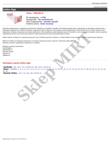 Informacje o produkcie Utworzono 02-03-2017 Łóżko Aga Cena : 299,00 zł Nr katalogowy : L-001 Dostępność : Na zamówienie Stan magazynowy : bardzo wysoki Średnia ocena : brak recenzji Łóżeczka produkowane z największą starannością i dbałością o wszystkie szczegółu. Dla bezpieczeństwa dzieci zaokrąglone są wszystkie możliwe kanty, a krawędzie zabezpieczone miękkim obrzeżem, podniesione boki w łóżeczku, aby zapobiec przed wypadnięciem dziecka podczas snu. Łóżko zrobione jest z białej płyty meblowej z bajecznym akcentem graficznym, który dodatkowo został zabezpieczonym laminatem w celu zwiększenia trwałości nadruku podczas użytkowania /można myć ściereczką z płynem/. Łóżko przeznaczone jest do samodzielnego montażu. M IR T Piękny nadruk na łóżeczku z pewnością przyczyni się, iż Państwa pociechy chętniej i z radością będą chciały zasypiać w swoim wymarzonym łóżeczku. Materac do łóżka ze ściąganym pokrowcem /w losowo wybranym wzorze i kolorze/ i drewniany stelaż GRATIS! Łóżeczko może być wyposażone dodatkowo w szufladę. Dostępne wymiary zewnętrzne: 144x74x69cm 164x84x69 cm Wymiary spania: 140x70 cm 160x80 cm Dostępne opcje Łóżko Aga Szuflada: NIE, 144 x 74 (+100,00 zł), 164 x 84 (+110,00 zł). Wzór: WYBIERZ, 1, 2, 3, 4, 5, 6, 7, 8, 9, 10, 11, 12, 13, 14, 15, 16, 17, 18, 19, 20, 21, 22, 23, 24, 25, 26, 27, 28, 29, 30, 31, 32, 33, 34, 35, 36. Sk le p Wymiar łóżka: 144 x 74, 164 x 84 (+90,00 zł). Wygenerowano w programie www.oscGold.com