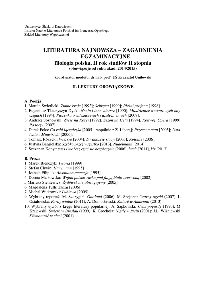 Uniwersytet Śląski w Katowicach Instytut Nauk o Literaturze Polskiej im. Ireneusza Opackiego Zakład Literatury Współczesnej LITERATURA NAJNOWSZA – ZAGADNIENIA EGZAMINACYJNE filologia polska, II rok studiów II stopnia (obowiązuje od roku akad. 2014/2015) koordynator modułu: dr hab. prof. UŚ Krzysztof Uniłowski II. LEKTURY OBOWIĄZKOWE A. Poezja 1. Marcin Świetlicki: Zimne kraje [1992]; Schizma [1999]; Pieśni profana [1998]. 2. Eugeniusz Tkaczyszyn-Dycki: Nenia i inne wiersze [1990]; Młodzieniec o wzorowych obyczajach [1994]; Piosenka o zależnościach i uzależnieniach [2008]. 3. Andrzej Sosnowski: Życie na Korei [1992], Sezon na Helu [1994], Konwój. Opera [1999], Po tęczy [2007]. 4. Darek Foks: Co robi łączniczka [2005 – wspólnie z Z. Liberą]; Przecena map [2005]; Ustalenia z Maastricht [2006]. 5. Tomasz Różycki: Wiersze [2004]; Dwanaście stacji [2005]; Kolonie [2006]. 6. Justyna Bargielska: Szybko przez wszystko [2013], Nudelmann [2014]. 7. Szczepan Kopyt: yass / możesz czuć się bezpiecznie [2006], buch [2011], kir [2013] B. Proza 1. Marek Bieńczyk: Tworki [1999] 2. Stefan Chwin: Hanemann [1995] 3. Izabela Filipiak: Absolutna amnezja [1995] 4. Dorota Masłowska: Wojna polsko-ruska pod flagą biało-czerwoną [2002] 5.Mariusz Sieniewicz: Żydówek nie obsługujemy [2005] 6. Magdalena Tulli: Skaza [2006] 7. Michał Witkowski: Lubiewo [2005] 9. Wybrany reportaż: M. Szczygieł: Gottland (2006), M. Szejnert: Czarny ogród (2007), L. Ostałowska: Farby wodne (2011), A. Domosławski: Śmierć w Amazonii (2013) 10. Wybrany utwór z kręgu literatury popularnej: A. Sapkowski: Czas pogardy (1995); M. Krajewski: Śmierć w Breslau (1999); K. Grochola: Nigdy w życiu (2001); J.L. Wiśniewski: S@motność w sieci (2001) 2 I. ZAGADNIENIA EGZAMINACYJNE 1. Rok 1989 – cezura czy przełom? Periodyzacja życia literackiego po 1989 (cezury 1996 i 2002 roku) materiały*: M. Janion: Zmierzch paradygmatu. W: tejże: „Czy będziesz wiedział, co przeżyłeś”. Warszawa 1996, s. 5-23; J. Sławiński: Zanik centrali. „Kresy” 1994, nr 2 (18) (przedruk w: tegoż: Prace wybrane. T. 5: Przypadki poezji. Kraków 2001, s. 335-339). opracowanie: M. Pietrzak: Przełom czy ciągłość: 1989. W zbiorze: Literatura polska 19902000. Pod red. T. Cieślaka i K. Pietrych. Kraków 2002, t. 1, s. 11-28. 2. Nowe czasopisma literackie lat 90. (np. „bruLion”, „Czas Kultury”, „FA-art”, „Kresy”, „Nowy Nurt”) materiały: roczniki wybranych czasopism (do przejrzenia). opracowania: P. Czapliński: Niezależność (O dziedzictwie „bruLionu”). W: tegoż: Ruchome marginesy. Szkice o literaturze lat 90.). Kraków 2002, s. 43-59; Leksykon pism społecznokulturalnych w Polsce. Red. J. Gałuszka, G. Maroszczuk, A. Nęcka. Katowice 2009 [hasła dot. wybranych czasopism]. 3. Medialne i rynkowe uwarunkowania życia literackiego materiały: J. Jarzębski: Apetyt na Przemianę. Notatki o prozie współczesnej. Kraków 1998 [wybrane teksty]; K. Dunin: Normalka. W antologii: Była sobie krytyka… Wybór tekstów z lat dziewięćdziesiątych i pierwszych. Oprac. D. Nowacki i K. Uniłowski. Katowice 2003, s. 92-99 (pierwodruk: „Megaron”. Dod. do „Kurier Czytelniczy”, nr 65, 2000). opracowania: D. Nowacki: Dwanaście groszy. Wokół prozy polskiej lat dziewięćdziesiątych. W: tegoż: Zawód: czytelnik. Notatki o prozie polskiej lat 90. Kraków 1999, s. 14-37; tegoż: Spełnienia wyższego rzędu. O spotkaniach literatury z medialnością i pragnieniach pisarzy. W: tegoż: Kto im dał skrzydła. Uwagi o prozie, dramacie i krytyce (2001-2010). Katowice 2011, s. 116-159. 4. Postmodernizm – polska recepcja materiały: W. Bolecki: Polowanie na postmodernistów (w Polsce). „Teksty Drugie” 1993, nr 1 (lub tegoż: Polowanie na postmodernistów (w Polsce) i inne szkice. Kraków 1999, s. 2142); T. Komendant: Czy ujrzę postmodernizm w Warszawie? „Res Publica Nowa” 1993, nr 9. opracowanie: K. Uniłowski: 1989 – inicjacja postmodernizmu. W zbiorze: Przypadki krytyczne. Studia i szkice o krytyce, życiu oraz świadomości literackiej po roku 1918. Pod red. D. Nowackiego i K. Uniłowskiego. Katowice 2007, s. 143-151. 5. Literatura „małych ojczyzn”. Hanemann (1995) Stefana Chwina materiały: L. Szaruga: Pisanie Polski. W: tegoż: Dochodzenie do siebie. Wybrane wątki literatury po roku 1989. Sejny 1997, s. 6-15 (przedruk w antologii: Była sobie krytyka… Wybór tekstów z lat dziewięćdziesiątych i pierwszych. Oprac. D. Nowacki i K. Uniłowski. Katowice 2003, s. 74-82). opracowanie: P. Czapliński: Mapa, córka nostalgii. W: tegoż: Wzniosłe tęsknoty. Nostalgie w prozie lat dziewięćdziesiątych. Kraków 2001, s. 105-128 (inna wersja: Literatura małych ojczyzn – koniec i początek. W zbiorze: Pisać poza rok 2000. Studia i szkice literackie. Red. A. Lam, T. Wroczyński. Warszawa 2002, s. 110-127). * Teksty wymieniane w rubrykach „materiały” oraz „opracowania” mają służyć pomocą przy samodzielnym opracowaniu zagadnień egzaminacyjnych. 3 6. Problem literatury kobiecej. Absolutna amnezja (1995) Izabeli Filipiak materiały: I. Filipiak: Literatura monstrualna. „Biuletyn OŚki” 1999, nr 1 (4) [wersja pdf: www.oska.org.pl/biuletyn/3/39.pdf] opracowania: M. Janion: Ifigenia w Polsce [dot. I. Filipiak: Absolutna amnezja]. W: tejże: Kobiety i duch inności. Warszawa 1996 (wyd. II: 2006, s. 320-345). 7. Patroni młodej poezji po roku 1989 (P. Sommer, B. Zadura, F. O’Hara) materiały: „Literatura na świecie” 1986, nr 7 [numer nt. „szkoły nowojorskiej” – wybrane materiały]; J. Kornhauser: Bohdana Zadury kłopoty wychowawcze. W: tegoż: Poezja i codzienność. Kraków 2003, s. 212-219. opracowania: A. Skrendo: Poezja okolicznościowa. W zbiorze: W wierszu i między wierszami. Szkice o poezji Bohdana Zadury. Poznań 2013, s. 29-35; T. Cieślak: „bruLion” i młodsi wobec Sommera albo kim jest Sommer dla nowej polskiej poezji. W zbiorze: Wyra