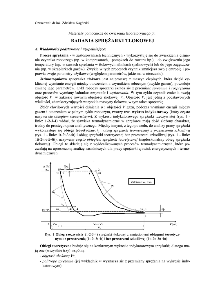 Opracował: dr inż. Zdzisław Nagórski Materiały pomocnicze do ćwiczenia laboratoryjnego pt.: BADANIA SPRĘŻARKI TŁOKOWEJ A. Wiadomości podstawowe i uzupełniające: Proces sprężania - w zastosowaniach technicznych - wykorzystuje się do zwiększenia ciśnienia czynnika roboczego (np. w kompresorach, pompkach do roweru itp.), do zwiększenia jego temperatury (np. w suwach sprężania w tłokowych silnikach spalinowych) lub do jego zagęszczania (np. w skraplarkach gazów). Zwykle w tych procesach czynnik zmniejsza swoją entropię i poprawia swoje parametry użytkowe (względem parametrów, jakie ma w otoczeniu). Jednostopniowa sprężarka tłokowa jest najprostszą z maszyn cieplnych, która dzięki cyklicznej wymianie energii między otoczeniem a czynnikiem roboczym (zwykle gazem), powoduje zmianę jego parametrów. Cykl roboczy sprężarki składa się z przemian: sprężania i rozprężania oraz procesów wymiany ładunku: zasysania i wytłaczania. W tym cyklu czynnik zmienia swoją objętość V w zakresie równym objętości skokowej Vs. Objętość Vs jest jedną z podstawowych wielkości, charakteryzujących wszystkie maszyny tłokowe, w tym także sprężarkę. Zbiór chwilowych wartości ciśnienia p i objętości V gazu, podczas wymiany energii między gazem i otoczeniem w pełnym cyklu roboczym, tworzy tzw. wykres indykatorowy (który często nazywa się obiegiem rzeczywistym). Z wykresu indykatorowego sprężarki rzeczywistej (rys. 1 linie: 1-2-3-4) widać, że zjawiska termodynamiczne w sprężarce mają dość złożony charakter, trudny do prostego opisu analitycznego. Między innymi, z tego powodu, do analizy pracy sprężarki wykorzystuje się obiegi teoretyczne, tj.: obieg sprężarki teoretycznej z przestrzenia szkodliwą (rys. 1 - linie: 1t-2t-3t-4t) i obieg sprężarki teoretycznej bez przestrzeni szkodliwej (rys. 1 - linie: 1tt-2tt-3tt-4tt), nazywany często obiegiem sprężarki teoretycznej (najdoskonalszy obieg sprężarki tłokowej). Obiegi te składają się z wyidealizowanych procesów termodynamicznych, które pozwalają na uproszczoną analizę zasadniczych dla pracy sprężarki zjawisk energetycznych i termodynamicznych. ∆p2 3 3tt 3t p [Pa] pzb y 2t 2tt Założenie: m s = mr ms mr V4 pot =pb 4tt 4t 4 x 1tt 1t ∆p1 1 0 Vsz Vs = Vtt V1 V [m3] Rys. 1 Obieg rzeczywisty (1-2-3-4) sprężarki tłokowej z naniesionymi obiegami teoretycznymi: z przestrzenią (1t-2t-3t-4t) i bez przestrzeni szkodliwej (1tt-2tt-3tt-4tt) Obiegi teoretyczne buduje się na konkretnym wykresie indykatorowym sprężarki; dlatego mają one (wszystkie trzy) wspólną: - objętość skokową Vs, - politropę sprężania (jej wykładnik m wyznacza się z przemiany sprężania na wykresie indykatorowym). Z. Nagórski. Materiały pomocnicze do ćw. laboratoryjnego pt.: Badania sprężarki tłokowej Ponadto obiegi teoretyczne sprężarki (jednostopniowej) mają taki sam spręż νtt = νt = ν = pmax /pmin, tzn.: - ciśnienie minimalne pmin, równe zwykle ciśnieniu otoczenia pot, - ciśnienie maksymalne pmax, równe ciśnieniu gazu w zbiorniku pzb. Obieg rzeczywisty sprężarki ma taką samą wartość sprężu, jak obiegi teoretyczne. Politropa sprężania ma podstawowe znaczenie dla funkcjonowania sprężarki. Decyduje ona m. in. o pracy włożonej w proces sprężania oraz o intensywności wymiany ciepła między gazem i otoczeniem; czynniki te decydują o konstrukcji i cechach eksploatacyjnych sprężarki (jako maszyny). Zwykle w sprężarkach tłokowych przemiana sprężania jest politropą o wykładniku m z przedziału: (izoterma) 1 < m < k (izentropa). (Wartości m > k są charakterystyczne dla politrop sprężania gazu w sprężarkach wirnikowych). W celu pełniejszego zrozumienia zjawisk towarzyszących sprężaniu politropowemu, należy przypomnieć, jakie relacje łączą wykładnik politropy m, pracę la i ciepło q wymieniane przez sprężany czynnik z otoczeniem. Wyobraźmy sobie pewną masę gazu doskonałego, zawartą pod tłokiem w cylindrze sprężarki. Niech na powierzchniach otaczających gaz będzie specjalna powłoka, która raz będzie doskonałym izolatorem, raz chłodnicą, a raz grzejnikiem (rys. 2). Początkowy stan gazu i równowagi mechanicznej opisuje punkt 1, tj. objętość V1, ciśnienie p1 i siła równoważąca P1. Bardzo powolne działanie siłą P1 na tłok, na drodze dx, oznacza wykonanie elementarnej pracy dla nad gazem, zgodnie z równaniem dla = − P1 ⋅ dx = − p1 ⋅ F ⋅ dx = − p1 ⋅ dV gdzie F jest powierzchnią tłoka, a dV = F . dx - zmianą objętości gazu. Przy sprężaniu objętość gazu maleje (dV< 0) kosztem pracy absolutnej dla > 0 włożonej w gaz (praca ta, zwana także pracą zmiany objętości jest dodatnia (wg. def. dla = -∫ p.dV), gdy powiększa się zasób energii gazu). Pojawia się tu pytanie, jak po tym wkładzie pracy, zmieni się ciśnienie gazu? Co decyduje o tym, że może być ono stałe, może wzrosnąć lub zmniejszyć się? Wyjaśnienie podaje I Zasada Termodynamiki dla układów zamkniętych. Wiadomo, że zmianę energii wewnętrznej du gazu może spowodować wkład pracy absolutnej dla i (lub) ciepła dq, zgodnie z równaniem du = dq + dla Przeanalizujmy zmianę energii wewnętrznej du gazu, dla tego samego wkładu pracy absolutnej dla = const., w zależności od tego czy cylinder jest: - izolowany (dq = 0) brak wymiany ciepła między gazem i otoczeniem: dla = du, m = k, - chłodzony (dq < 0) tak, że ma stałą temperaturę (dT = 0): dla = - dq, m = 1, - chłodzony (dq << 0) tak intensywnie, że ma stałe ciśnienie (dp = 0), dla = - dq + du, m = 0, - ogrzewany (dq > 0), m > k > ∞. a) b) p [Pa] T [K] T2z V1 2z V2S T p2z p2S p2T p1=p2p S z 1< m < k 2z 2S T2S 2S p1 2T 2p p T1=T2T 1 2T b 0<m<1 T2p 0 dV V1 V [m3] a -P1 dla = Specjalna powłoka dq dx -2- 1 2p S2p -P1 . dx = const. S2T Sa Sb S1 S [J/K] Z. Nagórski. Materiały pomocnicze do ćw. laboratoryjnego pt.: Badania sprężarki tłokowej Rys. 2