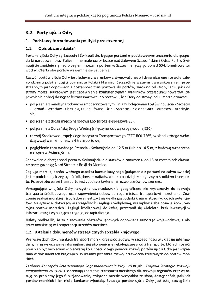 StudiumintegracjipolskiejczęścipograniczaPolskiiNiemiec–rozdziałIII 3.2. Porty ujścia Odry 1. Podstawy formułowania polityki przestrzennej 1.1. Opis obszaru działań Portami ujścia Odry są Szczecin i Świnoujście, będące portami o podstawowym znaczeniu dla gospo‐ darki narodowej, oraz Police i inne małe porty leżące nad Zalewem Szczecińskim i Odrą. Port w Świ‐ noujściu znajduje się nad brzegiem morza i z portem w Szczecinie łączy go ponad 60‐kilometrowy tor wodny. Oferta obu portów wzajemnie się uzupełnia. Rozwój portów ujścia Odry jest jednym z warunków zrównoważonego i dynamicznego rozwoju całe‐ go obszaru polskiej części pogranicza Polski i Niemiec. Szczególnie ważnym uwarunkowaniem prze‐ strzennym jest odpowiednia dostępność transportowa do portów, zarówno od strony lądu, jak i od strony morza. Kluczowym jest zapewnienie konkurencyjnych warunków przeładunku towarów. Za‐ pewnienie dobrej dostępności transportowej do portów ujścia Odry od strony lądu i morza oznacza: połączenia z międzynarodowymi zmodernizowanymi liniami kolejowymi E59 Świnoujście ‐ Szczecin ‐ Poznań ‐ Wrocław ‐ Chałupki, i C‐E59 Świnoujście ‐ Szczecin ‐ Zielona Góra ‐ Wrocław ‐ Międzyle‐ sie, połączenie z drogą międzynarodową E65 (drogą ekspresową S3), połączenie z Odrzańską Drogą Wodną (międzynarodową drogą wodną E30), rozwój Środkowoeuropejskiego Korytarza Transportowego CETC‐ROUTE65, w skład którego wcho‐ dzą wyżej wymienione szlaki transportowe, pogłębienie toru wodnego Szczecin ‐ Świnoujście do 12,5 m (lub do 14,5 m, z budową wrót sztor‐ mowych w Świnoujściu). Zapewnienie dostępności portu w Świnoujściu dla statków o zanurzeniu do 15 m zostało zablokowa‐ ne przez gazociąg Nord Stream z Rosji do Niemiec. Żegluga morska, oprócz ważnego aspektu komunikacyjnego (połączenia z portami na całym świecie) jest – podobnie jak żegluga śródlądowa – najtańszym i najbardziej ekologicznym środkiem transpor‐ tu. Rozwój obu gałęzi transportu jest zgodny z kryteriami rozwoju zrównoważonego. Występujące w ujściu Odry korzystne uwarunkowania geograficzne nie wystarczyły do rozwoju transportu śródlądowego oraz zapewnienia odpowiedniego miejsca transportowi morskiemu. Zna‐ czenie żeglugi morskiej i śródlądowej jest zbyt niskie dla gospodarki kraju w stosunku do ich potencja‐ łów. Na sytuację, dotyczącą w szczególności żeglugi śródlądowej, ma wpływ słaba pozycja konkuren‐ cyjna portów morskich i żeglugi śródlądowej, do której przyczynił się wieloletni brak inwestycji w infrastrukturę i wynikająca z tego jej dekapitalizacja. Należy podkreślić, że za planowanie obszarów lądowych odpowiada samorząd województwa, a ob‐ szary morskie są w kompetencji urzędów morskich. 1.2. Ustalenia dokumentów strategicznych szczebla krajowego We wszystkich dokumentach transport morski oraz śródlądowy, w szczególności w układzie intermo‐ dalnym, są wskazywane jako najbardziej ekonomiczne i ekologiczne środki transportu, których rozwój powinien być wspierany w pierwszej kolejności. Z tego powodu rozwój portów ujścia Odry jest wspie‐ rany w dokumentach krajowych. Wskazany jest także rozwój przewozów kolejowych do portów mor‐ skich. Zarówno Koncepcja Przestrzennego Zagospodarowania Kraju 2030 jak i Krajowa Strategia Rozwoju Regionalnego 2010‐2020 doceniają znaczenie transportu morskiego dla rozwoju regionów oraz wska‐ zują na problemy jego funkcjonowania, związane przede wszystkim ze słabą dostępnością polskich portów morskich i ich niską konkurencyjnością. Sytuacja portów ujścia Odry jest tutaj szczególnie 1 StudiumintegracjipolskiejczęścipograniczaPolskiiNiemiec–rozdziałIII dramatyczna i wymagająca odpowiednich działań na poziomie krajowym i regionalnym. W obu dokumentach zwraca się uwagę na przegrywanie przez transport morski konkurencji z trans‐ portem drogowym, co związane jest ze słabą dostępnością portów do dynamicznie rozwijających się ośrodków gospodarczych kraju oraz przewagami konkurencyjnymi portów w zachodniej Europie. W ostatnich latach sytuacja polskich portów bałtyckich poprawia się, jednak w mniejszym stopniu doty‐ czy to portów ujścia Odry, a bardziej Gdańska i Gdyni. Priorytetem mają być inwestycje mające na celu poprawę dostępności do intermodalnych centrów logistycznych, jakimi są porty o podstawowym znaczeniu dla gospodarki narodowej, m.in. budowa terminali przeładunkowych i poprawa dostępno‐ ści żeglugą śródlądową, w tym Odrzańską Drogą Wodną. W dokumentach podkreśla się, że jest to jedyna polska droga wodna o tak dużym znaczeniu; problemem jest postępująca jej dekapitalizacja. Dokumenty krajowe nie wskazują na konieczność podniesienia rangi portu w Policach. KPZK 2030 podkreśla konieczność rezerwacji terenów pod rozwój infrastruktury związanej z funkcjo‐ nowaniem portów morskich i śródlądowych. KPZK 2030 oraz KSRR nie rozstrzygają kwestii głębokości torów wodnych, czy głębokości eksploatacyjnych portów. W obu dokumentach mocno zaakcentowa‐ na jest budowa terminalu LNG oraz portu zewnętrznego w Świnoujściu. Dokumenty krajowe wskazują na konieczność rozwoju powiązań ośrodków miejskich polskiej części pogranicza Polski i Niemiec z Warszawą; powiązania między tymi ośrodkami nie są tak samo istotne jak powiązania z stolicą kraju. Z racji tego, że powiązania komunikacyjne z zapleczem portów ujścia Odry przebiegają w innych kierunkach niż powiązania z Warszawą, rodzi to zagrożenie dla ich rozbu‐ dowy. W dokumentach silniejsze powiązania, wychodzące z portów morskich ujścia Odry, kończą się na Zielonej Górze i brak jest ich dalszej kontynuacji w kierunku południowym. Priorytetem jest także rozwój powiązań z państwami, z którymi Polska graniczy od połud