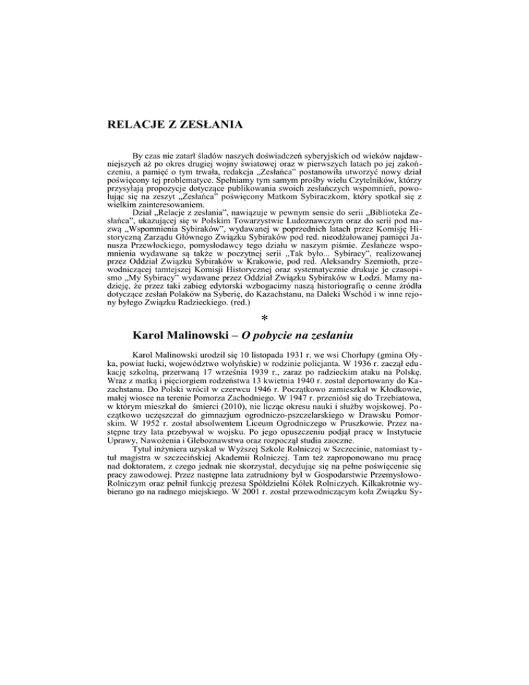 RELACJE Z ZESŁANIA By czas nie zatarł śladów naszych doświadczeń syberyjskich od wieków najdawniejszych aż po okres drugiej wojny światowej oraz w pierwszych latach po jej zakończeniu, a pamięć o tym trwała, redakcja „Zesłańca” postanowiła utworzyć nowy dział poświęcony tej problematyce. Spełniamy tym samym prośby wielu Czytelników, którzy przysyłają propozycje dotyczące publikowania swoich zesłańczych wspomnień, powołując się na zeszyt „Zesłańca” poświęcony Matkom Sybiraczkom, który spotkał się z wielkim zainteresowaniem. Dział „Relacje z zesłania”, nawiązuje w pewnym sensie do serii „Biblioteka Zesłańca”, ukazującej się w Polskim Towarzystwie Ludoznawczym oraz do serii pod nazwą „Wspomnienia Sybiraków”, wydawanej w poprzednich latach przez Komisję Historyczną Zarządu Głównego Związku Sybiraków pod red. nieodżałowanej pamięci Janusza Przewłockiego, pomysłodawcy tego działu w naszym piśmie. Zesłańcze wspomnienia wydawane są także w poczytnej serii „Tak było... Sybiracy”, realizowanej przez Oddział Związku Sybiraków w Krakowie, pod red. Aleksandry Szemioth, przewodniczącej tamtejszej Komisji Historycznej oraz systematycznie drukuje je czasopismo „My Sybiracy” wydawane przez Oddział Związku Sybiraków w Łodzi. Mamy nadzieję, że przez taki zabieg edytorski wzbogacimy naszą historiografię o cenne źródła dotyczące zesłań Polaków na Syberię, do Kazachstanu, na Daleki Wschód i w inne rejony byłego Związku Radzieckiego. (red.) * Karol Malinowski – O pobycie na zesłaniu Karol Malinowski urodził się 10 listopada 1931 r. we wsi Chorłupy (gmina Ołyka, powiat łucki, województwo wołyńskie) w rodzinie policjanta. W 1936 r. zaczął edukację szkolną, przerwaną 17 września 1939 r., zaraz po radzieckim ataku na Polskę. Wraz z matką i pięciorgiem rodzeństwa 13 kwietnia 1940 r. został deportowany do Kazachstanu. Do Polski wrócił w czerwcu 1946 r. Początkowo zamieszkał w Kłodkowie, małej wiosce na terenie Pomorza Zachodniego. W 1947 r. przeniósł się do Trzebiatowa, w którym mieszkał do śmierci (2010), nie licząc okresu nauki i służby wojskowej. Początkowo uczęszczał do gimnazjum ogrodniczo-pszczelarskiego w Drawsku Pomorskim. W 1952 r. został absolwentem Liceum Ogrodniczego w Pruszkowie. Przez następne trzy lata przebywał w wojsku. Po jego opuszczeniu podjął pracę w Instytucie Uprawy, Nawożenia i Gleboznawstwa oraz rozpoczął studia zaoczne. Tytuł inżyniera uzyskał w Wyższej Szkole Rolniczej w Szczecinie, natomiast tytuł magistra w szczecińskiej Akademii Rolniczej. Tam też zaproponowano mu pracę nad doktoratem, z czego jednak nie skorzystał, decydując się na pełne poświęcenie się pracy zawodowej. Przez następne lata zatrudniony był w Gospodarstwie PrzemysłowoRolniczym oraz pełnił funkcję prezesa Spółdzielni Kółek Rolniczych. Kilkakrotnie wybierano go na radnego miejskiego. W 2001 r. został przewodniczącym koła Związku Sy- biraków w Trzebiatowie. Obowiązki te starał się wypełniać najlepiej, jak potrafił. 1 Zmarł 3 września 2010 r. Anna Szymczak * W 1920 r. mój Ojciec Andrzej Malinowski oraz jego trzej starsi bracia przenieśli się na Kresy Wschodnie, do miejscowości Chorłupy. Kupili tam 4 działki, po 10 hektarów ziemi każda, za pieniądze ze sprzedaży majątku rodziców w Zalesiu w województwie łódzkim. 2 Na Wołyniu musieli pracować od początku, od zera, aby stworzyć z niczego swój nowy dom. To w nim właśnie Tata zamieszkał z żoną Elżbietą i w nim urodziliśmy się my: Władzia (ur. 1924), Marysia (ur. 1926), Stefcia (ur. 1929), Zygmunt (ur. 1930), ja i Danusia, która w chwili deportacji miała tylko 9 miesięcy. Dwaj wujkowie, w odróżnieniu od taty, nie potrafili zaaklimatyzować się w nowym miejscu, więc opuścili Wołyń. Ojciec przejął po nich ziemię. Ciężko pracował, ale jego wysiłek przynosił efekty: szybko zbudował dom i budynki gospodarcze. Wszystkie środki inwestował w ziemię. Dobre czasy skończyły się we wrześniu 1939 r. Początkowo byliśmy pełni wiary, że pokonamy niemieckiego wroga. Po wkroczeniu na polskie ziemie wojsk radzieckich to się zmieniło. Szybko zorientowaliśmy się, że sowieci czują się tu jak u siebie, a Polaków mają zamiar traktować jak przestępców, inaczej tego nazwać nie potrafię. Wkrótce ludzie zaczęli opowiadać, że na stacje kolejowe podstawiane są coraz to nowe wagony towarowe. Pojawiły się plotki o wywózkach na Sybir, ale jeszcze do 1940 r. mieliśmy nadzieję, że nas one ominą. W lutym jednak wywieziono rodziny osadników wojskowych, sąsiadująca z nami wioska opustoszała. Mama suszyła więc suchary, Tata zabił świnię, z której mięso i słoninę zabraliśmy do Kazachstanu. Po ojca enkawudziści przyszli 12 kwietnia 1940 r. Mieli broń, otoczyli i przeszukali dom. Tata został aresztowany, ale nikt nie powiedział, ani za co, ani po co? Wozili go od więzienia do więzienia. Osadzono go w Łucku. Później przeniesiono do Lwowa, następnie do Kijowa, a wreszcie do Charkowa, gdzie dowiedział się, że skazano go na osiem lat w przymusowym obozie pracy. I tak mógł mówić o sporym szczęściu, bo był to najniższy z możliwych wyroków. 3 1 Relację tę zanotowałam będąc studentką Uniwersytetu Szczecińskiego. Dzięki staraniom K. Malinowskiego kolejne osoby zrzeszone w Kołach Związku Sybiraków powiatu gryfickiego zgodziły się na udzielenie informacji z pobytu na zesłaniu. Dzięki temu powstała praca magisterska poświęcona życiu codziennemu zesłańców latach w 19401946 deportowanych na Syberię, do Kazachstanu i w inne rejony byłego Związku Radzieckiego. Obecnie jestem doktorantką US i kontynuuję wcześniejsze badania. Relacja K. Malinowskiego jest ważnym źródłem informacji, mimo pojawiających się w niej pewnych błędów i nieścisłości. 2 Informacja ta nie musi być całko