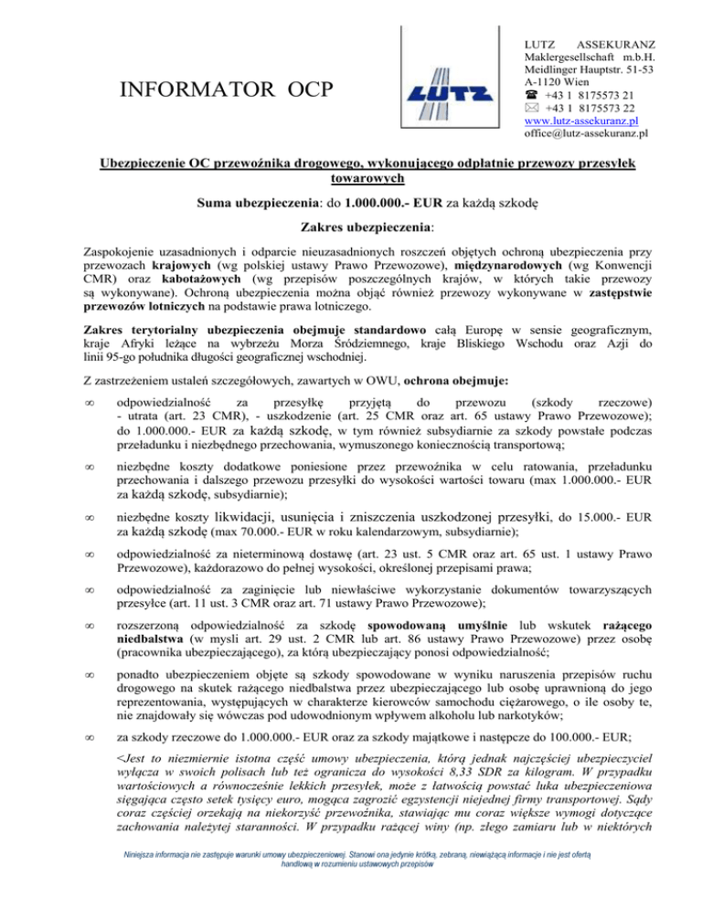 INFORMATOR OCP LUTZ ASSEKURANZ Maklergesellschaft m.b.H. Meidlinger Hauptstr. 51-53 A-1120 Wien +43 1 8175573 21 +43 1 8175573 22 www.lutz-assekuranz.pl [email protected] Ubezpieczenie OC przewoźnika drogowego, wykonującego odpłatnie przewozy przesyłek towarowych Suma ubezpieczenia: do 1.000.000.- EUR za każdą szkodę Zakres ubezpieczenia: Zaspokojenie uzasadnionych i odparcie nieuzasadnionych roszczeń objętych ochroną ubezpieczenia przy przewozach krajowych (wg polskiej ustawy Prawo Przewozowe), międzynarodowych (wg Konwencji CMR) oraz kabotażowych (wg przepisów poszczególnych krajów, w których takie przewozy są wykonywane). Ochroną ubezpieczenia można objąć również przewozy wykonywane w zastępstwie przewozów lotniczych na podstawie prawa lotniczego. Zakres terytorialny ubezpieczenia obejmuje standardowo całą Europę w sensie geograficznym, kraje Afryki leżące na wybrzeżu Morza Śródziemnego, kraje Bliskiego Wschodu oraz Azji do linii 95-go południka długości geograficznej wschodniej. Z zastrzeżeniem ustaleń szczegółowych, zawartych w OWU, ochrona obejmuje: • odpowiedzialność za przesyłkę przyjętą do przewozu (szkody rzeczowe) - utrata (art. 23 CMR), - uszkodzenie (art. 25 CMR oraz art. 65 ustawy Prawo Przewozowe); do 1.000.000.- EUR za każdą szkodę, w tym również subsydiarnie za szkody powstałe podczas przeładunku i niezbędnego przechowania, wymuszonego koniecznością transportową; • niezbędne koszty dodatkowe poniesione przez przewoźnika w celu ratowania, przeładunku przechowania i dalszego przewozu przesyłki do wysokości wartości towaru (max 1.000.000.- EUR za każdą szkodę, subsydiarnie); • niezbędne koszty likwidacji, usunięcia i zniszczenia uszkodzonej przesyłki, do 15.000.- EUR za każdą szkodę (max 70.000.- EUR w roku kalendarzowym, subsydiarnie); • odpowiedzialność za nieterminową dostawę (art. 23 ust. 5 CMR oraz art. 65 ust. 1 ustawy Prawo Przewozowe), każdorazowo do pełnej wysokości, określonej przepisami prawa; • odpowiedzialność za zaginięcie lub niewłaściwe wykorzystanie dokumentów towarzyszących przesyłce (art. 11 ust. 3 CMR oraz art. 71 ustawy Prawo Przewozowe); • rozszerzoną odpowiedzialność za szkodę spowodowaną umyślnie lub wskutek rażącego niedbalstwa (w mysli art. 29 ust. 2 CMR lub art. 86 ustawy Prawo Przewozowe) przez osobę (pracownika ubezpieczającego), za którą ubezpieczający ponosi odpowiedzialność; • ponadto ubezpieczeniem objęte są szkody spowodowane w wyniku naruszenia przepisów ruchu drogowego na skutek rażącego niedbalstwa przez ubezpieczającego lub osobę uprawnioną do jego reprezentowania, występujących w charakterze kierowców samochodu ciężarowego, o ile osoby te, nie znajdowały się wówczas pod udowodnionym wpływem alkoholu lub narkotyków; • za szkody rzeczowe do 1.000.000.- EUR oraz za szkody majątkowe i następcze do 100.000.- EUR; <Jest to niezmiernie istotna część umowy ubezpieczenia, którą jednak najczęściej ubezpieczyciel wyłącza w swoich polisach lub też ogranicza do wysokości 8,33 SDR za kilogram. W przypadku wartościowych a równocześnie lekkich przesyłek, może z łatwością powstać luka ubezpieczeniowa sięgająca często setek tysięcy euro, mogąca zagrozić egzystencji niejednej firmy transportowej. Sądy coraz częściej orzekają na niekorzyść przewoźnika, stawiając mu coraz większe wymogi dotyczące zachowania należytej staranności. W przypadku rażącej winy (np. złego zamiaru lub w niektórych Niniejsza informacja nie zastępuje warunki umowy ubezpieczeniowej. Stanowi ona jedynie krótką, zebraną, niewiążącą informacje i nie jest ofertą handlową w rozumieniu ustawowych przepisów INFORMATOR OCP -2- krajach rażącego niedbalstwa) powołanie się w myśl Konwencji CMR na okoliczności wyłączające lub ograniczające odpowiedzialność albo przenoszące ciężar dowodu na drugą stronę nie jest możliwe. Dlatego też suma gwarancyjna w wysokości 1.000.000,-- EUR ma szczególne znaczenie dla bezpieczeństwa firmy transportowej.> • odpowiedzialność za opłaty celne itp. w przypadku uszkodzonej lub utraconej przesyłki w myśl art. 23 ust. 4 CMR; • odpowiedzialność za pobranie zaliczenia (art. 21 CMR) do 10.000.- EUR za każdą szkodę; • odpowiedzialność z tytułu szkody powstałej na skutek zaniechania umieszczenia wpisów w liście przewozowym (art. 7 ust. 3 CMR); • odpowiedzialność z tytułu niezastosowania się do poleceń w myśl art. 12 CMR oraz art. 70 ustawy Prawo Przewozowe; • odpowiedzialność za utratę lub uszkodzenie przesyłki w przypadku przewożenia pojazdu wraz z ładunkiem środkiem transportu innym niż drogowy, np. promem lub koleją (art. 2. CMR) zgodnie z przepisami prawnymi obowiązującymi dla tego środka transportu, jeżeli można je w danej sytuacji zastosować; • odpowiedzialność za zaginięcie przesyłki przyjęte na zasadzie fikcji prawnej (art. 20 CMR) tak jak w przypadku zwykłego zaginięcia przesyłki; • odpowiedzialność z tytułu szczególnych uzgodnień w myśl art. 24 i 26 CMR, jeżeli nastąpiły one w porozumieniu z ubezpieczycielem; • odpowiedzialność w przypadku zlecenia przewozu przewoźnikom-podwykonawcom – przy zastosowaniu klauzuli 1 (ubezpieczenie przewoźników obcych = ubezpieczający załatwia ochronę ubezpieczeniową dla przewoźników-podwykonawców). W przypadku klauzuli 1 gwarantowana jest ochrona ubezpieczeniowa do kwoty 1.000.000,-- EUR. Jeżeli przewoźnik-podwykonawca (przewoźnik obcy) naruszy swoje obowiązki i w konsekwencji utraci ochronę ubezpieczeniową, obejmującą określoną szkodę, to ubezpieczający będzie nadal korzystał ze swojej ochrony ubezpieczeniowej, obejmującej jego własną odpowiedzialność, jednakże zakres tej ochrony ograniczony będzie wówczas do kwoty 360.000,-- EUR na każdą szkodę. Odpowiedzialność za przewoźników-podwykonawców na zasadzie sub