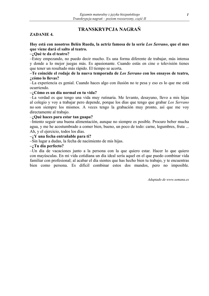 Egzamin maturalny z języka hiszpańskiego Transkrypcja nagrań – poziom rozszerzony, część II 1 TRANSKRYPCJA NAGRAŃ ZADANIE 4. Hoy está con nosotros Belén Rueda, la actriz famosa de la serie Los Serrano, que el mes que viene dará el salto al teatro. –¿Qué te da el teatro? –Estoy empezando, no puedo decir mucho. Es una forma diferente de trabajar, más intensa y donde a lo mejor juegas más. Es apasionante. Cuando estás en cine o televisión tienes que tener un resultado más rápido. El tiempo se acorta. –Te coincide el rodaje de la nueva temporada de Los Serrano con los ensayos de teatro, ¿cómo lo llevas? –La experiencia es genial. Cuando haces algo con ilusión no te pesa y eso es lo que me está ocurriendo. –¿Cómo es un día normal en tu vida? –La verdad es que tengo una vida muy rutinaria. Me levanto, desayuno, llevo a mis hijas al colegio y voy a trabajar pero depende, porque los días que tengo que grabar Los Serrano no son siempre los mismos. A veces tengo la grabación muy pronto, así que me voy directamente al trabajo. –¿Qué haces para estar tan guapa? –Intento seguir una buena alimentación, aunque no siempre es posible. Procuro beber mucha agua, y me he acostumbrado a comer bien, bueno, un poco de todo: carne, legumbres, fruta ... Ah, y el ejercicio, todos los días. –¿Y una fecha entrañable para ti? –Sin lugar a dudas, la fecha de nacimiento de mis hijas. –¿Tu día perfecto? –Un día de vacaciones junto a la persona con la que quiero estar. Hacer lo que quiero con mayúsculas. En mi vida cotidiana un día ideal sería aquel en el que puedo combinar vida familiar con profesional; al acabar el día sientes que has hecho bien tu trabajo, y te encuentras bien como persona. Es difícil combinar estos dos mundos, pero no imposible. Adaptado de www.semana.es 2 Egzamin maturalny z języka hiszpańskiego Transkrypcja nagrań – poziom rozszerzony, część II ZADANIE 5. 5.1. Cáritas Valencia expone ante los universitarios sus programas de ayuda a las familias sin recursos. La preparación de los jóvenes debe "ayudarles a reconocer los problemas de personas que viven muy cerca de nosotros y que sufren carencias vitales", señaló hoy la responsable del proyecto, Concha Vidal. Según ella, las familias a las que ayuda Cáritas Valencia "sufren carencias de todo tipo, y es algo que a veces no se acaba de ver; y no se generan actitudes de colaboración por parte de la sociedad". 5.2. Los españoles son los ciudadanos de la Unión Europea que demuestran más interés por los problemas de la inmigración y el terrorismo, según una encuesta Eurobarómetro sobre la realidad social europea publicada hoy. El estudio fue elaborado durante noviembre y diciembre de 2006, con motivo del inicio de una consulta pública sobre el bienestar y las políticas sociales de la UE, y recoge las principales preocupaciones, opiniones y expectativas de los europeos en el ámbito social. 5.3. Los españoles gastan 800 millones de euros al año en intervenciones de cirugía estética. Amas de casa, funcionarios y personal doméstico acuden a las consultas que antes frecuentaban profesionales del espectáculo o con una imagen pública. Los expertos llaman la atención sobre la frivolización de estas operaciones, no exentas de riesgo. La cirugía estética se ha introducido en la vida de los españoles como un gasto más dentro del presupuesto familiar. 5.4. Telecinco, cadena emisora de las galas de Miss y Míster España 2007, abogó hoy por modificar las bases del certamen Miss España de modo que ninguna candidata pueda ser excluida por el hecho de ser madre. Aunque este requisito figura en las bases de certámenes internacionales -como Miss Mundo y Miss Universo-, la cadena defiende que las organizaciones que gestionan estos concursos de belleza eliminen de sus bases esta cláusula discriminatoria. 5.5. Las autoridades mexicanas han empezado a extender certificados de autenticidad a los restaurantes mexicanos de Estados Unidos con el fin de distinguir la cocina tradicional de versiones comerciales como el Tex-Mex. Doce restaurantes del noreste del país recibieron sus certificados de restaurantes "auténticamente mexicanos", un distintivo promovido por la Fundación Sabores Auténticos de México. El sello pretende potenciar el consumo de productos mexicanos y la difusión de la cocina tradicional. 5.6. Por apenas 105 millones de euros, puede ser dueño de una cómoda casa de campo inglesa con 103 habitaciones, entrada de mármol y helipuerto, una propiedad que encabeza la lista anual de las casas más caras a la venta de la revista Forbes. La vivienda tiene unas 23 hectáreas de jardines y bosques, cinco piscinas, 22 baños de mármol y más de 4.600 metros cuadrados de espacio habitable. Adaptado de Noticias de EFE Egzamin maturalny z języka hiszpańskiego Transkrypcja nagrań – poziom rozszerzony, część II 3 ZADANIE 6. EL PARAÍSO ERA UN AUTOBÚS Él trabajó durante toda su vida en una ferretería del centro. A las ocho y media de la mañana llegaba a la parada del autobús y tomaba el primero, que no tardaba más de diez minutos. Ella trabajó también durante toda su vida en una mercería. Solía coger el autobús tres paradas después de la de él y se bajaba una antes. Debían salir a horas diferentes, pues por las tardes nunca coincidían. Jamás se hablaron. Si había asientos libres, se sentaban de manera que cada uno pudiera ver al otro. Cuando el autobús iba lleno, se ponían en la parte de atrás, contemplando la calle y sintiendo cada uno de ellos la cercana presencia del otro.(...) Ninguno de ellos llegó a saber jamás cómo era la vida del otro: si estaba casado, si tenía hijos, si era feliz. A lo largo de todos aquellos años se fueron lanzando mensajes no verbales sobre los que se podía especular ampliamente. Ella, por ejemplo, cogió la costumbre de llevar en el bolso una novela que a veces leía o fingía leer. A él le pareció 