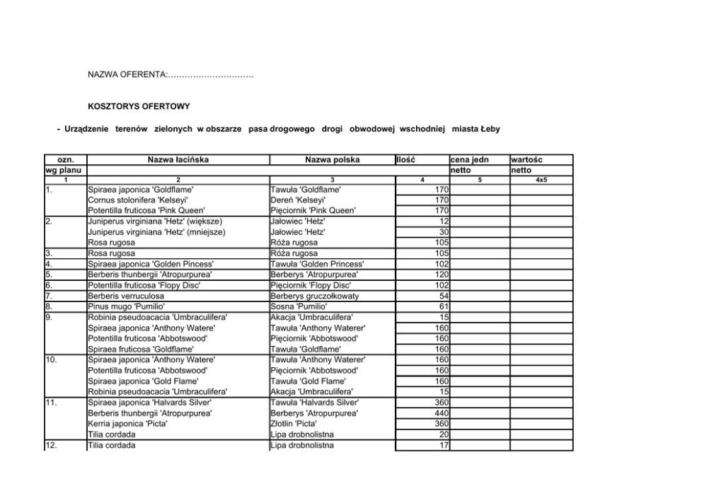 NAZWA OFERENTA:…………………………. KOSZTORYS OFERTOWY - Urządzenie terenów zielonych w obszarze pasa drogowego drogi obwodowej wschodniej miasta Łeby ozn. wg planu 1 1. 2. 3. 4. 5. 6. 7. 8. 9. 10. 11. 12. Nazwa łacińska 2 Spiraea japonica 'Goldflame' Cornus stolonifera 'Kelseyi' Potentilla fruticosa 'Pink Queen' Juniperus virginiana 'Hetz' (większe) Juniperus virginiana 'Hetz' (mniejsze) Rosa rugosa Rosa rugosa Spiraea japonica 'Golden Pincess' Berberis thunbergii 'Atropurpurea' Potentilla fruticosa 'Flopy Disc' Berberis verruculosa Pinus mugo 'Pumilio' Robinia pseudoacacia 'Umbraculifera' Spiraea japonica 'Anthony Watere' Potentilla fruticosa 'Abbotswood' Spiraea fruticosa 'Goldflame' Spiraea japonica 'Anthony Watere' Potentilla fruticosa 'Abbotswood' Spiraea japonica 'Gold Flame' Robinia pseudoacacia 'Umbraculifera' Spiraea japonica 'Halvards Silver' Berberis thunbergii 'Atropurpurea' Kerria japonica 'Picta' Tilia cordada Tilia cordada Nazwa polska 3 Tawuła 'Goldflame' Dereń 'Kelseyi' Pięciornik 'Pink Queen' Jałowiec 'Hetz' Jałowiec 'Hetz' Róża rugosa Róża rugosa Tawuła 'Golden Princess' Berberys 'Atropurpurea' Pięciornik 'Flopy Disc' Berberys gruczołkowaty Sosna 'Pumilio' Akacja 'Umbraculifera' Tawuła 'Anthony Waterer' Pięciornik 'Abbotswood' Tawuła 'Goldflame' Tawuła 'Anthony Waterer' Pięciornik 'Abbotswood' Tawuła 'Gold Flame' Akacja 'Umbraculifera' Tawuła 'Halvards Silver' Berberys 'Atropurpurea' Złotlin 'Picta' Lipa drobnolistna Lipa drobnolistna Ilość cena jedn netto 4 5 170 170 170 12 30 105 105 102 120 102 54 61 15 160 160 160 160 160 160 15 360 440 360 20 17 wartośc netto 4x5 13. 14. 15. 16. 17. 18. 19. 20. 20A. 21. 22. 23. 24. Kerria japonica 'Picta' Berberis thunbergii 'Atropurpurea' Spiraea japonica 'Halvards Silver' Tilia cordada Weigela florida 'Foliis Purpureis' Weigela 'Goldrush' Tilia cordada Sedum spectabile 'Brillant' Miscanthus sinensis 'Morninglight' Pyracantha 'Soleil d'Or' Hypericum 'Hidcote' Festuca gautieri Juniperus virginiana 'Burkii' (duży) Cytisus 'Zeelandia' Juniperus media 'Saybrook Gold' Geranium macrorrhizum Thuja occidentalis 'Golden Globe' Fragaria 'Pink Panda' Weigela 'Nana Variegata' Sedum album 'Murale' Saxifraga paniculata Sorbus 'Pink Veil' Lonicera pileata Thujopsis dolabrata 'Nana' Philadelphus 'Manteau d'Hermine' Juniperus squamata 'Blue Alps' Weigela 'Nana Purpurea' Spiraea japonica 'Golden Pincess' Cotoneaster microphyllus Spiraea thunbergii Lavandula angustifolia Sedum spectabile 'Brillant' Lysimachia punctata Prunus cistena Pa Spiraea japonica 'Halvards Silver' Berberis thunbergii 'Atropurpurea' Rosa 'Nozomi' Złotlin 'Picta' Berberys 'Atropurpurea' Tawuła 'Halvards Silver' Lipa drobnolistna Krzewuszka 'Foliis Purpureis' Krzewuszka 'Goldrush' Lipa drobnolistna Rozchodnik okazały 'Brillant' Miskant 'Morninglight' Ognik 'Soleil d'Or' Dziurawiec 'Hidcote' Kostrzewa Gautiera Jałowiec 'Burkii' Żarnowiec 'Zeelandia' Jałowiec 'Saybrook Gold' Bodziszek korzeniasty Tuja 'Golden Globe' Poziomka 'Pink Panda' Krzewuszka 'Nana Variegata' Rozchodnik biały 'Murale' Skalnica gronkowa Jarząb 'Pink Veil' Suchodrzew chiński Żywotnikowiec 'Nana' Jaśminowiec 'Manteau d'Hermine' Jałowiec 'Blue Alps' Krzewuszka 'Nana Purpurea' Tawuła 'Golden Princess' Irga drobnolistna Tawuła Thunberga Lawenda Rozchodnik okazały 'Brillant' Tojeść kropkowana Śliwa dziecięca Pa Tawuła 'Halvards Silver' Berberys 'Atropurpurea' Róża 'Nozomi' 180 180 180 4 65 65 7 160 80 180 30 30 3 50 35 60 11 160 22 36 36 2 65 17 88 35 130 130 130 93 165 27 40 3 110 110 110 25. 26. 27. 28. 29. 30. 31. 32. 33. 34. 35. 36. 37. Artemisia 'Linelight' Sorbus koehneana Pa Juniperus media 'Mint Julep' Thuja occidentalis 'Rheingold' Forsythia'Maluch' Sorbus koehneana Pa Berberis thunbergii Gleditsia tricantnos 'Rubylace' Cotoneaster salicifolius 'Parkteppich' Euonymus fortunei 'Emerald'n Gold' Saxifraga umbrosa Juniperus sabina 'Blue Danube' Gleditsia tricantnos 'Sunburst' Juniperus horizontalis 'Blue Chip' Potentilla fruticosa 'Red Ace' Juniperus horizontalis 'Agnieszka' Carex muskingumensis Syringa meyeri 'Palibin' Pa Betula utilis 'Doorenbos' Hosta sieboldiana 'Elegans' Berberis thunbergii 'Red Pillar' Physocarpus opulifolius 'Diabolo' Hippophae rhomnoides Hosta sieboldiana 'Elegans' Betula utilis 'Doorenbos' Euonymus fortunei 'Emerald'n Gold' Spiraea japonica 'Halvards Silver' Juniperus squamata 'Blue Carpet' Acer negundo 'Odessanum' Euonymus fortunei 'Sunspot' Spiraea cinerea 'Grefsheim' Tradescantia x andersoniana Berberis 'Kórnik' Juniperus virginiana 'Burkii' (duży) Hypericum 'Hidcote' Festuca glauca Juniperus x pfitzeriana 'Golden Saucer' Bylica pospolita 'Linelight' Jarząb Koehneana Pa Jałowiec 'Mint Julep' Tuja 'Rheingold' Forsycja 'Maluch' Jarząb Koehneana Pa Berberys Thunberga Iglicznia 'Rubylace' Irga 'Parkteppich' Trzmielina 'Emerald'n Gold' Skalnica cienista Jałowiec 'Blue Danube' Iglicznia 'Sunburst' Jałowiec 'Blue Chip' Pięciornik 'Red Ace' Jałowiec 'Agnieszka' Turzyca muskegońska Lilak 'Palibin' Pa Brzoza 'Doorenbos' Funkia Berberys 'Red Pillar' Pęcherznica 'Diabolo' Rokitnik Funkia Brzoza 'Doorenbos' Trzmielina 'Emerald'n Gold' Tawuła 'Halvards Silver' Jałowiec 'Blue Carpet' Klon 'Odessanum' Trzmielina 'Sunspot' Tawuła 'Grefsheim' Trzykrotka wirginijska Berberys 'kórnik' Jałowiec 'Burkii' Dziurawiec 'Hidcote' Kostrzewa sina Jałowiec 'Golden Saucer' 110 30 23 14 24 5 80 1 52 43 96 30 1 70 70 70 70 22 2 100 45 24 15 27 1 60 44 110 1 30 15 16 19 8 90 35 28 37A. 38. 39. 40. 41. 42. 43. 46. 47. 48. 49. 50. 51. 52. 53. 54. Potentilla fruticosa 'Abbotswood' Spiraea japonica 'Japanese Dwarf' Prunus virginiana 'Shubert' Juniperus squamata 'Blue Carpet' Cornus alba 'Elegantissima' Pa Juniperus horizontalis 'Agnieszka' Vinca minor Juniperus media 'Mint Julep' Sedum spectabile 'Matrona' Eleagnus angustifolia Juniperus squamata 'Blue Carpet' Prunus virginiana 'Shubert' Thuja occidentalis 'Globosa' Euonymus fortunei 'Emer