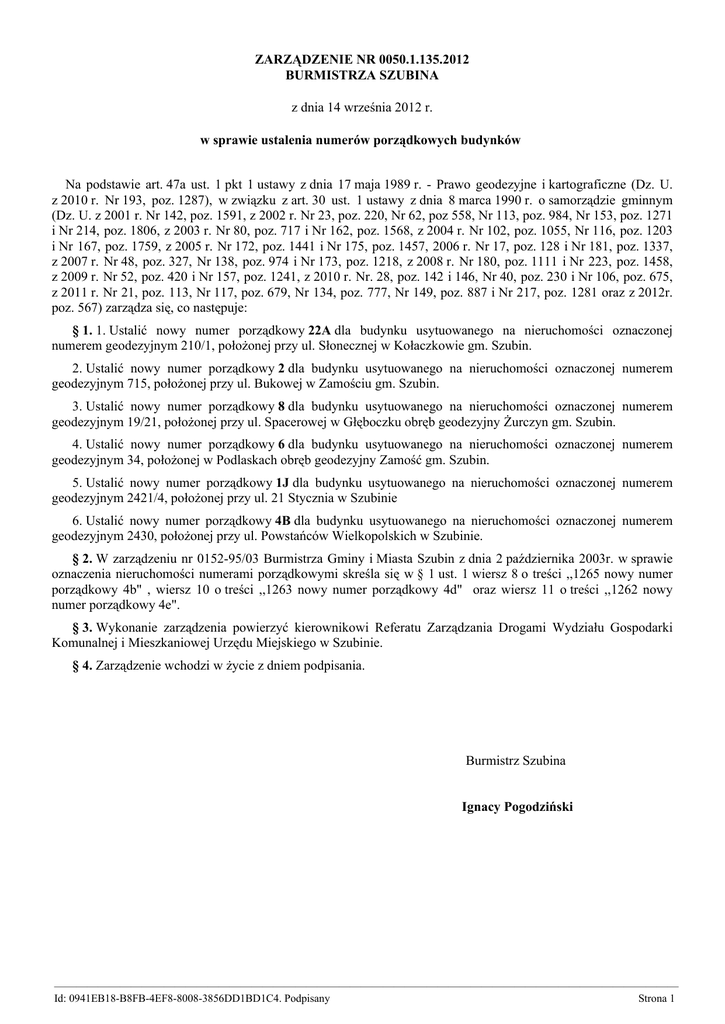 ZARZĄDZENIE NR 0050.1.135.2012 BURMISTRZA SZUBINA z dnia 14 września 2012 r. w sprawie ustalenia numerów porządkowych budynków Na podstawie art. 47a ust. 1 pkt 1 ustawy z dnia 17 maja 1989 r. - Prawo geodezyjne i kartograficzne (Dz. U. z 2010 r. Nr 193, poz. 1287), w związku z art. 30 ust. 1 ustawy z dnia 8 marca 1990 r. o samorządzie gminnym (Dz. U. z 2001 r. Nr 142, poz. 1591, z 2002 r. Nr 23, poz. 220, Nr 62, poz 558, Nr 113, poz. 984, Nr 153, poz. 1271 i Nr 214, poz. 1806, z 2003 r. Nr 80, poz. 717 i Nr 162, poz. 1568, z 2004 r. Nr 102, poz. 1055, Nr 116, poz. 1203 i Nr 167, poz. 1759, z 2005 r. Nr 172, poz. 1441 i Nr 175, poz. 1457, 2006 r. Nr 17, poz. 128 i Nr 181, poz. 1337, z 2007 r. Nr 48, poz. 327, Nr 138, poz. 974 i Nr 173, poz. 1218, z 2008 r. Nr 180, poz. 1111 i Nr 223, poz. 1458, z 2009 r. Nr 52, poz. 420 i Nr 157, poz. 1241, z 2010 r. Nr. 28, poz. 142 i 146, Nr 40, poz. 230 i Nr 106, poz. 675, z 2011 r. Nr 21, poz. 113, Nr 117, poz. 679, Nr 134, poz. 777, Nr 149, poz. 887 i Nr 217, poz. 1281 oraz z 2012r. poz. 567) zarządza się, co następuje: § 1. 1. Ustalić nowy numer porządkowy 22A dla budynku usytuowanego na nieruchomości oznaczonej numerem geodezyjnym 210/1, położonej przy ul. Słonecznej w Kołaczkowie gm. Szubin. 2. Ustalić nowy numer porządkowy 2 dla budynku usytuowanego na nieruchomości oznaczonej numerem geodezyjnym 715, położonej przy ul. Bukowej w Zamościu gm. Szubin. 3. Ustalić nowy numer porządkowy 8 dla budynku usytuowanego na nieruchomości oznaczonej numerem geodezyjnym 19/21, położonej przy ul. Spacerowej w Głęboczku obręb geodezyjny Żurczyn gm. Szubin. 4. Ustalić nowy numer porządkowy 6 dla budynku usytuowanego na nieruchomości oznaczonej numerem geodezyjnym 34, położonej w Podlaskach obręb geodezyjny Zamość gm. Szubin. 5. Ustalić nowy numer porządkowy 1J dla budynku usytuowanego na nieruchomości oznaczonej numerem geodezyjnym 2421/4, położonej przy ul. 21 Stycznia w Szubinie 6. Ustalić nowy numer porządkowy 4B dla budynku usytuowanego na nieruchomości oznaczonej numerem geodezyjnym 2430, położonej przy ul. Powstańców Wielkopolskich w Szubinie. § 2. W zarządzeniu nr 0152-95/03 Burmistrza Gminy i Miasta Szubin z dnia 2 października 2003r. w sprawie oznaczenia nieruchomości numerami porządkowymi skreśla się w § 1 ust. 1 wiersz 8 o treści ,,1265 nowy numer porządkowy 4b" , wiersz 10 o treści ,,1263 nowy numer porządkowy 4d" oraz wiersz 11 o treści ,,1262 nowy numer porządkowy 4e". § 3. Wykonanie zarządzenia powierzyć kierownikowi Referatu Zarządzania Drogami Wydziału Gospodarki Komunalnej i Mieszkaniowej Urzędu Miejskiego w Szubinie. § 4. Zarządzenie wchodzi w życie z dniem podpisania. Burmistrz Szubina Ignacy Pogodziński ————————————————————————————————————————————————————————— Id: 0941EB18-B8FB-4EF8-8008-3856DD1BD1C4. Podpisany Strona 1