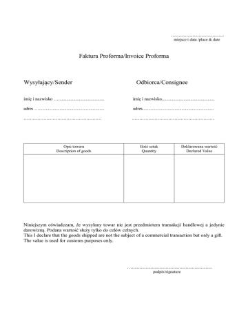 .......................................... miejsce i data /place & date Faktura Proforma/Invoice Proforma Wysyłający/Sender Odbiorca/Consignee imię i nazwisko …........................................ imię i nazwisko.............................................. adres …......................................................... adres.............................................................. …………………………………………… ……………………………………………… Opis towaru Description of goods Ilość sztuk Quantity Deklarowana wartość Declared Value Niniejszym oświadczam, że wysyłany towar nie jest przedmiotem transakcji handlowej a jedynie darowizną. Podana wartość służy tylko do celów celnych. This I declare that the goods shipped are not the subject of a commercial transaction but only a gift. The value is used for customs purposes only. …................................................................ podpis/signature