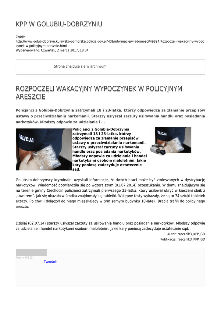 KPP W GOLUBIU-DOBRZYNIU Źródło: http://www.golub-dobrzyn.kujawsko-pomorska.policja.gov.pl/kb8/informacje/wiadomosci/49894,Rozpoczeli-wakacyjny-wypoc zynek-w-policyjnym-areszcie.html Wygenerowano: Czwartek, 2 marca 2017, 18:04 Strona znajduje się w archiwum. ROZPOCZĘLI WAKACYJNY WYPOCZYNEK W POLICYJNYM ARESZCIE Policjanci z Golubia-Dobrzynia zatrzymali 18 i 23-latka, którzy odpowiedzą za złamanie przepisów ustawy o przeciwdziałaniu narkomanii. Starszy usłyszał zarzuty usiłowania handlu oraz posiadania narkotyków. Młodszy odpowie za udzielanie i ... Policjanci z Golubia-Dobrzynia zatrzymali 18 i 23-latka, którzy odpowiedzą za złamanie przepisów ustawy o przeciwdziałaniu narkomanii. Starszy usłyszał zarzuty usiłowania handlu oraz posiadania narkotyków. Młodszy odpowie za udzielanie i handel narkotykami osobom małoletnim. Jakie kary poniosą zadecyduje ostatecznie sąd. Golubsko-dobrzyńscy kryminalni uzyskali informację, że dwóch braci może być zmieszanych w dystrybucję narkotyków. Wiadomość potwierdziła się po wczorajszym (01.07.2014) przeszukaniu. W domu znajdującym się na terenie gminy Ciechocin policjanci zatrzymali pierwszego 23-latka, który usiłował ukryć w kieszeni słoik z „towarem”. Jak się okazało w środku znajdowały się tabletki. Wstępne testy wykazały, że są to 74 sztuki tabletek extazy. Po chwili dołączył do niego mieszkający w tym samym budynku 18-latek. Bracia trafili do policyjnego aresztu. Dzisiaj (02.07.14) starszy usłyszał zarzuty za usiłowanie handlu oraz posiadanie narkotyków. Młodszy odpowie za udzielanie i handel narkotykami osobom małoletnim. Jakie kary poniosą zadecyduje ostatecznie sąd. Autor: rzecznik3_KPP_GD Publikacja: rzecznik3_KPP_GD Ocena: 0/5 (0) Tweetnij