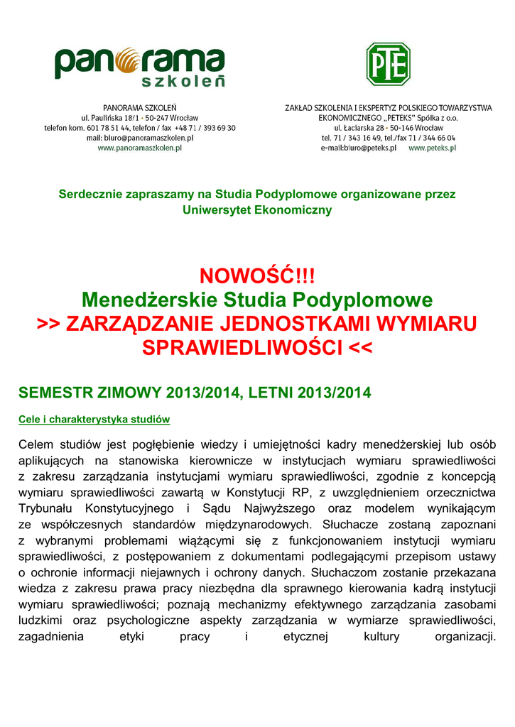 Serdecznie zapraszamy na Studia Podyplomowe organizowane przez Uniwersytet Ekonomiczny NOWOŚĆ!!! Menedżerskie Studia Podyplomowe >> ZARZĄDZANIE JEDNOSTKAMI WYMIARU SPRAWIEDLIWOŚCI << SEMESTR ZIMOWY 2013/2014, LETNI 2013/2014 Cele i charakterystyka studiów Celem studiów jest pogłębienie wiedzy i umiejętności kadry menedżerskiej lub osób aplikujących na stanowiska kierownicze w instytucjach wymiaru sprawiedliwości z zakresu zarządzania instytucjami wymiaru sprawiedliwości, zgodnie z koncepcją wymiaru sprawiedliwości zawartą w Konstytucji RP, z uwzględnieniem orzecznictwa Trybunału Konstytucyjnego i Sądu Najwyższego oraz modelem wynikającym ze współczesnych standardów międzynarodowych. Słuchacze zostaną zapoznani z wybranymi problemami wiążącymi się z funkcjonowaniem instytucji wymiaru sprawiedliwości, z postępowaniem z dokumentami podlegającymi przepisom ustawy o ochronie informacji niejawnych i ochrony danych. Słuchaczom zostanie przekazana wiedza z zakresu prawa pracy niezbędna dla sprawnego kierowania kadrą instytucji wymiaru sprawiedliwości; poznają mechanizmy efektywnego zarządzania zasobami ludzkimi oraz psychologiczne aspekty zarządzania w wymiarze sprawiedliwości, zagadnienia etyki pracy i etycznej kultury organizacji. Po ukończeniu studiów słuchacz otrzymuje świadectwo ukończenia studiów podyplomowych. 1. Kandydaci powinni posiadać dyplom ukończenia studiów wyższych I lub II stopnia. 2. Studia są kierowane do absolwentów szkół wyższych różnych kierunków. 3. Kandydat powinien posiadać ogólne umiejętności analizowania i interpretowania podstawowych zjawisk społeczno-gospodarczych 4. Kandydata powinna cechować aktywna postawa i kreatywność, powinien być świadomy konieczności uczenia się. ADRESACI Studia kierowane są do osób już pracujących w jednostkach wymiaru sprawiedliwości lub osób aplikujących na stanowiska kierownicze w instytucjach wymiaru sprawiedliwości CZAS TRWANIA I LICZBA GODZIN 2 semestry, 170 godz. PROGRAM STUDIÓW Lp.. Nazwa przedmiotu Liczba godzin 1. Podstawy zarządzania. Struktury organizacyjne instytucji wymiaru sprawiedliwości 20 2. Organizacja i technika pracy w instytucjach wymiaru sprawiedliwości 8 3. Zarządzanie zasobami ludzkimi 12 4. Podejmowanie decyzji w warunkach niepewności, ryzyka i kryzysu. 8 5. Konstytucyjna koncepcja wymiaru sprawiedliwości 8 6. System wymiaru sprawiedliwości RP 8 7. Funkcjonowanie i organizacja pracy prokuratury 8 8. Funkcjonowanie i organizacja pracy sądownictwa 8 9. Status prawny pracowników sądów i prokuratury 8 10. Podstawy etyki dla pracowników wymiaru sprawiedliwości 4 11. Europejskie standardy w zakresie wymiaru sprawiedliwości 8 12. Postępowanie z dokumentami podlegającymi przepisom ustawy o ochronie informacji niejawnych 8 13. Menedżer wobec trudnych relacji w zespole. Mediacja 16 14. Elementy psychologii. Negocjacje i sztuka komunikacji interpersonalnej, autoprezentacja 20 15. Bezpieczeństwo publiczne 8 16. Podstawy marketingu w instytucjach wymiaru sprawiedliwości 8 17. Seminarium 10 RAZEM 170 WARUNKI I SPOSÓB ZALICZENIA STUDIÓW PODSTAWĄ ZALICZENIA STUDIÓW I OTRZYMANIA ŚWIADECTWA ICH UKOŃCZENIA JEST: obecność na zajęciach (wymagane 80% obecności), otrzymanie zaliczeń ze wszystkich przedmiotów - pozytywne zaliczenie testów i sprawdzianów, przeprowadzonych na koniec zajęć przez prowadzących, przygotowanie i obrona pracy dyplomowej (końcowej), ustna obrona pracy dyplomowej (końcowej) na egzaminie końcowym. ORGANIZACJA STUDIÓW Szczegóły dotyczące organizacji studiów: studia organizowane są na Wydziale Zarządzania, Informatyki i Finansów zajęcia odbywają się w Domu Ekonomisty we Wrocławiu, przy ul. Łaciarskiej 28, zjazdy są organizowane w soboty-niedziele co dwa tygodnie dodatkowe usługi obejmują: materiały promocyjne, materiały szkoleniowe KADRA DYDAKTYCZNA Kadrę dydaktyczną (wykładowców i trenerów) stanowią pracownicy Uniwersytetu Ekonomicznego, Uniwersytetu we Wrocławiu oraz Politechniki Wrocławskiej KIEROWNICTWO I OPIEKA NAUKOWA Kierownik dr hab. Józef Dziechciarz, prof. UE Katedra Ekonometrii Cena: 3977,00 zł. Możliwość opłaty w 4 ratach (pierwsza rata wynosi 1300 zł + 34 zł), a pozostałe koszty można uiścić w trzech ratach. Opłata za wydanie indeksu i zaświadczenia o ukończeniu studiów podyplomowych wynosi 34,00 zł (podstawa: Zarządzenie Nr 27/2010 Rektora Uniwersytetu Ekonomicznego z dnia 31 maja 2010 r. w sprawie wysokości opłat za wydanie dokumentów związanych z przebiegiem studiów). Opłatę za wydanie indeksu i zaświadczenia o ukończeniu studiów podyplomowych (34,00 zł) należy dokonać wraz z 1-szą ratą. Terminy Termin zakończenia rekrutacji: 2013-09-15 Termin uruchomienia studiów: 2013-10-05 WYMAGANE DOKUMENTY - podanie o przyjęcie na studia - formularz zgłoszeniowy - oświadczenie o pokryciu kosztów - 2 zdjęcia (37mm x 45mm) - odpis dyplomu ukończenia studiów magisterskich lub licencjackich + kserokopia - kserokopia dowodu osobistego (obydwie strony) - dowód wpłaty pierwszej raty - dowód dokonania opłaty na konto Uniwersytetu Ekonomicznego: PKO S.A. : 23 1240 6814 1111 0000 4938 8642 w terminie do dnia: 31.08.2013 r. - w temacie przelewu prosimy o dopisanie tytułu wybranych studiów DODATKOWE INFORMACJE Uczestnicy Studiów mają prawo na podstawie indeksu do korzystania z biblioteki Uniwersytetu Ekonomicznego we Wrocławiu. Na zakończenie słuchacze otrzymują świadectwo ukończenia Studiów Podyplomowych wydane przez Uniwersytet Ekonomiczny we Wrocławiu (według wzoru ustalonego przez Ministerstwo). ZAPISY: telefonicznie: tel/fax 71 393-69-30 601 78-51-44, pod adresem e-mailowym: [email protected] poprzez stronę internetową: www.panoramaszkolen.pl (zakładka studia podyplomowe)