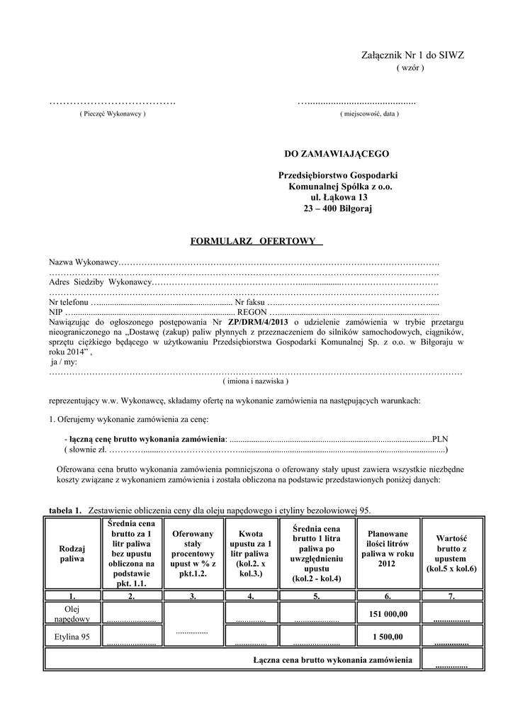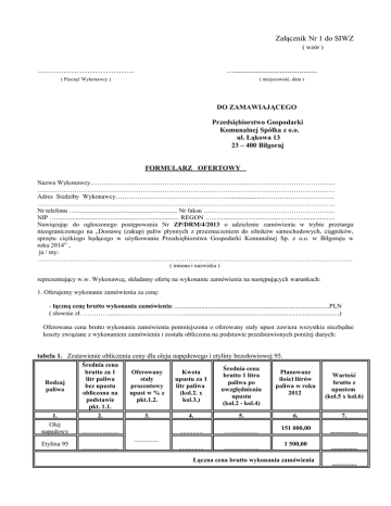 Załącznik Nr 1 do SIWZ ( wzór ) ………………………………. ….......................................... ( Pieczęć Wykonawcy ) ( miejscowość, data ) DO ZAMAWIAJĄCEGO Przedsiębiorstwo Gospodarki Komunalnej Spółka z o.o. ul. Łąkowa 13 23 – 400 Biłgoraj FORMULARZ OFERTOWY Nazwa Wykonawcy…………………………………………………………………………………………………. ………………………………………………………………………………………………………………………. Adres Siedziby Wykonawcy……………………………………………....................……………………………. ………………………………………………………………………………………………………………………. Nr telefonu ….............................................................. Nr faksu …...……………………………………………..... NIP …........................................................................... REGON …........................................................................... Nawiązując do ogłoszonego postępowania Nr ZP/DRM/4/2013 o udzielenie zamówienia w trybie przetargu nieograniczonego na „Dostawę (zakup) paliw płynnych z przeznaczeniem do silników samochodowych, ciągników, sprzętu ciężkiego będącego w użytkowaniu Przedsiębiorstwa Gospodarki Komunalnej Sp. z o.o. w Biłgoraju w roku 2014” , ja / my: ……………………………………………………………………………………………………………………………… ( imiona i nazwiska ) reprezentujący w.w. Wykonawcę, składamy ofertę na wykonanie zamówienia na następujących warunkach: 1. Oferujemy wykonanie zamówienia za cenę: - łączną cenę brutto wykonania zamówienia: ..............................................................................................PLN ( słownie zł. …………........………………………................................................................................................) Oferowana cena brutto wykonania zamówienia pomniejszona o oferowany stały upust zawiera wszystkie niezbędne koszty związane z wykonaniem zamówienia i została obliczona na podstawie przedstawionych poniżej danych: tabela 1. Zestawienie obliczenia ceny dla oleju napędowego i etyliny bezołowiowej 95. Średnia cena Średnia cena brutto za 1 Oferowany Kwota Planowane brutto 1 litra litr paliwa stały upustu za 1 ilości litrów Rodzaj paliwa po bez upustu procentowy litr paliwa paliwa w roku paliwa uwzględnieniu obliczona na upust w % z (kol.2. x 2012 upustu podstawie pkt.1.2. kol.3.) (kol.2 - kol.4) pkt. 1.1. 1. 2. 3. 4. 5. 6. Olej 151 000,00 napędowy ....................... .............. ..................... ............... Etylina 95 1 500,00 ....................... ............... ...................... Łączna cena brutto wykonania zamówienia Wartość brutto z upustem (kol.5 x kol.6) 7. ................. ................ ............... 1.1. Ustalenie średniej ceny brutto za 1 litr paliwa bez upustu. Oświadczamy, że uwidoczniona cena na dystrybutorze o godzinie 10 00 za 1 litr oleju napędowego w dniu 10.12.2013 r. - wynosiła………….zł. w dniu 11.12.2013 r. - wynosiła……….....zł. w dniu 12.12.2013 r. - wynosiła……….....zł. w dniu 13.12.2013 r. - wynosiła………… zł. w dniu 16.12.2013 r. - wynosiła………… zł. średnia cena brutto za 1 litr paliwa wynosi - …………………. zł. (wynik zaokrąglić do dwóch miejsc po przecinku) Oświadczamy, że uwidoczniona cena na dystrybutorze o godzinie 10 00 za 1 litr etyliny bezołowiowej 95 w dniu 10.12.2013 r. - wynosiła………….zł. w dniu 11.12.2013 r. - wynosiła……….....zł. w dniu 12.12.2013 r. - wynosiła……….....zł. w dniu 13.12.2013 r.- wynosiła………… zł. w dniu 16.12.2013 r. - wynosiła………… zł. średnia cena brutto za 1 litr paliwa wynosi - …………………. zł. (wynik zaokrąglić do dwóch miejsc po przecinku) 1.2. Oferowany stały procentowy upust. Oferujemy stały procentowy upust, naliczany każdorazowo od ceny litra oleju napędowego oraz etyliny bezołowiowej 95 kupowanego przez Zamawiającego w stacji paliw Wykonawcy w wysokości ..........% (słownie: ...............................................................)*. Wszystkie ceny oraz kwotę oferowanego stałego upustu procentowego dla każdej ceny należy podać z dokładnością do dwóch miejsc po przecinku. 1.3. Odległość naszej Stacji tankowania pojazdów od siedziby Zamawiającego – ul. Łąkowa 13, 23-400 Biłgoraj, po drodze dojazdowej wynosi - ....................... metrów 2. Rozliczenie następowało będzie na podstawie wystawionych faktur wraz z dołączonymi do nich WZ lub innymi dokumentami za pobrane paliwo w okresie 15-dniowym. Fakturowanie paliwa dokonywane będzie na 15 i na każdy ostatni dzień miesiąca. 3. Oferujemy 14 dniowy termin płatności należności z tytułu realizacji umowy, licząc od dnia złożenia prawidłowo wystawionej faktury w siedzibie Zamawiającego. 4. Oświadczamy, że zapoznaliśmy się treścią SIWZ i akceptujemy w pełni i bez zastrzeżeń jej postanowienia. 5. Oświadczamy, że akceptujemy w pełni i bez zastrzeżeń projekt umowy stanowiący załącznik nr 2 do SIWZ i w przypadku uznania naszej oferty za najkorzystniejszą zobowiązujemy się do jej podpisania w miejscu i terminie wyznaczonym przez Zamawiającego na warunkach zawartych w SIWZ. 6. Oświadczamy, że akceptujemy 30 dniowy termin związania ofertą określony w SIWZ. 7. Oświadczamy, że przedstawione przez nas dokumenty opisują aktualny stan faktyczny i prawny. 8. Oświadczamy, że informacje składające się na niniejszą ofertę, zawarte na stronach nr .............................. stanowią tajemnicę przedsiębiorstwa w rozumieniu przepisów ustawy o zwalczaniu nieuczciw