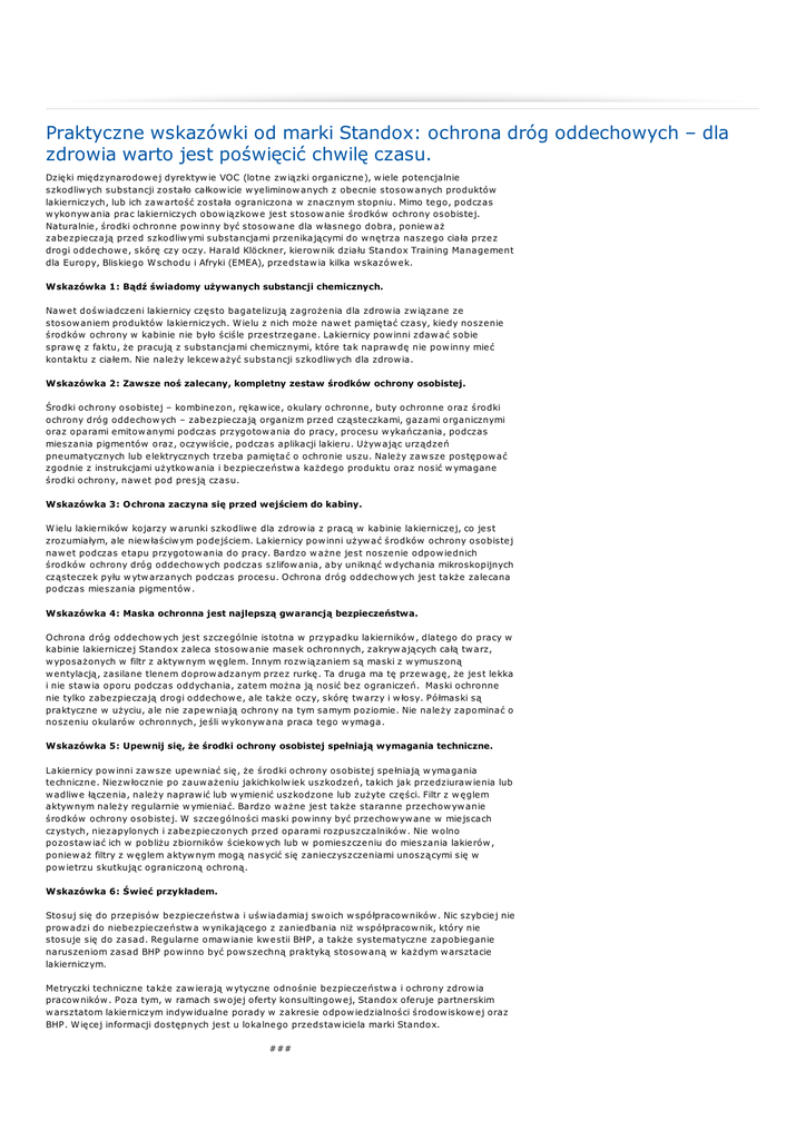 Praktyczne wskazówki od marki Standox: ochrona dróg oddechowych – dla zdrowia warto jest poświęcić chwilę czasu. Dzięki międzynarodow ej dyrektyw ie VOC (lotne zw iązki organiczne), w iele potencjalnie szkodliw ych substancji zostało całkow icie w yeliminow anych z obecnie stosow anych produktów lakierniczych, lub ich zaw artość została ograniczona w znacznym stopniu. Mimo tego, podczas w ykonyw ania prac lakierniczych obow iązkow e jest stosow anie środków ochrony osobistej. Naturalnie, środki ochronne pow inny być stosow ane dla w łasnego dobra, poniew aż zabezpieczają przed szkodliw ymi substancjami przenikającymi do w nętrza naszego ciała przez drogi oddechow e, skórę czy oczy. Harald Klöckner, kierow nik działu Standox Training Management dla Europy, Bliskiego W schodu i Afryki (EMEA), przedstaw ia kilka w skazów ek. Wskazówka 1: Bądź świadomy używanych substancji chemicznych. Naw et dośw iadczeni lakiernicy często bagatelizują zagrożenia dla zdrow ia zw iązane ze stosow aniem produktów lakierniczych. W ielu z nich może naw et pamiętać czasy, kiedy noszenie środków ochrony w kabinie nie było ściśle przestrzegane. Lakiernicy pow inni zdaw ać sobie spraw ę z faktu, że pracują z substancjami chemicznymi, które tak napraw dę nie pow inny mieć kontaktu z ciałem. Nie należy lekcew ażyć substancji szkodliw ych dla zdrow ia. Wskazówka 2: Zawsze noś zalecany, kompletny zestaw środków ochrony osobistej. Środki ochrony osobistej – kombinezon, rękaw ice, okulary ochronne, buty ochronne oraz środki ochrony dróg oddechow ych – zabezpieczają organizm przed cząsteczkami, gazami organicznymi oraz oparami emitow anymi podczas przygotow ania do pracy, procesu w ykańczania, podczas mieszania pigmentów oraz, oczyw iście, podczas aplikacji lakieru. Używ ając urządzeń pneumatycznych lub elektrycznych trzeba pamiętać o ochronie uszu. Należy zaw sze postępow ać zgodnie z instrukcjami użytkow ania i bezpieczeństw a każdego produktu oraz nosić w ymagane środki ochrony, naw et pod presją czasu. Wskazówka 3: Ochrona zaczyna się przed wejściem do kabiny. W ielu lakierników kojarzy w arunki szkodliw e dla zdrow ia z pracą w kabinie lakierniczej, co jest zrozumiałym, ale niew łaściw ym podejściem. Lakiernicy pow inni używ ać środków ochrony osobistej naw et podczas etapu przygotow ania do pracy. Bardzo w ażne jest noszenie odpow iednich środków ochrony dróg oddechow ych podczas szlifow ania, aby uniknąć w dychania mikroskopijnych cząsteczek pyłu w ytw arzanych podczas procesu. Ochrona dróg oddechow ych jest także zalecana podczas mieszania pigmentów . Wskazówka 4: Maska ochronna jest najlepszą gwarancją bezpieczeństwa. Ochrona dróg oddechow ych jest szczególnie istotna w przypadku lakierników , dlatego do pracy w kabinie lakierniczej Standox zaleca stosow anie masek ochronnych, zakryw ających całą tw arz, w yposażonych w filtr z aktyw nym w ęglem. Innym rozw iązaniem są maski z w ymuszoną w entylacją, zasilane tlenem doprow adzanym przez rurkę. Ta druga ma tę przew agę, że jest lekka i nie staw ia oporu podczas oddychania, zatem można ją nosić bez ograniczeń. Maski ochronne nie tylko zabezpieczają drogi oddechow e, ale także oczy, skórę tw arzy i w łosy. Półmaski są praktyczne w użyciu, ale nie zapew niają ochrony na tym samym poziomie. Nie należy zapominać o noszeniu okularów ochronnych, jeśli w ykonyw ana praca tego w ymaga. Wskazówka 5: Upewnij się, że środki ochrony osobistej spełniają wymagania techniczne. Lakiernicy pow inni zaw sze upew niać się, że środki ochrony osobistej spełniają w ymagania techniczne. Niezw łocznie po zauw ażeniu jakichkolw iek uszkodzeń, takich jak przedziuraw ienia lub w adliw e łączenia, należy napraw ić lub w ymienić uszkodzone lub zużyte części. Filtr z w ęglem aktyw nym należy regularnie w ymieniać. Bardzo w ażne jest także staranne przechow yw anie środków ochrony osobistej. W szczególności maski pow inny być przechow yw ane w miejscach czystych, niezapylonych i zabezpieczonych przed oparami rozpuszczalników . Nie w olno pozostaw iać ich w pobliżu zbiorników ściekow ych lub w pomieszczeniu do mieszania lakierów , poniew aż filtry z w ęglem aktyw nym mogą nasycić się zanieczyszczeniami unoszącymi się w pow ietrzu skutkując ograniczoną ochroną. Wskazówka 6: Świeć przykładem. Stosuj się do przepisów bezpieczeństw a i uśw iadamiaj sw oich w spółpracow ników . Nic szybciej nie prow adzi do niebezpieczeństw a w ynikającego z zaniedbania niż w spółpracow nik, który nie stosuje się do zasad. Regularne omaw ianie kw estii BHP, a także systematyczne zapobieganie naruszeniom zasad BHP pow inno być pow szechną praktyką stosow aną w każdym w arsztacie lakierniczym. Metryczki techniczne także zaw ierają w ytyczne odnośnie bezpieczeństw a i ochrony zdrow ia pracow ników . Poza tym, w ramach sw ojej oferty konsultingow ej, Standox oferuje partnerskim w arsztatom lakierniczym indyw idualne porady w zakresie odpow iedzialności środow iskow ej oraz BHP. W ięcej informacji dostępnych jest u lokalnego przedstaw iciela marki Standox. ### Standox, jedna z globalnych marek renow acyjnych systemów lakierniczych Axalta Coating Systems pomaga sw oim klientom uzyskiw ać najlepsze w yniki dzięki najw yższej jakości produktom i kompleksow emu doradztw u. Jako w iodąca europejska marka lakierów renow acyjnych z siedzibą w W uppertalu, Niemcy, Standox oferuje innow acyjne systemy lakiernicze oraz doskonałe technologie doboru koloru. Aprobaty w szystkich głów nych producentów pojazdów samochodow ych odzw ierciedlają pozycję marki jako w iodącego partnera na rynku motoryzacyjnym. Standox pomaga profesjonalnym w arsztatom lakierniczym osiągać doskonałe w yniki za każdym razem. http://www.axaltacoatingsystems.com/content/standox_pl/pl_PL/about-us/news/practica