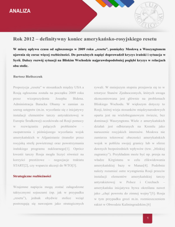 ANALIZA Rok 2012 – definitywny koniec amerykańsko-rosyjskiego resetu W miarę upływu czasu od ogłoszonego w 2009 roku „resetu”, pomiędzy Moskwą a Waszyngtonem ujawnia się coraz więcej rozbieżności. Do poważnych napięć doprowadził kryzys irański i sytuacja w Syrii. Dalszy rozwój sytuacji na Bliskim Wschodzie najprawdopodobniej pogłębi kryzys w relacjach obu stolic. Bartosz Bieliszczuk Propozycja „resetu” w stosunkach między USA a rywali. W mniejszym stopniu przejawia się to w Rosją ogłoszona została na początku 2009 roku retoryce Stanów Zjednoczonych, których uwaga przez Bidena. skoncentrowana jest głównie na problemach Administracja Baracka Obamy w zamian za Bliskiego Wschodu. W większym dotyczy to szereg ustępstw (m.in. wycofanie się z inicjatywy Rosji, której wizja stosunków międzynarodowych instalacji elementów tarczy antyrakietowej w oparta jest na wielobiegunowym świecie, bez Europie Środkowej) oczekiwała od Rosji pomocy dominacji Waszyngtonu. Wiele z amerykańskich w działań wiceprezydenta rozwiązaniu Josepha palących problemów – jest odbieranych na Kremlu jako zaopatrzenia i późniejszego wycofania wojsk naruszenie rosyjskich interesów. Moskwa nie amerykańskich w Afganistanie (transfer przez zamierza tolerować obecności amerykańskich rosyjską strefę powietrzną) oraz powstrzymania wojsk w pobliżu swojej granicy lub w sferze irańskiego programu nuklearnego[1]. Oprócz dawnych bezpośrednich wpływów (tzw. „bliskiej kwestii tarczy Rosja mogła liczyć również na zagranicy”). Przykładem może być np. presja na korzyści władze prestiżowe – negocjacje traktatu START[2], czy wsparcie akcesji do WTO[3]. Kirgistanu w celu zlikwidowania amerykańskiej bazy w Manas[4]. Podobnie należy rozumieć ostre wystąpienia Rosji przeciw Strategiczne rozbieżności instalacji elementów antyrakietowej w amerykańskiej Polsce i tarczy Czechach – Wzajemne napięcia mogą zostać załagodzone amerykańska inicjatywa bywa określana nawet taktycznymi sojuszami (np. jak w przypadku jako „chęć powrotu do zimnej wojny”[5]. Rosja „resetu”), w tym przypadku grozi m.in. rozmieszczeniem jednak obydwie stolice wciąż postrzegają się nawzajem jako strategicznych rakiet w Obwodzie Kaliningradzkim.[6] 1 ANALIZA Irański program nuklearny nuklearnego[9]. W poinformował Dla Stanów Zjednoczonych jednym najpoważniejszych z problemów o lutym zaś wznowieniu Teheran współpracy techniczno-wojskowej z Rosją[10] - wspólny kontrakt na dostawy rakiet S-300 został międzynarodowych od lat pozostaje irański wstrzymany po ogłoszeniu program nuklearny. Waszyngton nie ukrywał Wcześniej, w 2007 zresztą, iż instalacja tarczy antyrakietowej w Atomstrojeksport wybudował w Iranie dwa bloki Europie Środkowo-Wschodniej wiążę się z elektrowni atomowej – strona rosyjska liczyła na potencjalnym kolejne kontrakty w tej dziedzinie[12]. Teheran i zagrożeniem pojedynczymi współpracują „resetu”[11]. roku rakietami ze strony Teheranu. W związku z Moskwa też polityką „resetu”, Amerykanie pokładali nadzieje energetyki na pomoc Rosji w rozwiązaniu kwestii programu benzyny rosyjskiego ŁUKoilu)[13]. konwencjonalnej na rosyjski płaszczyźnie (m.in. dostawy atomowego. Odpowiedź Moskwy nie była jednak jednoznaczna. Początkowo zaostrzyła ona swoje wypowiedzi wobec polityki Powstanie w Syrii Ahmuda z Poważny kryzys w stosunkach na linii Moskwa- niektórych kontraktów z Teheranem (m.in. Waszyngton wywołało również powstanie w Syrii związanych z programem nuklearnym oraz i jego brutalna pacyfikacja przez reżim Baszara wojskowych). al-Assada. Rosja dwukrotnie (wraz z Chinami) Ahmadineżada, wycofując Rosja się również poparła również międzynarodowe sankcje nakładane na Iran[7]. blokowała w Radzie Bezpieczeństwa ONZ rezolucję potępiającą władze w Damaszku. Jednak już w połowie 2011 roku strona rosyjska [14] wznowiła kontrakty energetyczne z Teheranem Zgromadzeniu Ogólnym ONZ Moskwa również (dostawy ropy i gazu, budowa elektrowni była przeciw rezolucji[15]. Ponadto w styczniu atomowej). bieżącego roku rosyjskie okręty wojenne złożyły Pomimo wsparcia Zjednoczonych Kreml ekonomiczne i dla poprzez polityczne Stanów poparcie w Podczas Syrii podobnego wizytę. głosowania Moskwa w również osłabiał demonstracyjnie oświadczyła, iż sprzedaje i nadal międzynarodową presję na irańskie rządy[8]. W będzie sprzedawać al-Assadowi broń[16]. W styczniu 2012 roku Moskwa otwarcie już lutym Syrię odwiedził szef rosyjskiej dyplomacji sprzeciwiła się nałożeniu sankcji na Iran – nawet Siergiej Ławrow oraz – co znamienne – szef w przypadku kontynuowania przezeń programu Służby Wywiadu Zagranicznego, 2 Michaił ANALIZA Fradkow[17]. Poparcia Damaszkowi udzielił sprawą jego śmierci (na urzędników tych również Teheran[18]. nałożono sankcje wizowe). Rosja odpowiedziała własną „czarną listą” i opublikowała raport nt. Na postawę Rosji wpływ mają czynniki zarówno łamania geopolityczne jak i ekonomiczne. Oprócz dostaw Zjednoczone[22]. praw człowieka przez Stany uzbrojenia (bieżący kontrakt ma wynosić ok. 6 mld dol.)[19] Syria sojusznikiem pozostaje Rosji w rejonie ważnym Źródłem wzajemnych Morza przebieg wyborów napięć w Rosji, Śródziemnego. W syryjskim Tartus znajduje się parlamentarnych z rosyjska baza morska. Moskwa liczyła również nadchodzących wyborów na Moskwa tradycyjnie uważa współpracę przy budowie elektrowni atomowej[20]. uczciwości wyborów jest 2011 roku również zarówno jak i prezydenckich. za kwestionowanie ingerowanie w „wewnętrzne sprawy”, a zatem jako próbę Waszyngton i Moskwa: nie tylko geopolityka ograniczenia suwerenności przez zachodnie stolice. Gdy po wyborach parlamentarnych z Oprócz opisanej „geopolitycznej” rozgrywki grudnia 2011, Sekretarz Stanu USA, Hilary pomiędzy Moskwą a Waszyngtonem, ważną