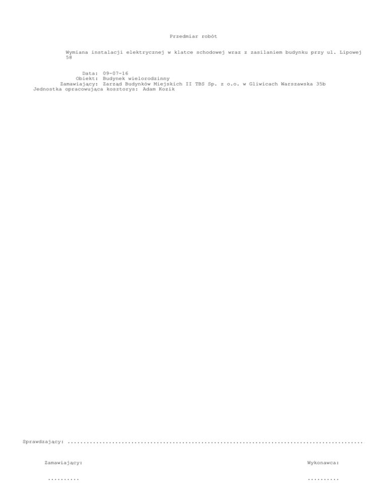 Przedmiar robót Wymiana instalacji elektrycznej w klatce schodowej wraz z zasilaniem budynku przy ul. Lipowej 58 Data: 09-07-16 Obiekt: Budynek wielorodzinny Zamawiający: Zarząd Budynków Miejskich II TBS Sp. z o.o. w Gliwicach Warszawska 35b Jednostka opracowująca kosztorys: Adam Kozik Sprawdzający: ..................................................................................................... Zamawiający: Wykonawca: .......... .......... Lipowa 58 Zuzia (C) DataComp 1994-2008(lic. 3306) strona nr: 2 Przedmiar robót Element, asortyment, rodzaj robót, pozycja przedmiarowa podstawy nakładów 1 Zasilanie budynku i wewnętrzne linie zasilające 1.1 KNR 508/210/2 Przewody kabelkowe w izolacji polwinitowej układane p.t. w gotowych bruzdach bez zaprawienia bruzd, podłoże różne od betonu, YDYp 3x6,0mm2 1.2 KNR 508/210/1 Przewody kabelkowe w izolacji polwinitowej układane p.t. w gotowych bruzdach bez zaprawienia bruzd, podłoże różne od betonu, YDYp 3x2,5mm2 1.3 KNNR 5/715/3 Układanie kabli w budynkach, budowlach lub na estakadach z mocowaniem, kabel do 2,0·kg/m YAKY 4x25 2 Tablice, szafki bez wyposażenia 2.1 KNR 508/404/1 Skrzynka dla zabezpieczeń obwodowych w mieszkaniu S-6 2.2 KNR 508/404/1 Skrzynka dla transformatorów 3 Wyposażenie skrzynek 3.1 KNR 514/515/5 Montaż transformatora 230/24V 3.2 KNR 514/515/4 Montaż automatu schodowego ASO-220 3.3 KNR 514/515/4 Montaż wyłącznika zmierzchowego 3.4 KNNR 5/407/1 Osprzęt modułowy w rozdzielnicach, wyłącznik nadprądowy, 1 biegunowy - S301B10 3.5 KNNR 5/407/1 Osprzęt modułowy w rozdzielnicach, wyłącznik nadprądowy, 1 biegunowy - S301B16 3.6 KNNR 5/407/1 Osprzęt modułowy w rozdzielnicach, wyłącznik nadprądowy, 1 biegunowy - S301B20 3.7 KNR 514/504/7 (1) Montaż liczników energii elektrycznej jednotaryfowych do pomiaru bezpośredniego, do 30·A, 1-pomiarowy, energii czynnej - robocizna 4 Podłączenia 4.1 KNR 508/812/1 Podłączenie przewodów pojedynczych w izolacji polwinitowej pod zaciski lub bolce, przekrój żył do 2,5·mm2 4.2 KNR 508/812/3 Podłączenie przewodów pojedynczych w izolacji polwinitowej pod zaciski lub bolce, przekrój żył do 6.0·mm2 5 Instalacja oświetleniowa 5.1 KNR 508/301/2 Przygotowanie podłoża pod osprzęt instalacyjny, osprzęt przykręcany do kołków plastikowych rodzaj podłoża ceglany 5.2 KNR 508/302/1 Montaż na gotowym podłożu puszek podtynkowych bakelitowych oraz szczękowych do przyborów natynkowo-wtynkowych, puszki bakelitowe Fi·do 60·mm, mocowanie: gips - cement, 1 wylot 5.3 KNR 508/302/5 Montaż na gotowym podłożu puszek podtynkowych bakelitowych oraz szczękowych do przyborów natynkowo-wtynkowych, puszki bakelitowe Fi·do 80·mm, mocowanie: gips - cement, 4 wyloty, przekrój przewodu do 4·mm2 5.4 KNR 508/304/7 Montaż na gotowym podłożu odgałęźników bryzgoszczelnych bakelitowych z podłączeniem przewodów do 2.5·mm2, odgałęźniki przykręcane, 4 wyloty, przewody w powłoce polwinitowej 5.5 KNR 508/307/2 (1) Montaż na gotowym podłożu łączników i przycisków instalacyjnych z podłączeniem, łącznik p/t w puszce instalacyjnej 1-biegunowy 5.6 KNR 508/307/2 (2) Montaż na gotowym podłożu łączników i przycisków instalacyjnych z podłączeniem, łącznik p/t w puszce instalacyjnej 1-biegunowy, przycisk światło podświetlany Jedn. Krot. Ilość m 269,0 m 198,0 m 12,0 szt 11,0 szt 1,0 szt 2,0 szt 1,0 szt 1,0 szt 3,0 szt 22,0 szt 11,0 szt 13,0 szt 60,0 szt 58,0 szt 89,0 szt 39,0 szt 30,0 szt 20,0 szt 6,0 szt 10,0 Wartość jednostkowa Wartość netto Wymiana instalacji elektrycznej w klatce schodowej wraz z zasilaniem budynku przy ul. Lipowej 58 Lipowa 58 Element, asortyment, rodzaj robót, pozycja przedmiarowa podstawy nakładów Zuzia (C) DataComp 1994-2008(lic. 3306) strona nr: 3 Jedn. 5.7 KNR 508/307/2 (2) Montaż na gotowym podłożu łączników i przycisków instalacyjnych z podłączeniem, łącznik p/t w puszce instalacyjnej 1-biegunowy, przycisk dzwonek szt 5.8 KNR 508/308/7 (1) Montaż na gotowym podłożu łączników i przycisków bryzgoszczelnych z podłączeniem, łącznik z tworzywa sztucznego - 1-biegunowy szt 5.9 KNR 514/514/1 Montaż listew zaciskowych i zacisków, listwa zaciskowa LZM-4 szt 5.10 KNR 403/904/2 Wykonanie połączeń przewodów w puszkach i odgałęźnikach n.t. i p.t., bez zadławienia przewodów, przewód pojedynczy lub wtynkowy, przekrój żył do 2,5·mm2, 4 odgałęzienia kpl 5.11 KNR 508/502/5 Przygotowanie podłoża pod oprawy oświetleniowe przykręcane, mocowanie w cegle na 2 kołkach kotwiących kpl 5.12 KNR 508/504/4 Montaż opraw typ WOS60 z kloszem szt 5.13 KNR 508/515/1 Montaż oprawy kanałowej z siatką z tworzywa sztucznego IP44 szt 5.14 KNR 508/515/6 Montaż na gotowym podłożu opraw świetlówkowych PK-109 1x11W szt 5.15 KNR 508/507/2 Oprawa świetlówkowa IP44 2x36W szt 6 Instalacja ochronna 6.1 KNR 508/204/4 Przewody izolowane jednożyłowe LgY16 - połączenia wyrównacze m 6.2 KNR 508/204/5 Przewody izolowane jednożyłowe LgY25 - połączenia wyrównawcze m 6.3 KNR 508/814/2 Montaż końcówek przez zaciskanie, przekrój żył do 16,0 mm2 szt 6.4 KNR 508/614/2 Montaż uziomu rurowego - mechaniczne pogrożenie uziomu m 6.5 KNR 508/602/7 Układanie bednarki uziemiającej w budynkach Fe-Zn o przekroju 60,0 mm2 m 6.6 KNR 508/601/11 montaz wsporników przelotowych na ścianie szt 6.7 KNR 508/618/2 Łączenie pręta Fe-Zn 60,0mm za pomocą złączy skręcanych szt 6.8 KNR 508/620/3 Montaż obejm na rurach o średnicy do 100,0 mm przez skręcanie szt 6.9 KNR 508/601/1 Montaż złączy kontrolnych szt 6.10 KNR 508/404/1 Montaż skrzynki p/t dla złącza kontrolnego szt 7 Pomiary 7.1 KNNR 5/1301/2 Sprawdzanie i pomiar obwodu elektrycznego nn, obwód 3-fazowy pomiar 7.2 KNNR 5/1301/1 Sprawdzanie i pomiar obwodu elektrycznego nn, obwód 1-fazowy pomiar 7.3 KNNR 5/1302/3 Badanie linii kablowej średniego napięcia, niekiego napięcia i sterowniczej, kabel n.n., 4-żyłowy odcinek 7.4 K