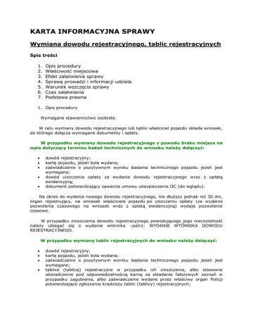 KARTA INFORMACYJNA SPRAWY Wymiana dowodu rejestracyjnego, tablic rejestracyjnych Spis treści 1. 2. 3. 4. 5. 6. 7. Opis procedury Właściwość miejscowa Efekt załatwienia sprawy Sprawę prowadzi i informacji udziela Warunek wszczęcia sprawy Czas załatwiania Podstawa prawna 1. Opis procedury Wymagane stawiennictwo osobiste. W celu wymiany dowodu rejestracyjnego lub tablic właściciel pojazdu składa wniosek, do którego dołącza wymagane dokumenty i opłaty. W przypadku wymiany dowodu rejestracyjnego z powodu braku miejsca na wpis dotyczący terminu badań technicznych do wniosku należy dołączyć: dowód rejestracyjny; kartę pojazdu, jeżeli była wydana; zaświadczenie o pozytywnym wyniku badania technicznego pojazdu jeżeli jest wymagane; dowód uiszczenia opłaty za wydanie dowodu rejestracyjnego wraz z opłatą ewidencyjną; dokument potwierdzający zawarcie umowy ubezpieczenia OC (do wglądu). Na okres do wydania nowego dowodu rejestracyjnego, nie dłuższy jednak niż 30 dni, organ rejestrujący, na wniosek właściciela pojazdu po uiszczeniu opłaty (za wydanie pozwolenia czasowego na wniosek wraz z opłatą ewidencyjną) wydaje pozwolenie czasowe. W przypadku zniszczenia dowodu rejestracyjnego powodującego jego nieczytelność należy ubiegać się o wydanie wtórnika –patrz: WYDANIE WTÓRNIKA DOWODU REJESTRACYJNEGO. W przypadku wymiany tablic rejestracyjnych do wniosku należy dołączyć: dowód rejestracyjny; kartę pojazdu, jeżeli była wydana; zaświadczenie o pozytywnym wyniku badania technicznego pojazdu jeżeli jest wymagane; tablice (tablicę) rejestracyjne w przypadku ich zniszczenia, albo stosowne oświadczenie pod odpowiedzialnością karną za składanie fałszywych zeznań w przypadku zagubienia, albo zaświadczenie wydane przez właściwy organ Policji potwierdzające zgłoszenie kradzieży tablic (tablicy) rejestracyjnych; dowód uiszczenia opłaty za wydanie dowodu rejestracyjnego wraz z opłatą ewidencyjną, tablic rejestracyjnych wraz z opłatą ewidencyjną, nalepek legalizacyjnych, nalepki kontrolnej wraz z opłatą ewidencyjną; dokument potwierdzający zawarcie umowy ubezpieczenia OC (do wglądu). W przypadku wymiany w pojeździe zarejestrowanym, na wniosek właściciela pojazdu, dotychczasowych tablic rejestracyjnych na zalegalizowane tablice rejestracyjne określone rozporządzeniem o rejestracji pojazdów, do wniosku należy załączyć dotychczasowe tablice rejestracyjne. Na okres do wydania nowego dowodu rejestracyjnego, nie dłuższy jednak niż 30 dni, organ rejestrujący, na wniosek właściciela pojazdu po uiszczeniu opłaty (za wydanie pozwolenia czasowego na wniosek i wraz z opłatą ewidencyjną) wydaje pozwolenie czasowe. Uwagi ogólne: Przy składaniu wniosku należy okazać dowód osobisty, w przypadku firm dodatkowo KRS. W przypadku działania przez pełnomocnika należy do wniosku załączyć stosowne pełnomocnictwo wraz z opłatą skarbową (za złożenie dokumentu pełnomocnictwa i poświadczenie zgodności kopii). Zwolnione z opłaty skarbowej są pełnomocnictwa udzielane małżonkowi, wstępnemu, zstępnemu lub rodzeństwu oraz jeżeli mocodawcą jest podmiot określony w art. 7 pkt 1-5 ustawy o opłacie skarbowej. 2. Właściwość miejscowa Organ rejestrujący właściwy ze względu na miejsce zamieszkania (siedzibę). 3. Efekt załatwienia sprawy Otrzymanie dowodu rejestracyjnego, tablic rejestracyjnych. 4. Sprawę prowadzi i informacji udziela Starostwo Powiatowe w Sejnach Adres:16-500 Sejny, ul. 1 Maja 1 (pokój 1) Email: [email protected], [email protected] Telefony: 87 5162052, 87 5173924 Godziny pracy: od poniedziałku do piątku w godz. 7.30-15.30 5. Warunkiem wszczęcia sprawy jest złożenie wniosku Wniosek: Wniosek/ zawiadomienie (załącznik Nr 1 lub Nr 7) Oświadczenie (załącznik Nr 2) Wniosek można złożyć: osobiście 6. Czas załatwiania Niezwłocznie po złożeniu przez właściciela wniosku o wymianę dowodu rejestracyjnego z wymaganymi dokumentami organ dokonuje w dowodzie rejestracyjnym odpowiedniej adnotacji i zamawia nowy dowód rejestracyjny. Na okres wydania nowego dowodu rejestracyjnego, nie dłuższy jednak niż 30 dni organ rejestrujący na wniosek właściciela pojazdu, wydaje pozwolenie czasowe. W przypadku wniosku o wymianę tablic rejestracyjnych dodatkowo niezwłocznie organ wydaje nowe tablice rejestracyjne. Nowy dowód rejestracyjny można odebrać w ciągu 30 dni. Opłaty OPŁATA ZA DOKUMENTY Starostwo Powiatowe w Sejnach Bank Spółdzielczy w Sejnach 91935400070000000022350039 za wydanie dowodu rejestracyjnego: 54.00 PLN opłata ewidencyjna za wydanie dowodu rejestracyjnego: 0.50 PLN za wydanie pozwolenia czasowego na wniosek właściciela: 18.50 PLN opłata ewidencyjna za wydanie pozwolenia czasowego na wniosek właściciela: 0.50 PLN za wydanie nalepek legalizacyjnych: 12.50 PLN za wydanie nalepki kontrolnej: 18.50 PLN opłata ewidencyjna za wydanie nalepki kontrolnej: 0.50 PLN za wydanie tablic rejestracyjnych zwyczajnych na samochód: 80.00 PLN za wydanie tablic rejestracyjnych zwyczajnych na przyczepę: 40.00 PLN za wydanie tablic rejestracyjnych zwyczajnych na motocykl: 40.00 PLN za wydanie tablic rejestracyjnych zwyczajnych ciągnik rolniczy: 40.00 PLN za wydanie tablic rejestracyjnych zwyczajnych motorower: 30.00 PLN opłata ewidencyjna za wydanie zalegalizowanych tablic rejestracyjnych: 0.50 PLN OPŁATA SKARBOWA Urząd Miasta Sejny BS Rutka Tartak PUNKT KASOWY W SEJNACH 04936700070010000595900001 (na dowodzie wpłaty należy określić przedmiot opłaty skarbowej) złożenie dokumentu stwierdzającego udzielenie pełnomocnictwa: 17.00 PLN poświadczenie zgodności kopii -od każdej strony: 5.00 PLN 7. Akty prawne dotyczące sprawy ustawa z dnia 20 czerwca 1997r. – Prawo o ruchu drogowym /Dz. U. z 2012r., poz. 1137 z późn. zm./;rozporządzenie Ministra Infrastruktury z dnia 22 lipca 2002r. w sprawie rejestracji i oznaczania pojazdów /Dz. U. z 2014r., poz. 1522 z pó