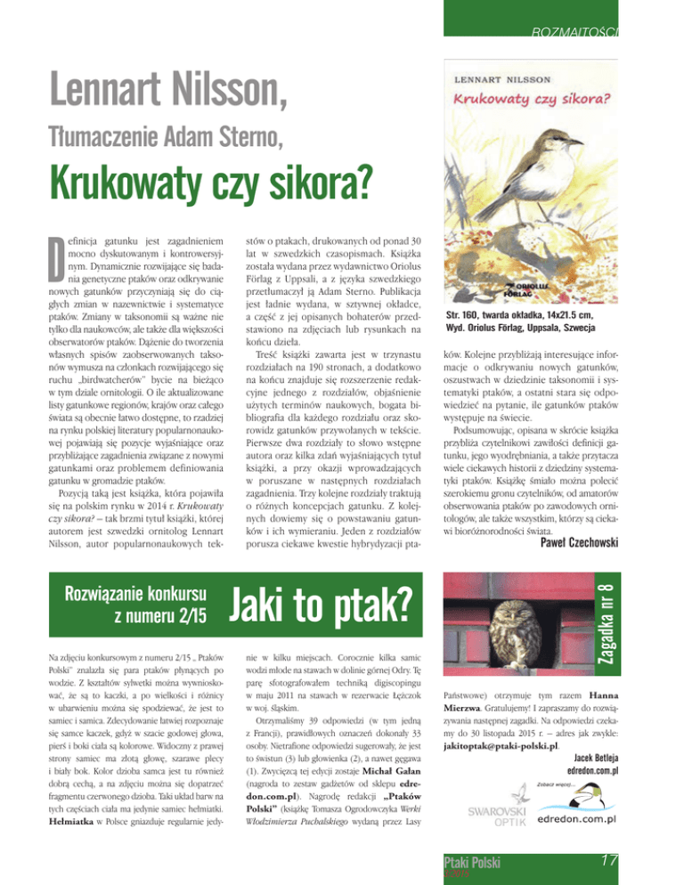 ROZMAITOŚCI Lennart Nilsson, Tłumaczenie Adam Sterno, Krukowaty czy sikora? Rozwiązanie konkursu z numeru 2/15 Na zdjęciu konkursowym z numeru 2/15 „ Ptaków Polski” znalazła się para ptaków płynących po wodzie. Z kształtów sylwetki można wywnioskować, że są to kaczki, a po wielkości i różnicy w ubarwieniu można się spodziewać, że jest to samiec i samica. Zdecydowanie łatwiej rozpoznaje się samce kaczek, gdyż w szacie godowej głowa, pierś i boki ciała są kolorowe. Widoczny z prawej strony samiec ma złotą głowę, szarawe plecy i biały bok. Kolor dzioba samca jest tu również dobrą cechą, a na zdjęciu można się dopatrzeć fragmentu czerwonego dzioba. Taki układ barw na tych częściach ciała ma jedynie samiec hełmiatki. Hełmiatka w Polsce gniazduje regularnie jedy- stów o ptakach, drukowanych od ponad 30 lat w szwedzkich czasopismach. Książka została wydana przez wydawnictwo Oriolus Förlag z Uppsali, a z języka szwedzkiego przetłumaczył ją Adam Sterno. Publikacja jest ładnie wydana, w sztywnej okładce, a część z jej opisanych bohaterów przedstawiono na zdjęciach lub rysunkach na końcu dzieła. Treść książki zawarta jest w trzynastu rozdziałach na 190 stronach, a dodatkowo na końcu znajduje się rozszerzenie redakcyjne jednego z rozdziałów, objaśnienie użytych terminów naukowych, bogata bibliografia dla każdego rozdziału oraz skorowidz gatunków przywołanych w tekście. Pierwsze dwa rozdziały to słowo wstępne autora oraz kilka zdań wyjaśniających tytuł książki, a przy okazji wprowadzających w poruszane w następnych rozdziałach zagadnienia. Trzy kolejne rozdziały traktują o różnych koncepcjach gatunku. Z kolejnych dowiemy się o powstawaniu gatunków i ich wymieraniu. Jeden z rozdziałów porusza ciekawe kwestie hybrydyzacji pta- Str. 160, twarda okładka, 14x21.5 cm, Wyd. Oriolus Förlag, Uppsala, Szwecja ków. Kolejne przybliżają interesujące informacje o odkrywaniu nowych gatunków, oszustwach w dziedzinie taksonomii i systematyki ptaków, a ostatni stara się odpowiedzieć na pytanie, ile gatunków ptaków występuje na świecie. Podsumowując, opisana w skrócie książka przybliża czytelnikowi zawiłości definicji gatunku, jego wyodrębniania, a także przytacza wiele ciekawych historii z dziedziny systematyki ptaków. Książkę śmiało można polecić szerokiemu gronu czytelników, od amatorów obserwowania ptaków po zawodowych ornitologów, ale także wszystkim, którzy są ciekawi bioróżnorodności świata. Paweł Czechowski Jaki to ptak? nie w kilku miejscach. Corocznie kilka samic wodzi młode na stawach w dolinie górnej Odry. Tę parę sfotografowałem techniką digiscopingu w maju 2011 na stawach w rezerwacie Łężczok w woj. śląskim. Otrzymaliśmy 39 odpowiedzi (w tym jedną z Francji), prawidłowych oznaczeń dokonały 33 osoby. Nietrafione odpowiedzi sugerowały, że jest to świstun (3) lub głowienka (2), a nawet gęgawa (1). Zwycięzcą tej edycji zostaje Michał Gałan (nagroda to zestaw gadżetów od sklepu edredon.com.pl). Nagrodę redakcji „Ptaków Polski” (książkę Tomasza Ogrodowczyka Werki Włodzimierza Puchalskiego wydaną przez Lasy Zagadka nr 8 D efinicja gatunku jest zagadnieniem mocno dyskutowanym i kontrowersyjnym. Dynamicznie rozwijające się badania genetyczne ptaków oraz odkrywanie nowych gatunków przyczyniają się do ciągłych zmian w nazewnictwie i systematyce ptaków. Zmiany w taksonomii są ważne nie tylko dla naukowców, ale także dla większości obserwatorów ptaków. Dążenie do tworzenia własnych spisów zaobserwowanych taksonów wymusza na członkach rozwijającego się ruchu „birdwatcherów” bycie na bieżąco w tym dziale ornitologii. O ile aktualizowane listy gatunkowe regionów, krajów oraz całego świata są obecnie łatwo dostępne, to rzadziej na rynku polskiej literatury popularnonaukowej pojawiają się pozycje wyjaśniające oraz przybliżające zagadnienia związane z nowymi gatunkami oraz problemem definiowania gatunku w gromadzie ptaków. Pozycją taką jest książka, która pojawiła się na polskim rynku w 2014 r. Krukowaty czy sikora? – tak brzmi tytuł książki, której autorem jest szwedzki ornitolog Lennart Nilsson, autor popularnonaukowych tek- Państwowe) otrzymuje tym razem Hanna Mierzwa. Gratulujemy! I zapraszamy do rozwiązywania następnej zagadki. Na odpowiedzi czekamy do 30 listopada 2015 r. – adres jak zwykle: [email protected]. Jacek Betleja edredon.com.pl Ptaki Polski 3/2015 17