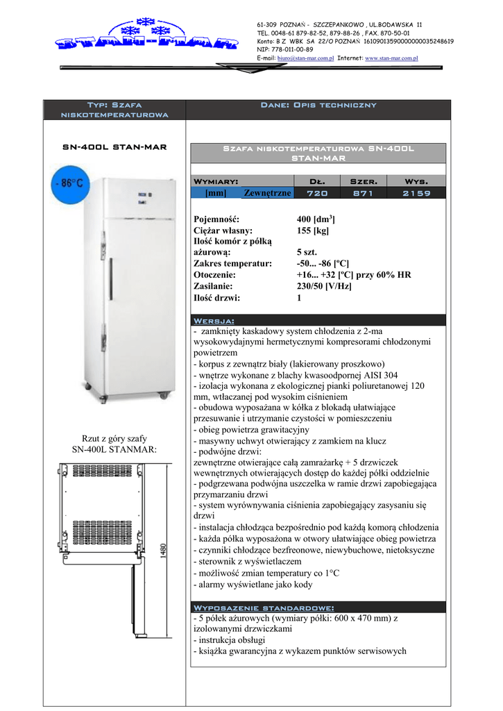 Typ: Szafa niskotemperaturowa Dane: Opis techniczny SN