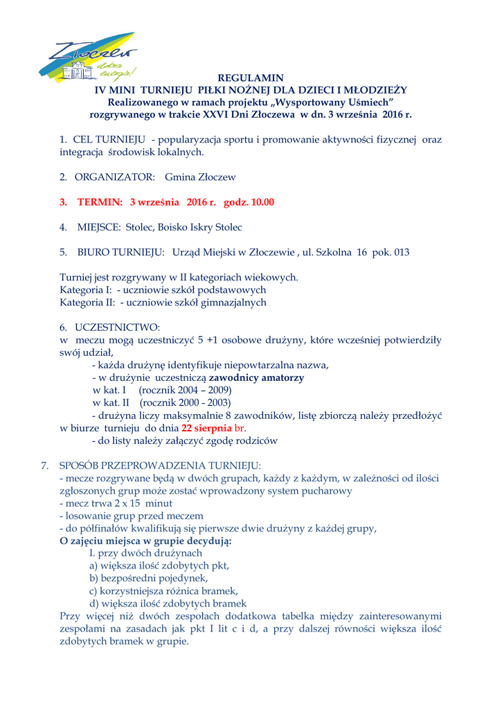 REGULAMIN IV MINI TURNIEJU PIŁKI NOŻNEJ DLA DZIECI I MŁODZIEŻY Realizowanego w ramach projektu „Wysportowany Uśmiech” rozgrywanego w trakcie XXVI Dni Złoczewa w dn. 3 września 2016 r. 1. CEL TURNIEJU - popularyzacja sportu i promowanie aktywności fizycznej oraz integracja środowisk lokalnych. 2. ORGANIZATOR: Gmina Złoczew 3. TERMIN: 3 września 2016 r. godz. 10.00 4. MIEJSCE: Stolec, Boisko Iskry Stolec 5. BIURO TURNIEJU: Urząd Miejski w Złoczewie , ul. Szkolna 16 pok. 013 Turniej jest rozgrywany w II kategoriach wiekowych. Kategoria I: - uczniowie szkół podstawowych Kategoria II: - uczniowie szkół gimnazjalnych 6. UCZESTNICTWO: w meczu mogą uczestniczyć 5 +1 osobowe drużyny, które wcześniej potwierdziły swój udział, - każda drużynę identyfikuje niepowtarzalna nazwa, - w drużynie uczestniczą zawodnicy amatorzy w kat. I (rocznik 2004 – 2009) w kat. II (rocznik 2000 - 2003) - drużyna liczy maksymalnie 8 zawodników, listę zbiorczą należy przedłożyć w biurze turnieju do dnia 22 sierpnia br. - do listy należy załączyć zgodę rodziców 7. SPOSÓB PRZEPROWADZENIA TURNIEJU: - mecze rozgrywane będą w dwóch grupach, każdy z każdym, w zależności od ilości zgłoszonych grup może zostać wprowadzony system pucharowy - mecz trwa 2 x 15 minut - losowanie grup przed meczem - do półfinałów kwalifikują się pierwsze dwie drużyny z każdej grupy, O zajęciu miejsca w grupie decydują: I. przy dwóch drużynach a) większa ilość zdobytych pkt, b) bezpośredni pojedynek, c) korzystniejsza różnica bramek, d) większa ilość zdobytych bramek Przy więcej niż dwóch zespołach dodatkowa tabelka między zainteresowanymi zespołami na zasadach jak pkt I lit c i d, a przy dalszej równości większa ilość zdobytych bramek w grupie. Półfinały rozegrane zostaną w/g zasady: Zwycięzcy grup z drużynami zajmującymi II miejsca w grupach przeciwnych. Zwycięzcy półfinałów rozegrają mecz o I miejsce, pokonani o m-ce III. W meczach półfinałowych, finałowych w przypadku remisu zarządzona zostanie dogrywka 5 minut – przy dalszym remisie rzuty karne (po trzy). Miejsca V - XII ustala się na podstawie bilansu punktowego z eliminacji W grupach eliminacyjnych za zwycięstwo przyznaje się 3, za remis 1 , porażka 0 8. PRZEPISY TURNIEJU Turniej rozgrywany będzie na boisku ISKRY STOLEC w Stolec, w bezpośrednim sąsiedztwie Szkoły Podstawowej w Stolcu. - bramki jak do piłki ręcznej -rzut karny (7m) -pole karne jak do piłki ręcznej - rzut autowy wykonywany jest nogą z linii bocznej , a rzut rożny z narożnika boiska - czas na wprowadzenie piłki do gry przez bramkarza, oraz wykonanie rzutów ( po za rzutem karnym ) wynosi 4 sekundy. Za przekroczenie czasu posiadania piłki przez bramkarza w polu karnym przyznany zostanie rzut wolny pośredni dla drużyny przeciwnej z linii pola karnego, a w pozostałych przypadkach z miejsca gdzie znajdowała się piłka. - po przejęciu piłki przez bramkarza z gry nie może on zdobyć bramki zagrywając piłkę ręką - drużyna występuje na boisku w liczbie 6 zawodników, w tym bramkarz - dokonywanie zmian systemem hokejowym w wydzielonej strefie zmian z zasadą, że zawodnik wchodzący może wejść na boisko po opuszczeniu go przez zawodnika schodzącego- za przekroczenia tego przepisu drużyna przeciwna wykona rzut wolny pośredni - odległość muru od piłki przy wykonywaniu rzutów wolnych, autowych, rożnych6m - za nie sportowe zachowanie się, zawodnik zostanie ukarany karą czasową 1 min, - za grę brutalną lub wybitnie nie sportowe zachowanie się, wykluczeniem z turnieju (cz.k.) a drużyna gra w osłabieniu przez 2 minuty Drużyna grająca w osłabieniu może natychmiast uzupełnić swój skład po utraceniu bramki zawsze tylko o jednego zawodnika. - drużyny występują w miękkim obuwiu sportowym (zakaz używania korków piłkarskich) 9. Organizatorzy nie ponoszą odpowiedzialności za zaginiony sprzęt lub rzeczy osobiste. 10. Organizatorzy zapewniają napoje i przekąski oraz dowóz autobusem z opiekunem ze Złoczewa do Stolca i ze Stolca do Złoczewa. 11. Uczestnicy turnieju biorą w nich udział na odpowiedzialność zgłaszających. Wskazane jest ubezpieczenie się na własny koszt od następstw nieszczęśliwych wypadków. 12. Organizator zapewnia pierwszą pomoc medyczną. 13. DRUŻYNY OTRZYMUJĄ: Medale za miejsca 1-3 w każdej z kategorii. Statuetka: król strzelców każdej z kategorii. Nagrody ufundowane przez sponsorów lub patronów turnieju. 14.W sprawach nieobjętych w niniejszym regulaminie decyduje Organizator. Organizator Burmistrz Miasta Złoczewa Jadwiga Sobańska