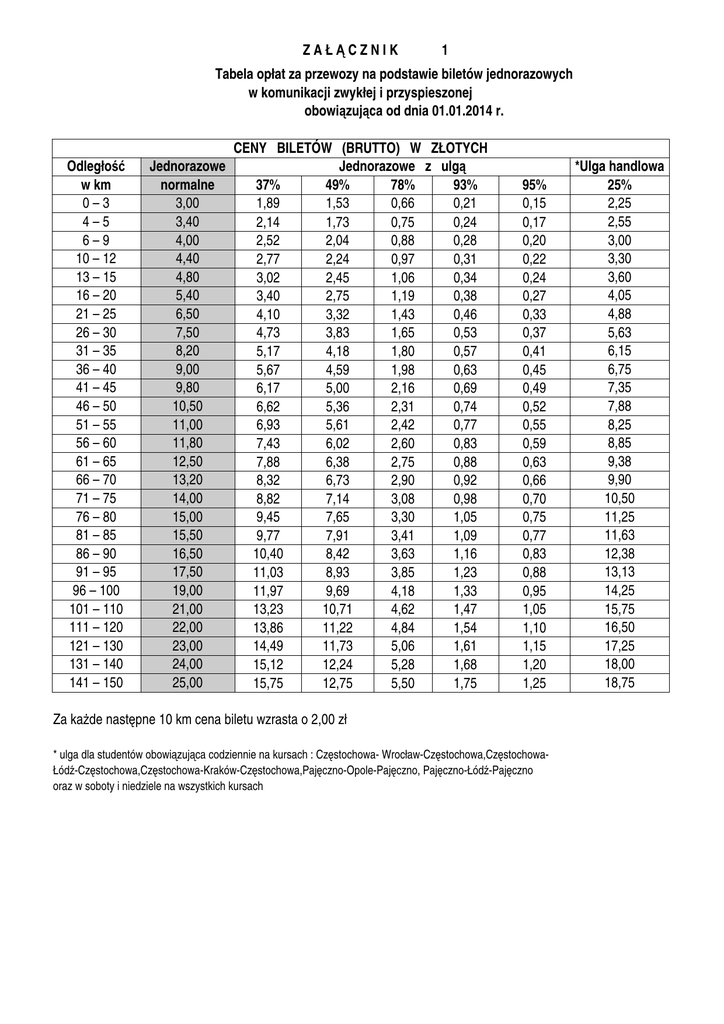 ZAŁĄCZNIK 1 Tabela opłat za przewozy na podstawie biletów jednorazowych w komunikacji zwykłej i przyspieszonej obowiązująca od dnia 01.01.2014 r. Odległość w km 0–3 4–5 6–9 10 – 12 13 – 15 16 – 20 21 – 25 26 – 30 31 – 35 36 – 40 41 – 45 46 – 50 51 – 55 56 – 60 61 – 65 66 – 70 71 – 75 76 – 80 81 – 85 86 – 90 91 – 95 96 – 100 101 – 110 111 – 120 121 – 130 131 – 140 141 – 150 CENY BILETÓW (BRUTTO) W ZŁOTYCH Jednorazowe Jednorazowe z ulgą normalne 37% 49% 78% 93% 3,00 1,89 1,53 0,66 0,21 3,40 2,14 1,73 0,75 0,24 4,00 2,52 2,04 0,88 0,28 4,40 2,77 2,24 0,97 0,31 4,80 3,02 2,45 1,06 0,34 5,40 3,40 2,75 1,19 0,38 6,50 4,10 3,32 1,43 0,46 7,50 4,73 3,83 1,65 0,53 8,20 5,17 4,18 1,80 0,57 9,00 5,67 4,59 1,98 0,63 9,80 6,17 5,00 2,16 0,69 10,50 6,62 5,36 2,31 0,74 11,00 6,93 5,61 2,42 0,77 11,80 7,43 6,02 2,60 0,83 12,50 7,88 6,38 2,75 0,88 13,20 8,32 6,73 2,90 0,92 14,00 8,82 7,14 3,08 0,98 15,00 9,45 7,65 3,30 1,05 15,50 9,77 7,91 3,41 1,09 16,50 10,40 8,42 3,63 1,16 17,50 11,03 8,93 3,85 1,23 19,00 11,97 9,69 4,18 1,33 21,00 13,23 10,71 4,62 1,47 22,00 13,86 11,22 4,84 1,54 23,00 14,49 11,73 5,06 1,61 24,00 15,12 12,24 5,28 1,68 25,00 15,75 12,75 5,50 1,75 95% 0,15 0,17 0,20 0,22 0,24 0,27 0,33 0,37 0,41 0,45 0,49 0,52 0,55 0,59 0,63 0,66 0,70 0,75 0,77 0,83 0,88 0,95 1,05 1,10 1,15 1,20 1,25 Za kaŜde następne 10 km cena biletu wzrasta o 2,00 zł * ulga dla studentów obowiązująca codziennie na kursach : Częstochowa- Wrocław-Częstochowa,CzęstochowaŁódź-Częstochowa,Częstochowa-Kraków-Częstochowa,Pajęczno-Opole-Pajęczno, Pajęczno-Łódź-Pajęczno oraz w soboty i niedziele na wszystkich kursach *Ulga handlowa 25% 2,25 2,55 3,00 3,30 3,60 4,05 4,88 5,63 6,15 6,75 7,35 7,88 8,25 8,85 9,38 9,90 10,50 11,25 11,63 12,38 13,13 14,25 15,75 16,50 17,25 18,00 18,75