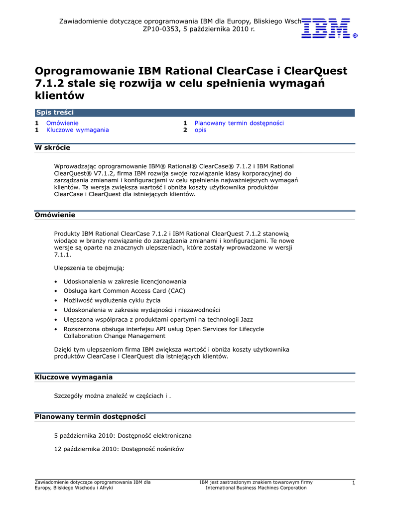 Zawiadomienie dotyczące oprogramowania IBM dla Europy, Bliskiego Wschodu i Afryki ZP10-0353, 5 października 2010 r. Oprogramowanie IBM Rational ClearCase i ClearQuest 7.1.2 stale się rozwija w celu spełnienia wymagań klientów Spis treści 1 1 Omówienie Kluczowe wymagania 1 2 Planowany termin dostępności opis W skrócie Wprowadzając oprogramowanie IBM® Rational® ClearCase® 7.1.2 i IBM Rational ClearQuest® V7.1.2, firma IBM rozwija swoje rozwiązanie klasy korporacyjnej do zarządzania zmianami i konfiguracjami w celu spełnienia najważniejszych wymagań klientów. Ta wersja zwiększa wartość i obniża koszty użytkownika produktów ClearCase i ClearQuest dla istniejących klientów. Omówienie Produkty IBM Rational ClearCase 7.1.2 i IBM Rational ClearQuest 7.1.2 stanowią wiodące w branży rozwiązanie do zarządzania zmianami i konfiguracjami. Te nowe wersje są oparte na znacznych ulepszeniach, które zostały wprowadzone w wersji 7.1.1. Ulepszenia te obejmują: • Udoskonalenia w zakresie licencjonowania • Obsługa kart Common Access Card (CAC) • Możliwość wydłużenia cyklu życia • Udoskonalenia w zakresie wydajności i niezawodności • Ulepszona współpraca z produktami opartymi na technologii Jazz • Rozszerzona obsługa interfejsu API usług Open Services for Lifecycle Collaboration Change Management Dzięki tym ulepszeniom firma IBM zwiększa wartość i obniża koszty użytkownika produktów ClearCase i ClearQuest dla istniejących klientów. Kluczowe wymagania Szczegóły można znaleźć w częściach i . Planowany termin dostępności 5 października 2010: Dostępność elektroniczna 12 października 2010: Dostępność nośników Zawiadomienie dotyczące oprogramowania IBM dla Europy, Bliskiego Wschodu i Afryki IBM jest zastrzeżonym znakiem towarowym firmy International Business Machines Corporation 1 Rozpowszechnianie oprogramowania z algorytmem szyfrowania we Francji wymaga zatwierdzenia przez rząd francuski. Funkcje kryptograficzne niniejszego produktu są ograniczone do szyfrowania hasła, procedury uwierzytelniania lub podpisu elektronicznego. Informacje szczegółowe na temat dostępności wersji językowych zamieszczono w oddzielnym dokumencie. opis Produkty IBM Rational ClearCase 7.1.2 i IBM Rational ClearQuest 7.1.2 wspólnie stanowią wiodące w branży rozwiązanie do zarządzania zmianami i konfiguracjami. Te nowe wersje są oparte na znacznych udoskonaleniach, które zostały wprowadzone w wersjach 7.1 i 7.1.1, zapewniając udoskonalenia w zakresie projektowania zespołowego dzięki zwiększonej wydajności i obniżonego kosztu użytkownika. Ulepszenia te obejmują: Udoskonalenia w zakresie licencjonowania: produkty IBM Rational ClearCase 7.1.2 i IBM Rational ClearQuest 7.1.2 wprowadzają rozszerzone opcje licencjonowania w celu najlepszego spełniania potrzeb klientów. Obsługa licencjonowania za pomocą tokenów zapewnia klientom większą elastyczność w zakresie zarządzania zapotrzebowaniem na licencje w cały cyklu projektowania. Obsługa kart Common Access Card (CAC): obsługa kart Common Access Card przez macierzystego klienta ClearCase, a także klienta ClearQuest Web. Możliwość wydłużenia cyklu życia: elastyczne opcje integracji ClearCase/ ClearQuest Web zapewniają możliwość wdrożenia produktów ClearCase i ClearQuest w środowiskach heterogenicznych, obejmujących również kombinację platform typu mainframe i rozproszonych. Produkt ClearQuest 7.1.2 oferuje udoskonalone opcje rozszerzania schematów, aby umożliwić klientom wyświetlanie wyskakujących formularzy w celu lepszego sterowania przepływem pracy w produkcie ClearQuest i zredukowania liczby czynności, jakie muszą zostać wykonane przez użytkownika końcowego. Produktywność rozproszonego zespołu deweloperów: ulepszenia w produkcie ClearQuest Web zapewniają większą wydajność większości transakcji, a także wyższą niezawodność serwera ClearQuest Change Management Server. W produkcie ClearQuest Web wprowadzono także ułatwienia w obsłudze dla użytkowników dzięki użyciu owalnych przycisków wyskakujących, których działanie przypomina klienta ClearQuest. Ulepszona współpraca z produktami opartymi na technologii Jazz: Produkt IBM Rational ClearQuest 7.1.2 udoskonala mostek rozwiązania ClearQuest, który umożliwia powiązanie rekordów produktu ClearQuest z rekordami produktów IBM (TM) Rational Team Concert i IBM Rational Quality Manager. Korzystając z klienta ClearQuest Web, użytkownicy mogą teraz tworzyć łącza do elementów pracy (TM), w produktach Jazz a także przeglądać elementy pracy z produktu Jazz bez opuszczania klienta ClearQuest Web dzięki zaawansowanej funkcji wyświetlania poprzez wskazanie myszą. Rozszerzona obsługa interfejsu API Change Management OSLC: w produkcie IBM Rational ClearQuest 7.1.2 wprowadzono ulepszoną obsługę usług CM Open Services for Lifecycle Collaboration (OSLC) 1.0. Produkt ClearQuest jest obecnie zarówno dostawcą, jak i konsumentem tego interfejsu API. Umożliwia to produktowi ClearQuest 7.1.2 współpracę z dostawcą systemu zarządzania innej firmy, który korzysta z interfejsu API CM OSLC. Ułatwia to wdrażanie produktu ClearQuest w dużych i złożonych organizacjach, które korzystają z wielu repozytoriów ClearQuest lub wielu narzędzi do zarządzania zmianami zgodnymi ze standardem OSLC. Zawiadomienie dotyczące oprogramowania IBM dla Europy, Bliskiego Wschodu i Afryki IBM jest zastrzeżonym znakiem towarowym firmy International Business Machines Corporation 2 Dodatkowe informacje Odnośniki do niektórych wymienionych części nie są zawarte w tej krótkiej wersji komunikatu. W celu uzyskania dalszych informacji i dostępu do tych treści należy zajrzeć do pełnej treści zawiadomienia (w języku angielskim). ZP10-0353 Zasady korzystania Do produktów i usług firmy IBM wymienionych w niniejszym zawiadomieniu i dostępnych w danym kraju mają zastosowan