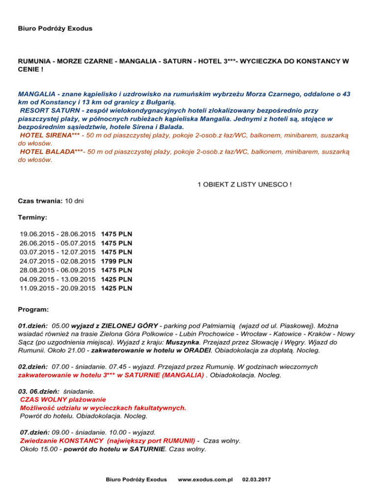 Biuro Podróży Exodus RUMUNIA - MORZE CZARNE - MANGALIA - SATURN - HOTEL 3***- WYCIECZKA DO KONSTANCY W CENIE ! MANGALIA - znane kąpielisko i uzdrowisko na rumuńskim wybrzeżu Morza Czarnego, oddalone o 43 km od Konstancy i 13 km od granicy z Bułgarią. RESORT SATURN - zespół wielokondygnacyjnych hoteli zlokalizowany bezpośrednio przy piaszczystej plaży, w północnych rubieżach kąpieliska Mangalia. Jednymi z hoteli są, stojące w bezpośrednim sąsiedztwie, hotele Sirena i Balada. HOTEL SIRENA*** - 50 m od piaszczystej plaży, pokoje 2-osob.z łaz/WC, balkonem, minibarem, suszarką do włosów. HOTEL BALADA***- 50 m od piaszczystej plaży, pokoje 2-osob.z łaz/WC, balkonem, minibarem, suszarką do włosów. BEZ PRZEJAZDÓW NOCNYCH - NOCLEGI NA TRASIE ! WYCIECZKA DO KONSTANCY I MAMAI W CENIE ! 1 OBIEKT Z LISTY UNESCO ! Czas trwania: 10 dni Terminy: 19.06.2015 - 28.06.2015 26.06.2015 - 05.07.2015 03.07.2015 - 12.07.2015 24.07.2015 - 02.08.2015 28.08.2015 - 06.09.2015 04.09.2015 - 13.09.2015 11.09.2015 - 20.09.2015 1475 PLN 1475 PLN 1475 PLN 1799 PLN 1475 PLN 1425 PLN 1425 PLN Program: 01.dzień: 05.00 wyjazd z ZIELONEJ GÓRY - parking pod Palmiarnią (wjazd od ul. Piaskowej). Można wsiadać również na trasie Zielona Góra Polkowice - Lubin Prochowice - Wrocław - Katowice - Kraków - Nowy Sącz (po uzgodnienia miejsca). Wyjazd z kraju: Muszynka. Przejazd przez Słowację i Węgry. Wjazd do Rumunii. Około 21.00 - zakwaterowanie w hotelu w ORADEI. Obiadokolacja za dopłatą. Nocleg. 02.dzień: 07.00 - śniadanie. 07.45 - wyjazd. Przejazd przez Rumunię. W godzinach wieczornych zakwaterowanie w hotelu 3*** w SATURNIE (MANGALIA) . Obiadokolacja. Nocleg. 03. 06.dzień: śniadanie. CZAS WOLNY plażowanie Możliwość udziału w wycieczkach fakultatywnych. Powrót do hotelu. Obiadokolacja. Nocleg. 07.dzień: 09.00 - śniadanie. 10.00 - wyjazd. Zwiedzanie KONSTANCY (największy port RUMUNII) - Czas wolny. Około 15.00 - powrót do hotelu w SATURNIE. Czas wolny. Biuro Podróży Exodus www.exodus.com.pl 02.03.2017 Obiadokolacja. Nocleg. 08.dzień: śniadanie. CZAS WOLNY plażowanie Możliwość udziału w wycieczkach fakultatywnych. Powrót do hotelu. Obiadokolacja. Nocleg. 09.dzień: 07.00 - śniadanie. 08.00 - wyjazd. Przejazd przez Rumunię. W godzinach wieczornych zakwaterowanie w hotelu w ORADEI. Obiadokolacja za dopłatą. Nocleg. 10.dzień: 07.00 - śniadanie. 07.45 - wyjazd. Przejazd przez Węgry i Słowację. Wjazd do kraju: Muszynka. W godzinach wieczornych rozwiązanie imprezy w ZIELONEJ GÓRZE parking za Palmiarnią. W cenie: autokar: wysokopokładowy, klimatyzacja, WC, video, napoje zimne i gorące (płatne) około 1850 km w jedną stronę noclegi: 9 x hotel*** pokoje 2,3-osobowe z łaz/WC, klimatyzacją, minibarem, suszarką wyżywienie: 9 śniadań + 7 obiadokolacji pilot BP EXODUS ubezpieczenie NW, KL, bagaż podatek VAT Dodatkowe opłaty: 2 obiadokolacje (na życzenie) - 60 zł wejściówki do obiektów turystycznych - około 20 Eur wycieczki fakultatywne (min. 20 uczestników, w nawiasie cena dla dzieci do 12 lat): 1.Warna (Bułgaria) z Mauzoleum króla Władysława Warneńczyka 20 Eur (10 Eur) 2.Delta Dunaju - wycieczka z rejsem statkiem po Parku Narodowym z listy UNESCO 55 Eur (45 Eur) napoje do obiadokolacji Zniżki: dziecko do 10 lat jako 3.osoba w pokoju ma zniżkę 145 zł Uwaga: przy długich przejazdach autokar zatrzymuje się na 15-minutowe postoje każdorazowo po około 4-godzinnej jeździe. Nie bierzemy odpowiedzialności za punkty programu niezrealizowane z przyczyn od nas niezależnych. Biuro Podróży Exodus www.exodus.com.pl 02.03.2017