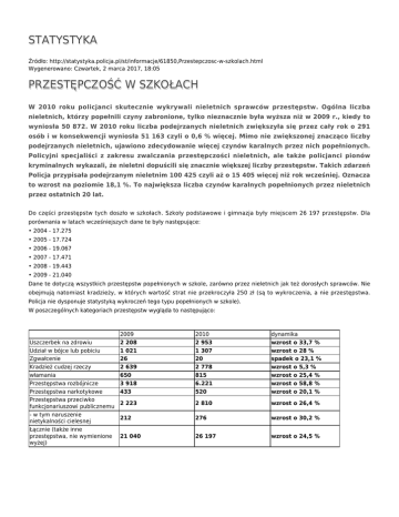 STATYSTYKA Źródło: http://statystyka.policja.pl/st/informacje/61850,Przestepczosc-w-szkolach.html Wygenerowano: Czwartek, 2 marca 2017, 18:05 PRZESTĘPCZOŚĆ W SZKOŁACH W 2010 roku policjanci skutecznie wykrywali nieletnich sprawców przestępstw. Ogólna liczba nieletnich, którzy popełnili czyny zabronione, tylko nieznacznie była wyższa niż w 2009 r., kiedy to wyniosła 50 872. W 2010 roku liczba podejrzanych nieletnich zwiększyła się przez cały rok o 291 osób i w konsekwencji wyniosła 51 163 czyli o 0,6 % więcej. Mimo nie zwiększonej znacząco liczby podejrzanych nieletnich, ujawiono zdecydowanie więcej czynów karalnych przez nich popełnionych. Policyjni specjaliści z zakresu zwalczania przestępczości nieletnich, ale także policjanci pionów kryminalnych wykazali, że nieletni dopuścili się znacznie większej liczby przestępstw. Takich zdarzeń Policja przypisała podejrzanym nieletnim 100 425 czyli aż o 15 405 więcej niż rok wcześniej. Oznacza to wzrost na poziomie 18,1 %. To największa liczba czynów karalnych popełnionych przez nieletnich przez ostatnich 20 lat. Do części przestępstw tych doszło w szkołach. Szkoły podstawowe i gimnazja były miejscem 26 197 przestępstw. Dla porównania w latach wcześniejszych dane te były następujące: • 2004 - 17.275 • 2005 - 17.724 • 2006 - 19.067 • 2007 - 17.471 • 2008 - 19.443 • 2009 - 21.040 Dane te dotyczą wszystkich przestępstw popełnionych w szkole, zarówno przez nieletnich jak też dorosłych sprawców. Nie obejmują natomiast kradzieży, w których wartość strat nie przekroczyła 250 zł (są to wykroczenia, a nie przestępstwa. Policja nie dysponuje statystyką wykroczeń tego typu popełnionych w szkole). W poszczególnych kategoriach przestępstw wygląda to następująco: 2009 2 208 1 021 26 2 639 650 3 918 433 Uszczerbek na zdrowiu Udział w bójce lub pobiciu Zgwałcenie Kradzież cudzej rzeczy włamania Przestępstwa rozbójnicze Przestępstwa narkotykowe Przestępstwa przeciwko 2 223 funkcjonariuszowi publicznemu - w tym naruszenie 212 nietykalności cielesnej Łącznie (także inne przestępstwa, nie wymienione 21 040 wyżej) 2010 2 953 1 307 20 2 778 815 6.221 520 dynamika wzrost o 33,7 % wzrost o 28 % spadek o 23,1 % wzrost o 5,3 % wzrost o 25,4 % wzrost o 58,8 % wzrost o 20,1 % 2 810 wzrost o 26,4 % 276 wzrost o 30,2 % 26 197 wzrost o 24,5 % W szkołach średnich i zawodowych doszło do 2 486 przestępstw.Policjanci w ciągu roku przeprowadzają w szkołach setki akcji prewencyjnych, związanych z aktualnymi zagrożeniami, skierowanych zarówno do uczniów, jak też do rodziców i nauczycieli.Ogólne tendencje przestępczości nieletnich to coraz niższy wiek sprawców dokonujących tych czynów oraz coraz większa liczba przestępstw dokonywanych z dużą dozą agresji. Zauważyć można także rosnącą liczbę sprawców - dziewczyn, zwłaszcza w przestępstwach dokonywanych z agresją.Wykrywalność przestępstw popełnionych w szkołach (czyli ustalenie podejrzanego ) jest bardzo wysoka – w 2010 roku wyniosła 92,8 % i jest nieco wyższa niż rok wcześniej (91,1 %). Oznacza to, że w ponad 9 na każdych 10 przypadków zaistnienia przestępstwa w szkole, jego sprawca nie pozostanie anonimowy. Ocena: 3.1/5 (7) Tweetnij nieletni