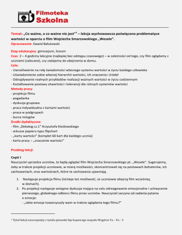 __________________________________________________________________________ Temat: „Co ważne, a co ważne nie jest”1 – lekcja wychowawcza poświęcona problematyce wartości w oparciu o film Wojciecha Smarzowskiego „Wesele”. Opracowanie: Dawid Bałutowski Etap edukacyjny: gimnazjum, liceum Czas: 2 – 4 godziny lekcyjne (najlepiej bez odstępu czasowego) – w zależności od tego, czy film oglądamy z uczniami (zalecane), czy zadajemy do obejrzenia w domu. Cele: - Uwrażliwienie na rolę świadomości własnego systemu wartości w życiu każdego człowieka - Uświadomienie sobie własnej hierarchii wartości, ich znaczenia i źródeł - Odnajdywanie realnych przykładów realizacji ważnych wartości w życiu codziennym - Kształtowanie postawy otwartości i tolerancji dla różnych systemów wartości Metody pracy: - projekcja filmu - pogadanka - dyskusja grupowa - praca indywidualna z kartami wartości - praca w podgrupach - burza mózgów Środki dydaktyczne: - film „Dekalog cz.1” Krzysztofa Kieślowskiego - arkusze papieru typu flipchart - „karty wartości” (komplet 60 kart dla każdego ucznia) - karta pracy – „znaczenie wartości” Przebieg lekcji: Część I Nauczyciel uprzedza uczniów, że będą oglądać film Wojciecha Smarzowskiego pt. „Wesele”. Sugerujemy, żeby w trakcie projekcji uczniowie, w miarę możliwości, skoncentrowali się na postawach bohaterów, ich zachowaniach, oraz wartościach, które te zachowania ujawniają. 1. Następuje projekcja filmu (istnieje też możliwość, ze uczniowie obejrzą film wcześniej, w domach). 2. Po projekcji następuje wstępne dyskusja mająca na celu odreagowanie emocjonalne i uchwycenie pierwszego, globalnego odbioru filmu przez uczniów. Nauczyciel zaczyna od zadania pytania o emocje: - „Jakie emocje towarzyszyły wam w trakcie oglądania tego filmu?” 1 Tytuł lekcji zaczerpnięty z tytułu piosenki hip hopowego zespołu Wzgórze Ya – Pa - 3 Wszystkie pojawiające się emocje zapisujemy na tablicy lub papierze flipchart. W razie konieczności dopytujemy o źródła emocji („Kto wywołał twoją złość?”, „Z jakiego powodu poczułaś smutek?” itp.). Nie oceniamy i nie selekcjonujemy emocji, nawet, jeśli wydają nam się nieadekwatne. 3. Pytamy uczniów o problemy, jakie ten film dotykał, o czym mówił? Jeśli w trakcie dyskusji padnie słowo wartości to świetnie, jeśli nie dodajemy od siebie i uprzedzamy uczniów, że dalszą część zajęć chcemy poświęcić właśnie temu zagadnieniu. Pytamy uczniów o to jak rozumieją słowo „wartości”. Uprzedzamy, że naszą definicję podamy w dalszej części zajęć. Następnie zadajemy pytanie o to, w jaki sposób poznajemy system wartości innych osób. Najprawdopodobniej uczniowie zauważą, że o wartościach mogą mówić świadectwa innych (koleżanka mówi o Wojtku „Na nim zawsze można polegać”), własne deklaracje („jestem szczerą osoba, to dla mnie bardzo ważne”), jak również nasze działania (Bartek pomaga nam w każdej sytuacji gdy go o to prosimy, dotrzymuje słowa, nie zdradza tajemnic = lojalność to jedna z realizowanych przez niego wartości.”) To rozróżnienie będzie wprowadzeniem do dalszych działań. Czas trwania części I: 120 min. (wraz z projekcją filmu) Część II Nauczyciel może powiedzieć: „Nasze wartości i nasze działania, które wskazują na wartości są bardzo ważnymi elementami naszego obrazu siebie i obrazu nas w oczach innych. Każdy z nas chciałby uchodzić za szczerego, oddanego, odważnego, mądrego itp. A te cechy to nic innego jak odwołanie do naszych wartości. Podobnie, kiedy opisujemy innych, zwykle odnosimy się do wartości, np. „On jest taki odważny”, „Ależ ona mądra”, „Chciałabym być taka otwarta jak Gosia” itp. Nawet kiedy opisujemy czyjeś zachowania, gdzieś w tyle głowy mogą one również odnosić się do systemu wartości, np.: „Wojtek jak zwykle nie chciał pożyczyć mi pieniędzy, chociaż wiem, ze ma ich aż nadto” (to sknera = wartości materialne są dla niego ważne); „Ania codziennie przychodzi w nowej kiecce do szkoły” (modnisia = wygląd zewnętrzny jest dla niej wartością); „Bartek kłócił się ze mną na zabój, do końca, chociaż wiedział, że nie ma racji.” (uparciuch = nieustępliwość/ rywalizacja/ posiadanie racji są dla niego wartościami). Uwaga: te interpretacje mogą być (i często są) błędne. Pojedyncze zachowanie wcale nie świadczy ani o naszych cechach charakteru ani o wartościach w które wierzymy. Ale niestety w codziennym życiu społecznym takich właśnie interpretacji dokonujemy bez przerwy (pani źle mnie obsłużyła w sklepie = pani jest niemiła). W psychologii nazywamy ten mechanizm „podstawowym błędem atrybucji”. 1. Nauczyciel zaprasza uczniów do przyjrzenia się Wiesławowi Wojnarowi, bohaterowi granemu w filmie „Wesele” przez Mariana Dziędziela. Na tablicy lub kartce flipchart rysuje poniższa tabelę: WARTOŚCI DEKLAROWANE WARTOŚCI REALIZOWANE Wartość: Trop: Wartość: Trop: Wartość: Trop: Wartość: Trop: Zadanie można wykonać na forum z uczniami lub (ciekawsza wersja) podzielić ich na kilkuosobowe podgrupy (używając jako kryterium kolorowych kamyczków, naklejek, cukierków lub innych drobiazgów). W podgrupach uczniowie opracowują tabelę, a potem dzielą się efektami pracy na forum w formie dyskusji. Poleceni może wyglądać następująco: „Przez najbliższe 10 minut skupimy się na Wiesławie Wojnarze, ojcu Kaśki i zastanowimy się jakie wartości ta postać realizuje, a jakie deklaruje. Macie przed sobą tabele, która składa się z dwóch kolumn. Po prawej stronie znajdują się wartości deklarowane. Chodzi o te wartości, o których Wojnar mówi wprost, że są dla niego ważne, albo które w świadomy sposób chce pokazać swoim zachowaniem. W tabelę wpisujecie nazwę danej wartości, a w kategorii „trop” wpisujecie dowód, 