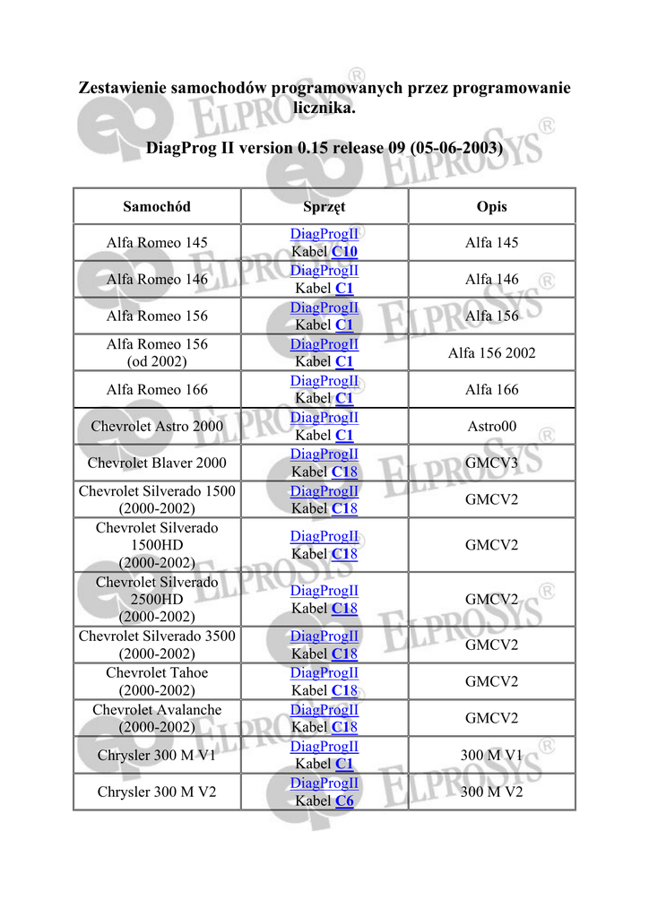 Zestawienie samochodów programowanych przez programowanie licznika. DiagProg II version 0.15 release 09 (05-06-2003) Samochód Alfa Romeo 145 Alfa Romeo 146 Alfa Romeo 156 Alfa Romeo 156 (od 2002) Alfa Romeo 166 Chevrolet Astro 2000 Chevrolet Blaver 2000 Chevrolet Silverado 1500 (2000-2002) Chevrolet Silverado 1500HD (2000-2002) Chevrolet Silverado 2500HD (2000-2002) Chevrolet Silverado 3500 (2000-2002) Chevrolet Tahoe (2000-2002) Chevrolet Avalanche (2000-2002) Chrysler 300 M V1 Chrysler 300 M V2 Sprzęt DiagProgII Kabel C10 DiagProgII Kabel C1 DiagProgII Kabel C1 DiagProgII Kabel C1 DiagProgII Kabel C1 DiagProgII Kabel C1 DiagProgII Kabel C18 DiagProgII Kabel C18 Opis Alfa 145 Alfa 146 Alfa 156 Alfa 156 2002 Alfa 166 Astro00 GMCV3 GMCV2 DiagProgII Kabel C18 GMCV2 DiagProgII Kabel C18 GMCV2 DiagProgII Kabel C18 DiagProgII Kabel C18 DiagProgII Kabel C18 DiagProgII Kabel C1 DiagProgII Kabel C6 GMCV2 GMCV2 GMCV2 300 M V1 300 M V2 Chrysler Neon Chrysler PT Cruiser Chrysler PT Cruiser (od 01/2001) Chrysler Town&Country 2001 Chrysler Vojager 2001 Citroen C5 BCM Citroen C5 Licznik Dodge Ram 2003 Fiat Bravo@52 Fiat Bravo@64 Fiat Bravo@68 Fiat Bravo@100 Fiat Punto II Fiat Scudo Combinato Fiat Stilo Ford Expedition 2002 Ford F150 2002 Ford F250 2002 Ford F350 2002 Ford Explorer 2002 Ford Mondeo 2001 DiagProgII Kabel C1 DiagProgII Kabel C1 DiagProgII Kabel C6 DiagProgII Kabel C6 DiagProgII Kabel C6 DiagProgII Kabel C6 DiagProgII Kabel C5 DiagProgII Kabel C21 DiagProgII Kabel C4 DiagProgII Kabel C5 DiagProgII Kabel C10 DiagProgII Kabel C1 DiagProgII Kabel C11 DiagProgII Kabel C5 DiagProgII Kabel C6 DiagProgII Kabel C6 DiagProgII Kabel C6 DiagProgII Kabel C6 DiagProgII Kabel C6 DiagProgII Kabel C6 DiagProgII Neon PT Cruiser PT Cruiser 2001 T&Q T&Q C5 BCM C5 Licznik Dodge Ram Bravo 52 Bravo 64 Bravo 68 Bravo 100 Punto II Scudo Stilo Explorer F150_2002 F150_2002 F150_2002 Explorer Mondeo GMC Sierra 1500 (2000-2002) GMC Sierra 1500HD (2000-2002) GMC Sierra 2500 (2000-2002) GMC Sierra 2500HD (2000-2002) GMC Sierra 3500 (2000-2002) GMC Yukon (2000-2002) GMC Yukon Denali (2000-2002) Honda Accord V6 Honda Civic 2001 HC12 Honda CRV 2001 HC12 Jaguar S Jaguar XK8 Jeep Grand Cherokee 2002 Lancia Kappa New Lincoln TownCar Mercedes W203 (Klasa C i Klasa G) Stacyjka Mercedes R230 W220 od 06.2001 C215 od 06.2001 R230 - stacyjka Nissan Quest 2001 Nissan Terrano II Kabel C6 DiagProgII Kabel C18 DiagProgII Kabel C18 DiagProgII Kabel C18 DiagProgII Kabel C18 DiagProgII Kabel C18 DiagProgII Kabel C18 DiagProgII Kabel C18 DiagProgII Kabel C1 DiagProgII Kabel C6 DiagProgII Kabel C6 DiagProgII Kabel C1 DiagProgII Kabel C1 DiagProgII Kabel C5 DiagProgII Kabel C1 DiagProgII Kabel C1 GMCV2 GMCV2 GMCV2 GMCV2 GMCV2 GMCV2 GMCV2 Honda Accord Honda CRV Honda CRV Jaguar S Jaguar XK8 GrandCherokee 2002 Lancia Kappa new TownCar DiagProgII Kabel C9 EZS W203 DiagProgII Kabel C8 EZS R230 DiagProgII Kabel C6 DiagProgII Quest Terrano II Nissan X-Trail Peugeot 406 Jaeger Peugeot Jumpi Pontiac Trans Sport Renault Clio Renault Espace BCU Renault Espace licznik Renault Megane V1 Renault Megane V2 Renault Twingo Borg Renault Twingo VDO Sagem V2 (Kangoo,Scenik,Sagem od 06.99) Renault Laguna II (bez komputera) Renault Laguna II (z komputerem) Smart Volvo S60-HC12 Volvo S70 Volvo S70-HC12 Volvo S80 Volvo S80-HC12 Kabel C5 DiagProgII Kabel C18 DiagProgII Kabel C1 DiagProgII Kabel C5 DiagProgII Kabel C6 DiagProgII Kabel C2 DiagProgII Kabel C5 DiagProgII Kabel C5 DiagProgII Kabel C1 DiagProgII Kabel C2 DiagProgII Kabel C10 DiagProgII Kabel C10 DiagProgII Kabel C20 DiagProgII Kabel C2 DiagProgII Kabel C3 DiagProgII Kabel C1 DiagProgII Kabel C6 DiagProgII Kabel C5 DiagProgII Kabel C6 DiagProgII Kabel C5 DiagProgII X-Trail 406 Jaeger Scudo TransSport Clio Espace BCU Espace licznik Meganev1 Meganev2 Twingo Borg Twingo VDO Sagem V2 ---------------------------------------------------Smart Volvo S60-HC12 Volvo S70 Volvo S70-HC12 Volvo S80 Volvo S80-HC12 Kabel C6 Kabel C1 Kabel C2 Kabel C3 Kabel C4 Kabel C5 Kabel C6 Kabel C7 Kabel C8 Kabel C9 Kabel C10 Kabel C11 Kabel C12 Kabel C13 Kabel C14 Kabel C15 Kabel C16 Kabel C17 Kabel C18 Kabel C20 Kabel C21 DiagProg II