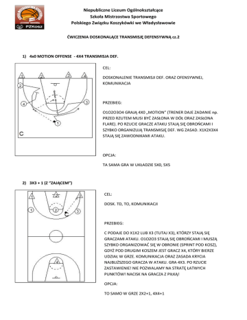 Niepubliczne Liceum Ogólnokształcące Szkoła Mistrzostwa Sportowego Polskiego Związku Koszykówki we Władysławowie ĆWICZENIA DOSKONALĄCE TRANSMISJĘ DEFENSYWNĄ cz.2 1) 4x0 MOTION OFFENSE - 4X4 TRANSMISJA DEF. CEL: DOSKONALENIE TRANSMISJI DEF. ORAZ OFENSYWNEJ, KOMUNIKACJA PRZEBIEG: O1O2O3O4 GRAJĄ 4X0 „MOTION” (TRENER DAJE ZADANIE np. PRZED RZUTEM MUSI BYD ZASŁONA W DÓŁ ORAZ ZASŁONA FLARE). PO RZUCIE GRACZE ATAKU STAJĄ SIĘ OBROOCAMI I SZYBKO ORGANIZUJĄ TRANSMISJĘ DEF. WG ZASAD. X1X2X3X4 STAJĄ SIĘ ZAWODNIKAMI ATAKU. OPCJA: TA SAMA GRA W UKŁADZIE 5X0, 5X5 2) 3X3 + 1 (Z “ZAJĄCEM”) CEL: DOSK. TD, TO, KOMUNIKACJI PRZEBIEG: C PODAJE DO X1X2 LUB X3 (TUTAJ X3), KTÓRZY STAJĄ SIĘ GRACZAMI ATAKU. O1O2O3 STAJĄ SIĘ OBROOCAMI I MUSZĄ SZYBKO ORGANIZOWAD SIĘ W OBRONIE (SPRINT POD KOSZ), GDYŻ POD DRUGIM KOSZEM JEST GRACZ X4, KTÓRY BIERZE UDZIAŁ W GRZE. KOMUNIKACJA ORAZ ZASADA KRYCIA NAJBLIŻSZEGO GRACZA W ATAKU. GRA 4X3. PO RZUCIE ZASTAWIENIE! NIE POZWALAMY NA STRATĘ ŁATWYCH PUNKTÓW! NACISK NA GRACZA Z PIŁKĄ! OPCJA: TO SAMO W GRZE 2X2+1, 4X4+1 Niepubliczne Liceum Ogólnokształcące Szkoła Mistrzostwa Sportowego Polskiego Związku Koszykówki we Władysławowie 3) REBOUNDING WAR DRILL 3X3 CEL: DOSKONALENIE ZASTAWIENIA ORAZ ZBIÓRKI W ATAKU ORAZ OBRONIE, TO, TD, KOMUNIAKCJA PRZEBIEG: C RZUCA DO KOSZA, X1X2X3 STARAJĄ SIĘ ZASTAWID I ZEBRAD PIŁKĘ W OBRONIE. O1O2O3 TAKŻE IDĄ NA ZBIÓRKĘ W ATAKU. JEŚLI ZBIORĄ X1X2X3 TO GRAJĄ NA DRUGI KOSZ A O1O2O3 ORGANIZUJĄ POWRÓT DO OBRONY. JEŚLI PIŁKĘ W ATAKU ZBIORĄ O1O2O3 TO GRAJĄ W ATAKU NA TEN SAM KOSZ. OPCJA: TAK SAMO W GRACH 4X4 ORAZ 5X5 4) REBOUNDING WAR WITH ROTATION DRILL CEL: JAK W DW.8 PRZEBIEG: JAK W DW.8 Z TYM, ŻE GRACZE X1X2X3 WYKONUJĄ PO RZUCIE ROTACJĘ DO ZASTAWIENIA O JEDNEGO GRACZA. Niepubliczne Liceum Ogólnokształcące Szkoła Mistrzostwa Sportowego Polskiego Związku Koszykówki we Władysławowie 5) 1X2 – 2X1 DRILL CEL: DOSKONALENIE TO, ORAZ ROZEGRANIA PRZEWAGI 2X1 PRZEBIEG: USTAWIENIE JAK NA RYS. O1 SPRINTEM KOZŁUJE W CELU ZDOBYCIA KOSZA. X1X2 STARAJĄ SIĘ TO WYBRONID. PO RZUCIE NA KOSZ, O1 SPRINTEM WRACA DO OBRONY W POLE 3SEK., X1X2 ROZGRYWAJĄ PRZEWAGĘ 2X1