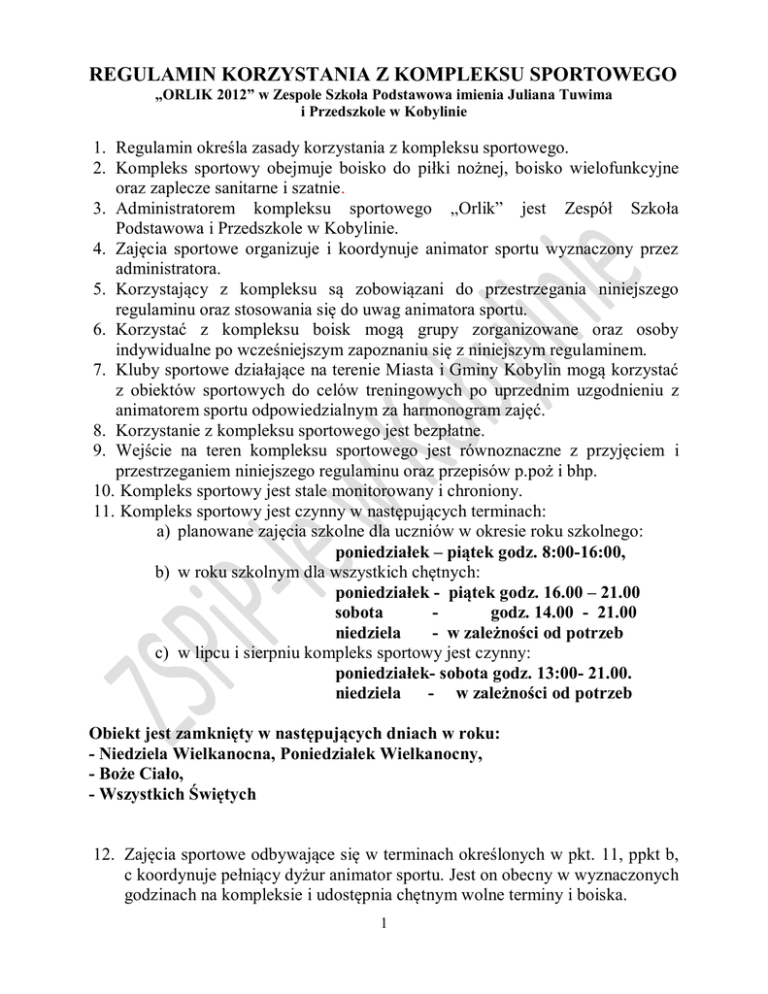 REGULAMIN KORZYSTANIA Z KOMPLEKSU SPORTOWEGO „ORLIK 2012” w Zespole Szkoła Podstawowa imienia Juliana Tuwima i Przedszkole w Kobylinie 1. Regulamin określa zasady korzystania z kompleksu sportowego. 2. Kompleks sportowy obejmuje boisko do piłki nożnej, boisko wielofunkcyjne oraz zaplecze sanitarne i szatnie. 3. Administratorem kompleksu sportowego „Orlik” jest Zespół Szkoła Podstawowa i Przedszkole w Kobylinie. 4. Zajęcia sportowe organizuje i koordynuje animator sportu wyznaczony przez administratora. 5. Korzystający z kompleksu są zobowiązani do przestrzegania niniejszego regulaminu oraz stosowania się do uwag animatora sportu. 6. Korzystać z kompleksu boisk mogą grupy zorganizowane oraz osoby indywidualne po wcześniejszym zapoznaniu się z niniejszym regulaminem. 7. Kluby sportowe działające na terenie Miasta i Gminy Kobylin mogą korzystać z obiektów sportowych do celów treningowych po uprzednim uzgodnieniu z animatorem sportu odpowiedzialnym za harmonogram zajęć. 8. Korzystanie z kompleksu sportowego jest bezpłatne. 9. Wejście na teren kompleksu sportowego jest równoznaczne z przyjęciem i przestrzeganiem niniejszego regulaminu oraz przepisów p.poż i bhp. 10. Kompleks sportowy jest stale monitorowany i chroniony. 11. Kompleks sportowy jest czynny w następujących terminach: a) planowane zajęcia szkolne dla uczniów w okresie roku szkolnego: poniedziałek – piątek godz. 8:00-16:00, b) w roku szkolnym dla wszystkich chętnych: poniedziałek - piątek godz. 16.00 – 21.00 sobota godz. 14.00 - 21.00 niedziela - w zależności od potrzeb c) w lipcu i sierpniu kompleks sportowy jest czynny: poniedziałek- sobota godz. 13:00- 21.00. niedziela - w zależności od potrzeb Obiekt jest zamknięty w następujących dniach w roku: - Niedziela Wielkanocna, Poniedziałek Wielkanocny, - Boże Ciało, - Wszystkich Świętych 12. Zajęcia sportowe odbywające się w terminach określonych w pkt. 11, ppkt b, c koordynuje pełniący dyżur animator sportu. Jest on obecny w wyznaczonych godzinach na kompleksie i udostępnia chętnym wolne terminy i boiska. 1 13. W sezonie jesiennym i wczesnowiosennym, kiedy zajęcia na „Orliku” wymagają sztucznego oświetlenia, grupy zgłaszające się na zajęcia, powinny liczyć co najmniej 10 osób. 14. Możliwe jest użytkowanie boisk po godzinie 21.00, ale tylko w uzgodnieniu z animatorem obiektu. 15. Warunkiem korzystania z obiektu jest posiadanie odpowiedniego obuwia sportowego (na boisku piłkarskim dopuszcza się obuwie z małymi korkami z tworzywa sztucznego oraz obuwie typu halowego). 16. Rozstrzygnięcia dotyczące korzystania z boisk (kompleks sportowy) podejmuje instruktor sportu, który w zależności od sytuacji może: nakazać zmianę obuwia sportowego i stroju, zwrócić uwagę na niewłaściwe, niezgodne z regulaminem zachowanie, nakazać opuszczenie terenu boisk. 17. W celu zapewnienia bezpieczeństwa użytkownikom i korzystania z boisk zgodnie z ich przeznaczeniem zabrania się: a) używania butów piłkarskich na wysokich i metalowych korkach oraz kolców, b) wprowadzania i użytkowania sprzętu innego niż zgodny z przeznaczeniem boisk, na przykład rower, motorower, deskorolka, rolki itp. z wyjątkiem pojazdów używanych przez osoby niepełnosprawne, c) niszczenia urządzeń sportowych i płyty boiska, d) wchodzenia na ogrodzenie i urządzenia sportowe, e) palenia tytoniu i spożywania alkoholu, wszelkiego rodzaju środków odurzających, wnoszenia jedzenia oraz żucia gumy, f) zaśmiecania, wnoszenia opakowań szklanych i metalowych, g) przeszkadzania w zajęciach lub grze, h) zakłócania porządku i używania słów wulgarnych, i) wprowadzania zwierząt – z wyjątkiem przewodników osób niewidomych, j) korzystania z kompleksu sportowego bez zgody animatora sportu, k) przebywania i korzystania z obiektów poza godzinami otwarcia. 18. Zabrania się korzystania z kompleksu sportowego poza godzinami określonymi w punkcie 11. W przypadku złamania tej zasady, administrator obiektu wzywa ochronę lub Policję. 19. Rozstrzygnięcia dotyczące zgodnego z postanowieniami pkt. 15 korzystania z boisk podejmuje instruktor sportu, który w zależności od sytuacji może: a) nakazać zmianę obuwia sportowego i stroju; b) zwrócić uwagę na niewłaściwe, niezgodne z regulaminem zachowanie; c) nakazać opuszczenie terenu boisk; d) zakazać dalszych wstępów na kompleks. 2 20. Administrator kompleksu nie ponosi odpowiedzialności za wypadki powstałe w trakcie korzystania z obiektu. 21. Użytkownicy korzystają z boisk na własną odpowiedzialność i odpowiadają materialnie za wyrządzone szkody na zasadach określonych w odrębnych przepisach. 22. Prowadzący zajęcia jest zobowiązany powiadomić administratora o każdym zaistniałym wypadku. 23. Osoby do 15-go roku życia mogą korzystać z kompleksu boisk jedynie w obecności i pod nadzorem osób dorosłych (rodzic, instruktor, trener, nauczyciel). Opiekun opuszcza obiekt ostatni po wyjściu całej grupy, za którą jest odpowiedzialny. 24. Korzystający z obiektu są zobowiązani do bezwzględnego przestrzegania regulaminu, przepisów ppoż. i bhp, a w szczególności do uwag animatora sportu. 25. Za rzeczy pozostawione w szatni i na boiskach administrator obiektu nie ponosi odpowiedzialności. 26. W sytuacji niekorzystnych warunków atmosferycznych o korzystaniu z kompleksu decyduje animator sportu. 27. Użytkownicy kompleksu mogą korzystać z pomieszczeń szatni w porozumieniu z animatorem. 28. Za zniszczenia powstałe w czasie korzystania z boisk odpowiedzialność materialną ponoszą osoby korzystające. 29. Wyposażenie i sprzęt sportowy znajdujący się na obiekcie należy użytkować zgodnie z przeznaczeniem. 30. Dopuszcza się możliwość rezerwacji korzystania z boiska u animatora sportu, który ustala harmonogram imprez oraz rozkład treningów i rozgrywek przeprowadzanych na terenie kompleksu sportowego. 31. Uwagi dotyczące funkcjono